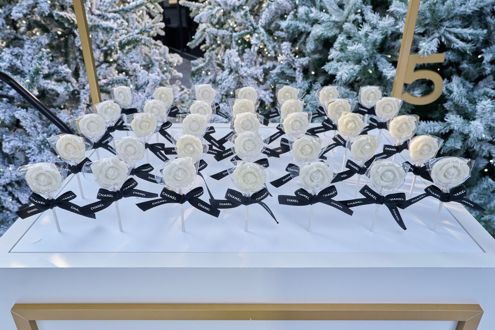 シャネルのロゴやスターで飾られた「The magical house(魔法の家)」のゲートをくぐると、そこにはホリデームードあふれる銀世界。雪化粧のモミの木が広がる森の中を進むと、ウェルカムギフトのキャンディをゲット。シャネルを象徴する花、カメリアに象られたホワイトのキャンディはフェスティブな高揚感に包まれます。