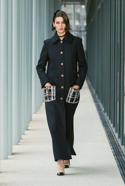 アーティスティック ディレクターのヴィルジニー?ヴィアール(Virginie Viard)が手掛ける今回のメティエダールコレクションは、都会的で洗練されたスタイルの随所に、職人たちが技巧を凝らした装飾が施されている。ファーストルックをはじめとするシルバーのスパンコール刺繍はアトリエ モンテックスが手掛けたもので、le19Mの白い系を張り巡らせたような外観からインスピレーションを得ているという。