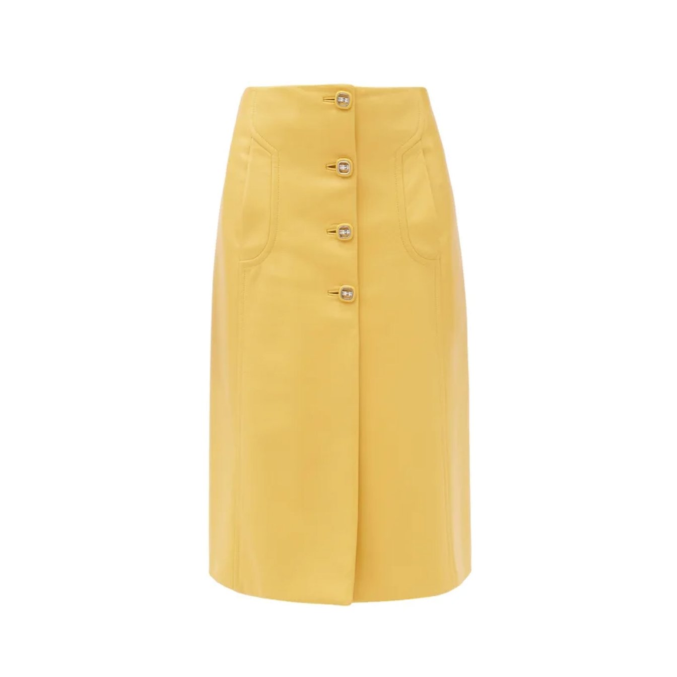 フレッシュなレモンイエローが鮮やかなハイウエストの膝下丈スカートは「プラダ(PRADA)」から。今シーズンのブランドテーマであるアンドロジナスさを反映した一枚は、まさしくアンリアリスティックな美しさが魅力的。シンプルなタートルネックと上品に合わせるのがオススメ。