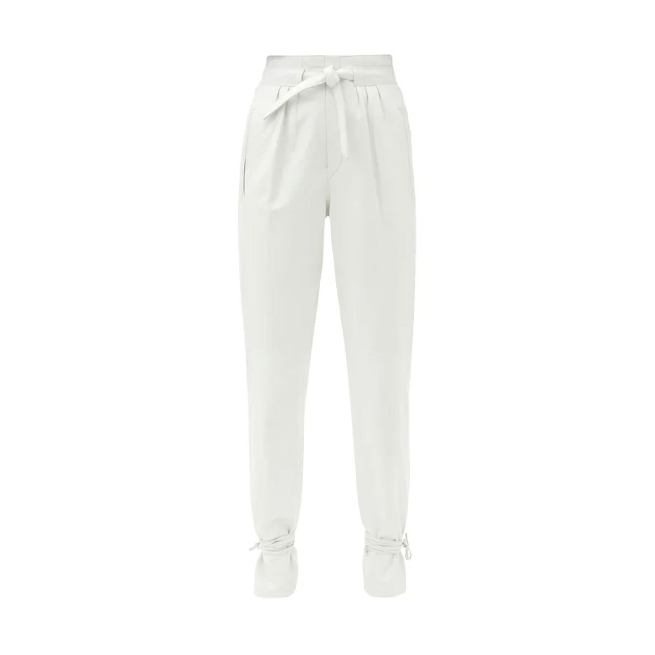 スタイリングに存在感を差し込みたいのであればホワイトのレザーパンツをチョイスして。「イザベル マラン(ISABEL MARANT)」のレザーパンツはクリーンホワイトレザーのみを使用。ウエスト部分と裾部分に配されたタイでシルエットに動きをつければ多様なスタイリングを楽しめます。