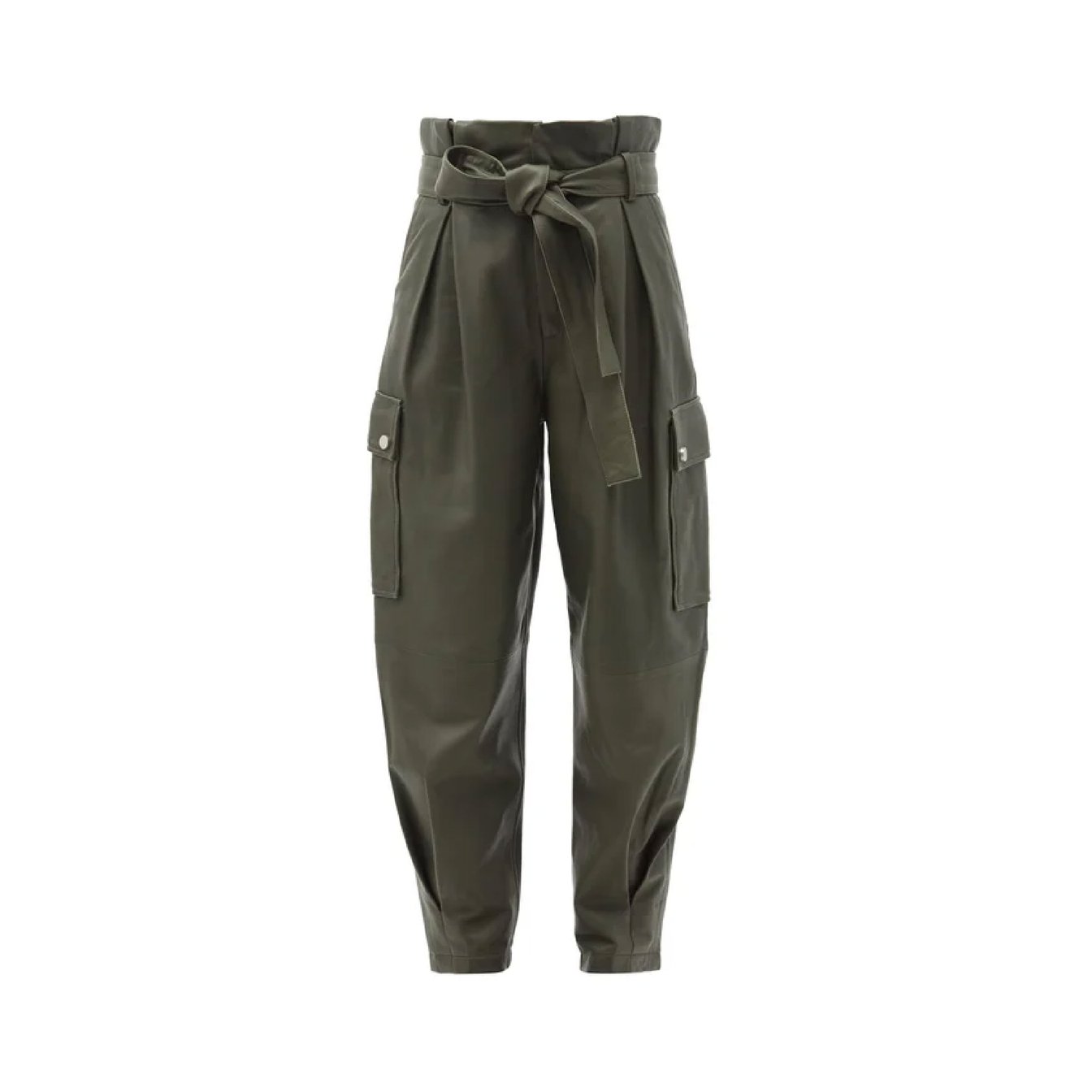 「レッド ヴァレンティノ(RED VALENTINO)」のカーキグリーンパンツは、一見レザーとは思えないほどの複雑なパターンとしなやかなシルエット。柔らかなナッパレザーで作られたハイライズペーパーバッグウエストとリボンベルト、そして足首で窄むシルエットがレザーパンツで作る美脚を叶えます。