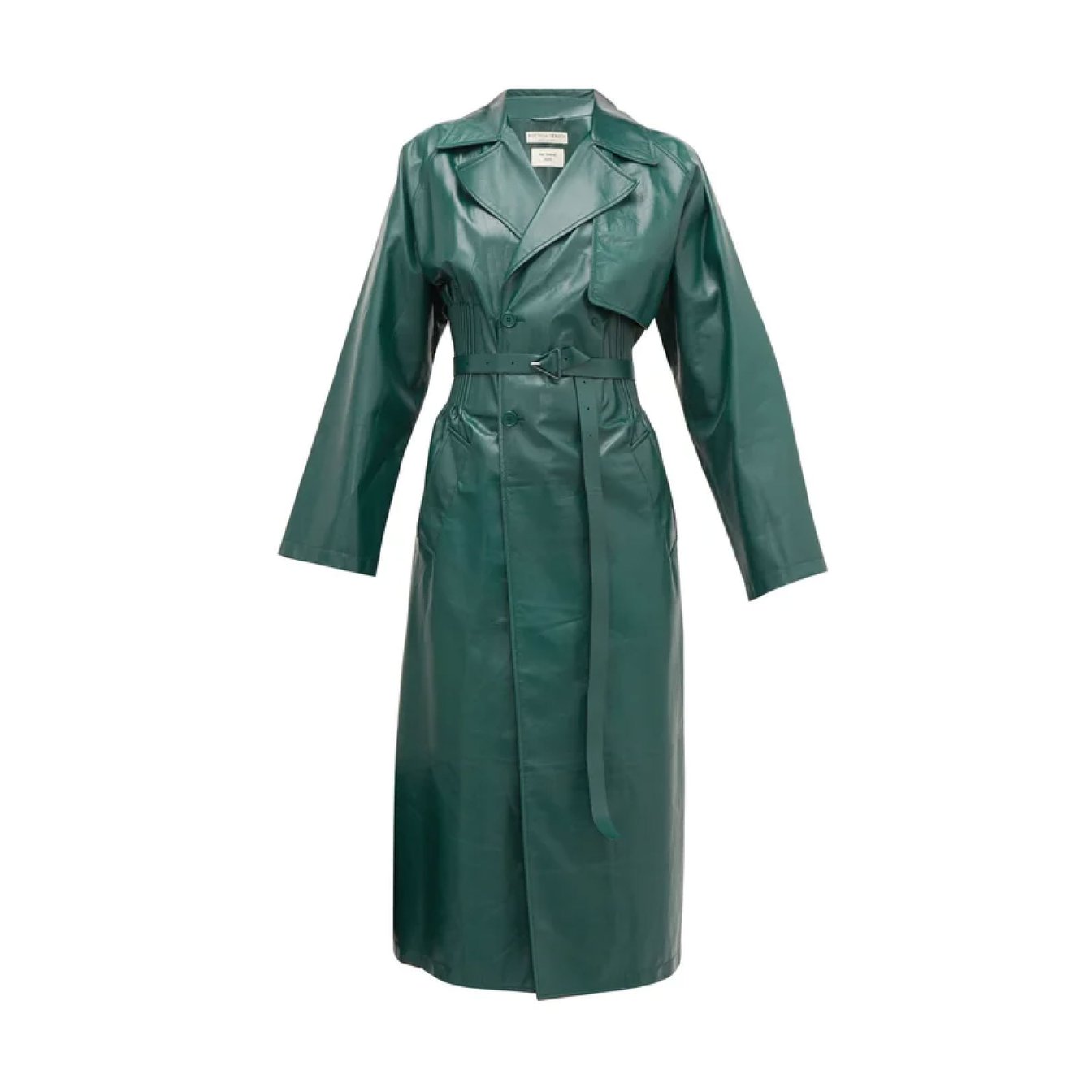 レザーのロングトレンチコートは永遠の憧れ。一方でハード過ぎてなかなか手が出せないウエアの印象も。だったら「ボッテガ?ヴェネタ(BOTTEGA VENETA)」の打ち出す深みのあるグリーントーンのコートはいかがでしょう?同配色の潔さとは裏腹に、ウエストラインを強調するフェミニンなシルエットが美しい一着です。