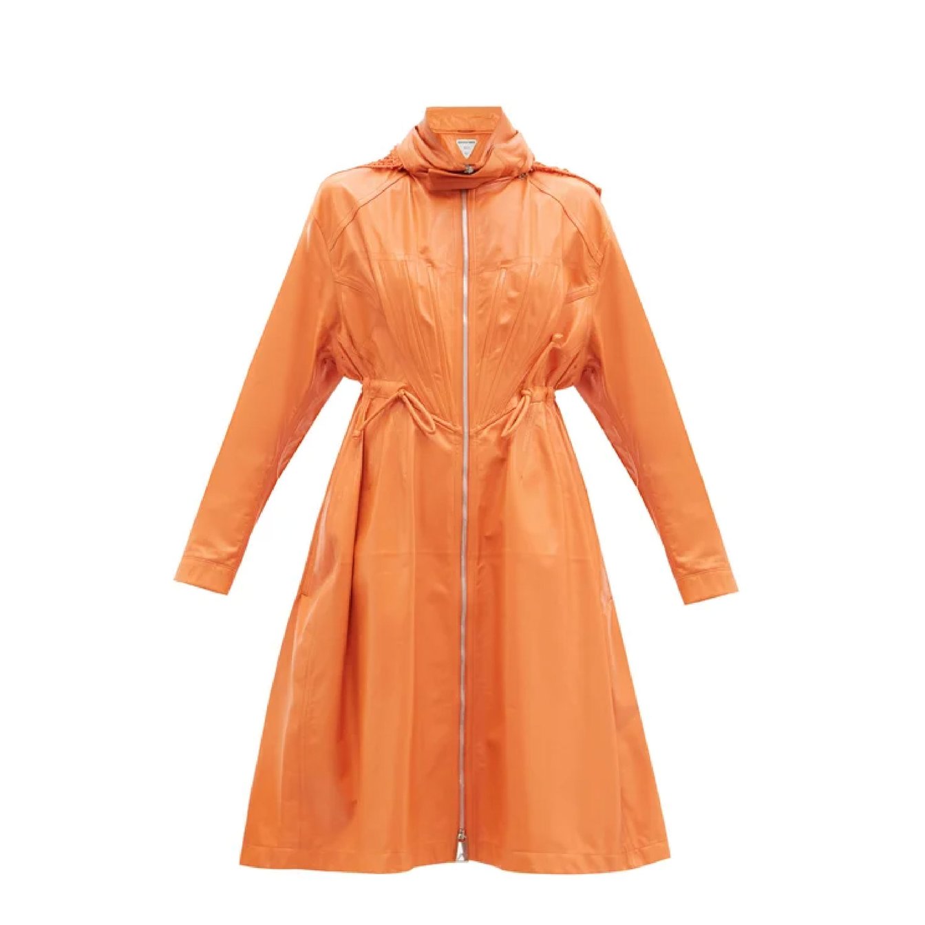 ライトオレンジが目を引く「ボッテガ?ヴェネタ(BOTTEGA VENETA)」のコートにはしなやかなラムスキンが使用されています。コケティッシュだけれど美しいドロップショルダーシルエットに加え、 取り外し可能なマクラメニットのフードが個性的。