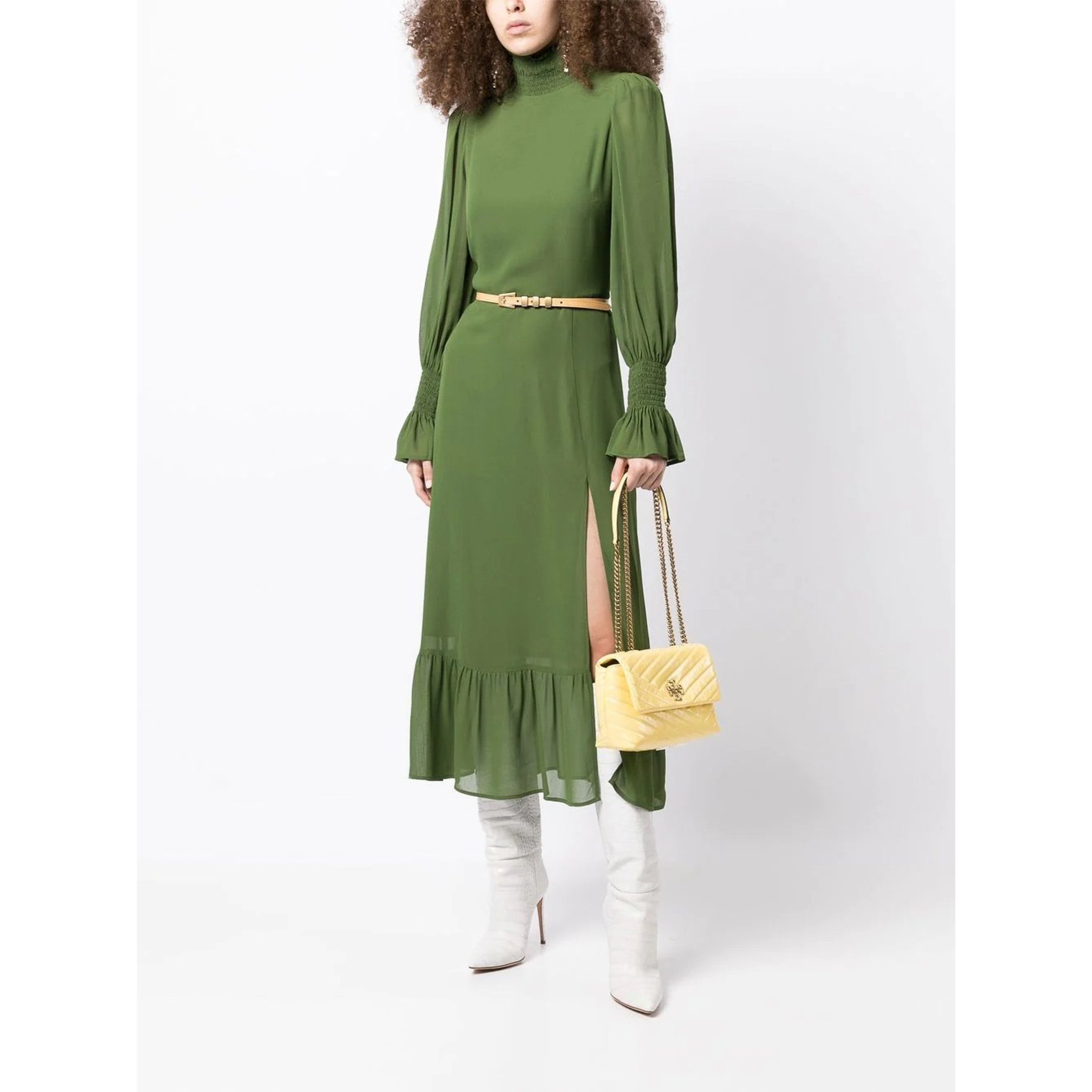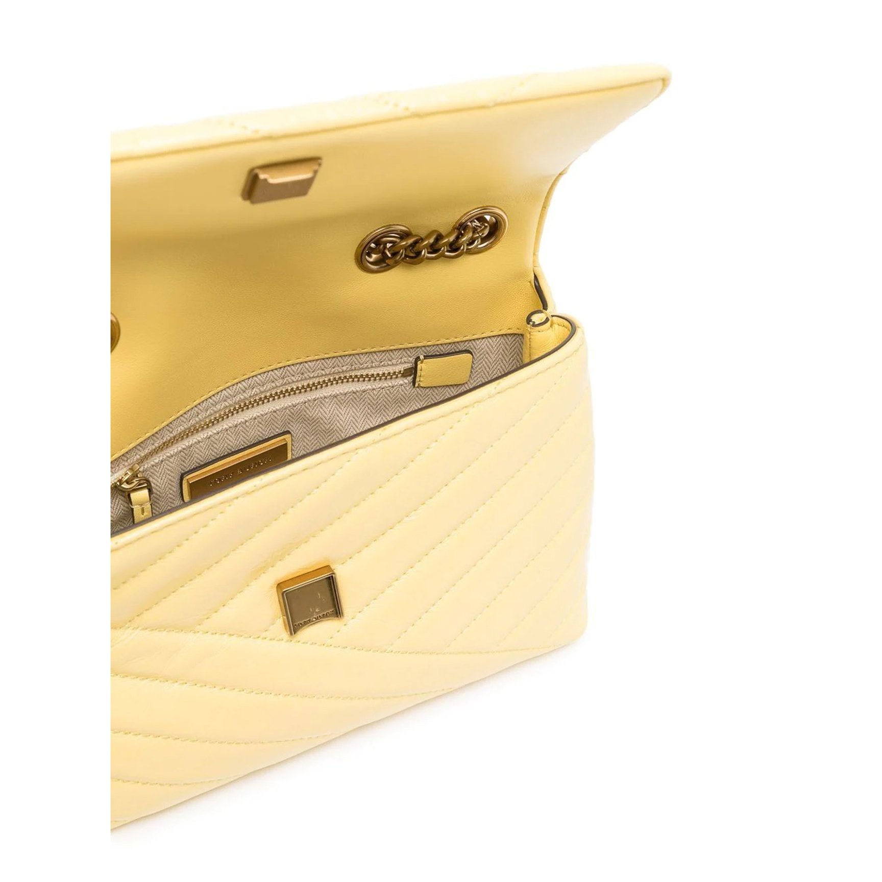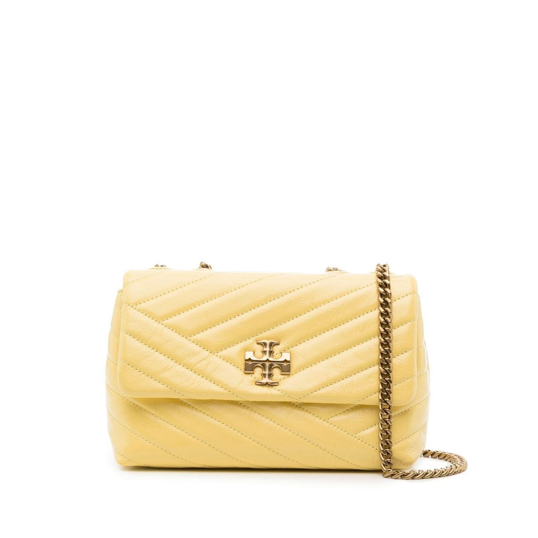 ハッピーなオーラを振りまく、イエローの「トリー バーチ(TORY BURCH)」“Kira”バッグ。ふんわりとしたソフトキルティングレザーをリズミカルに交差させ、フェミニンながらスマートな印象に仕上げています。チェーンの持ち方次第でショルダーとしてもハンドバッグとしても、気分に合わせてシルエットを変更できます。