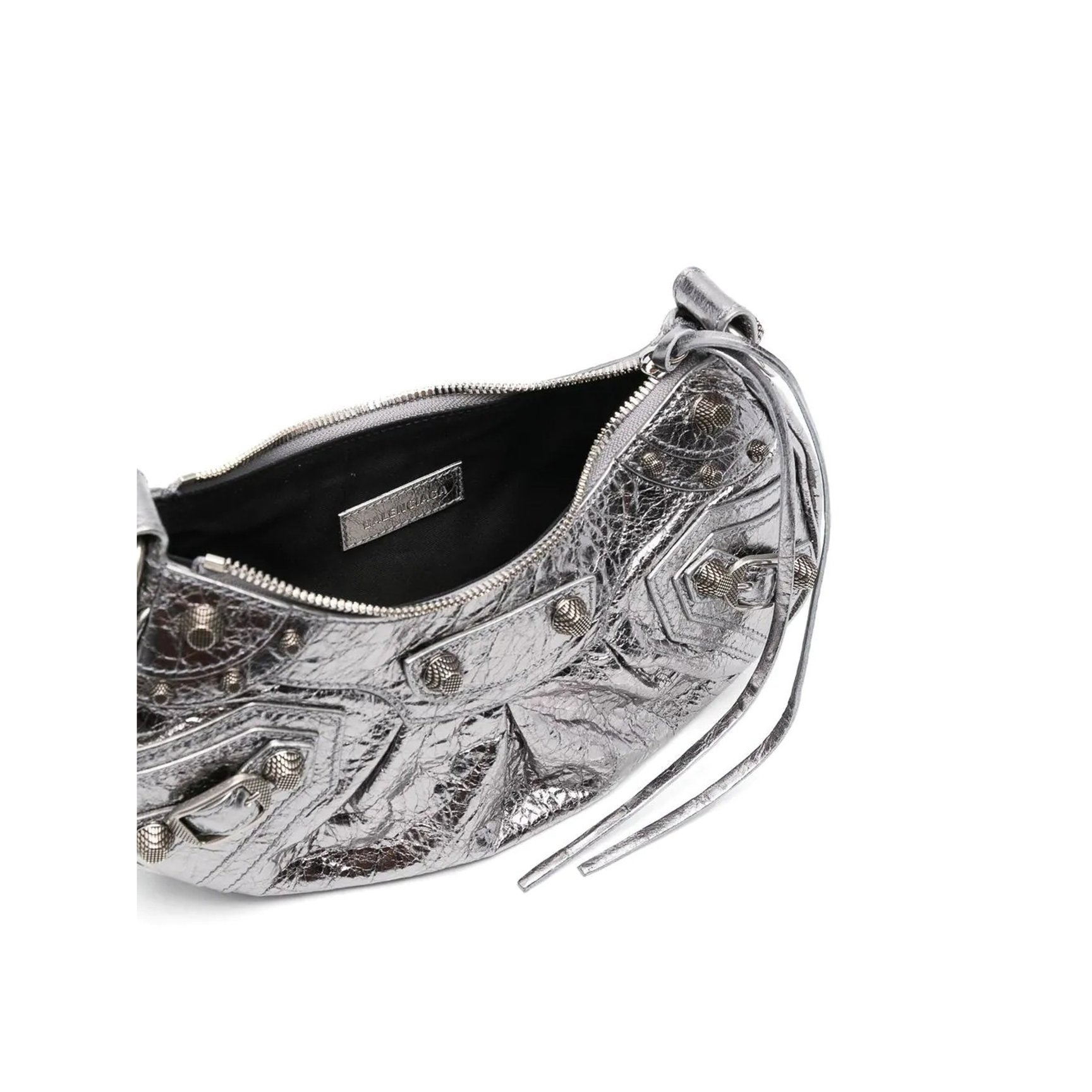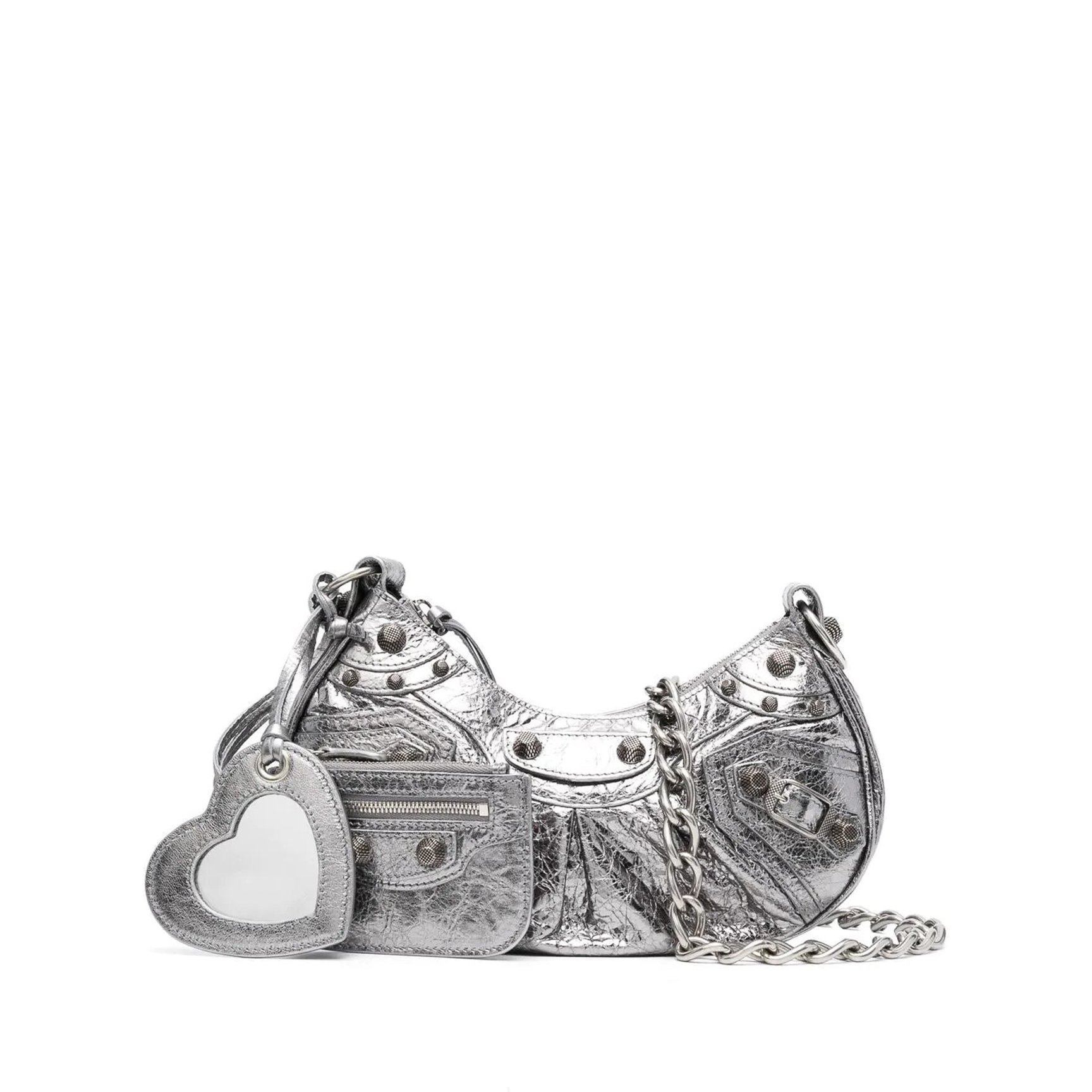 近未来的なメタリックか眩しい、「バレンシアガ(BALENCIAGA)」の“Le Cagole”ショルダーバッグ。キュートなハートのミラーが光を反射し、ラインストーンの装飾とチェーンがミラーボールのように輝きを放ちます。取り外し可能なミニポーチが嬉しい、どこをとってもおしゃれに見えるアイテムです。