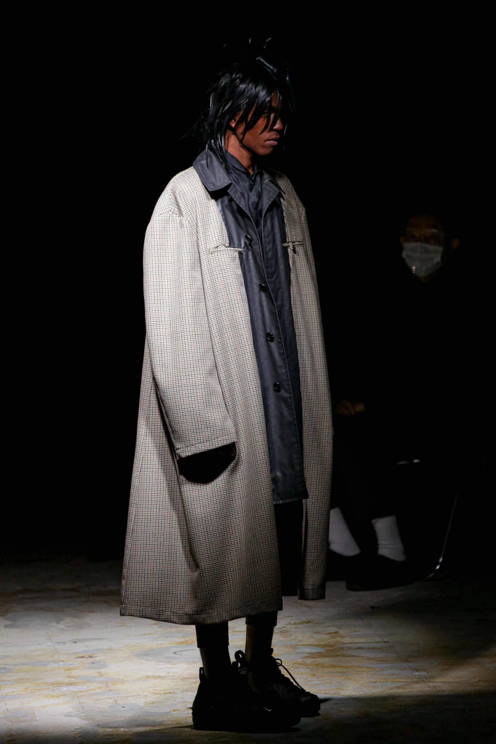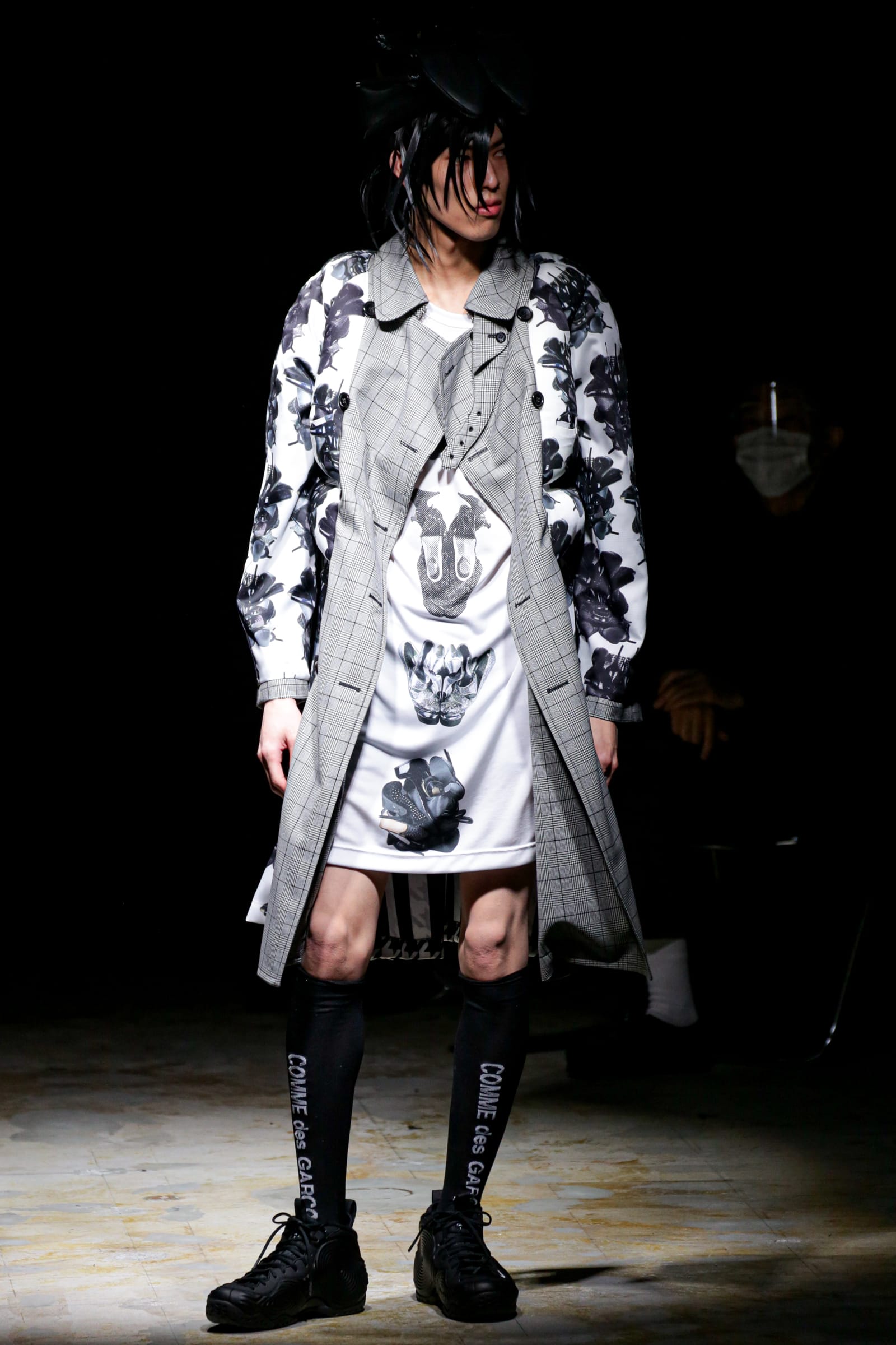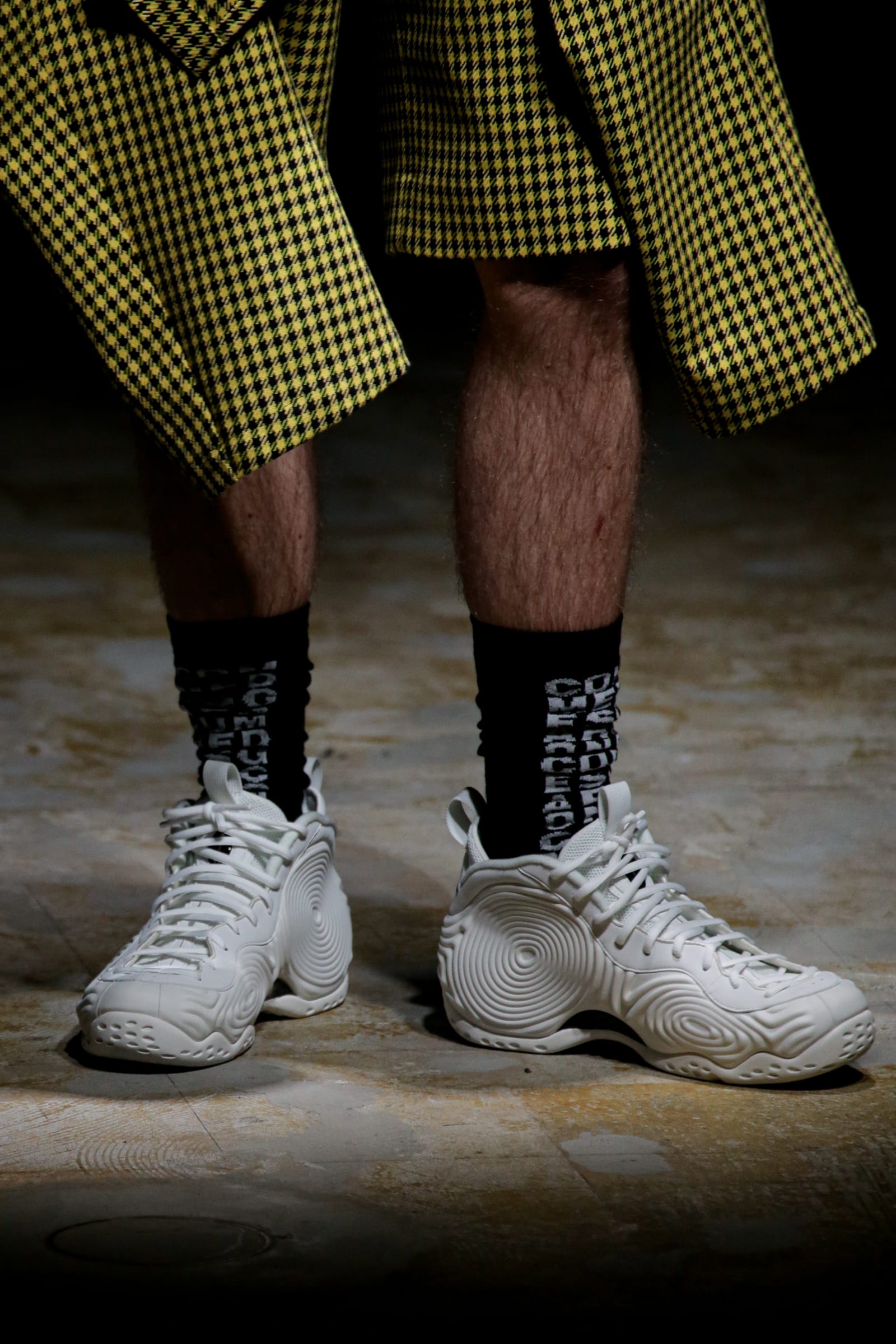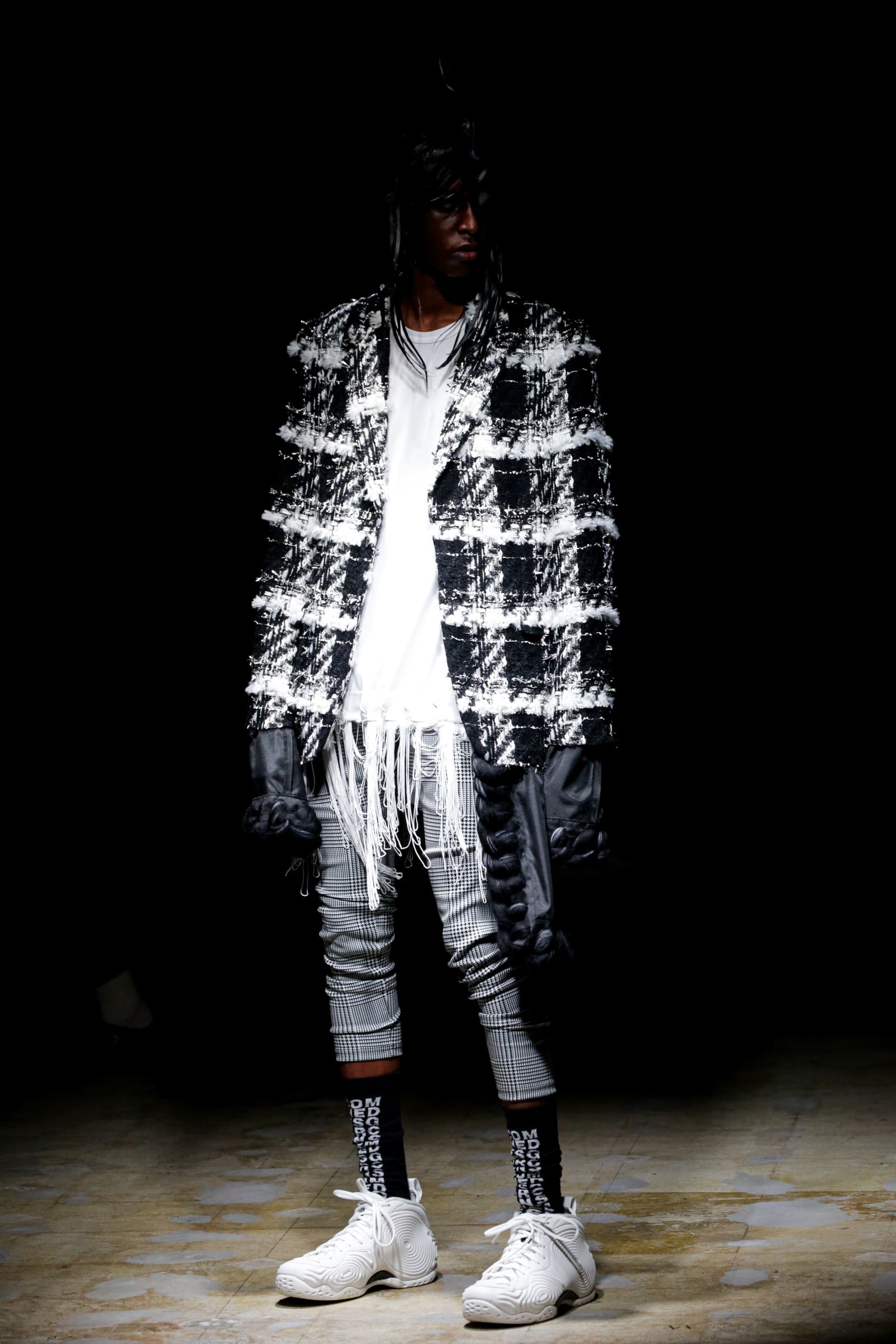 白のスーツが5ルック続いた後は、一転して黒ベースのルックに切り替わる。まるでオセロのように。シャネルツイードのチェックのジャケットには、いささか不釣り合いなアメフトのユニフォームのようなパンツを合わせている。足元はナイキの90年代のバスケットシューズの名作「フォームポジット(FOAMPOSITE)」をベースにしたスニーカー。黒と白の2色があり、ぐるぐる巻く渦のようなモチーフが横のフォームの部分に描かれている。