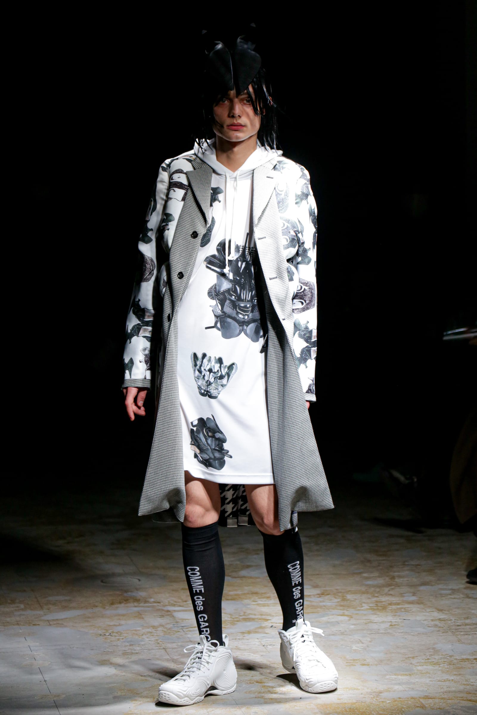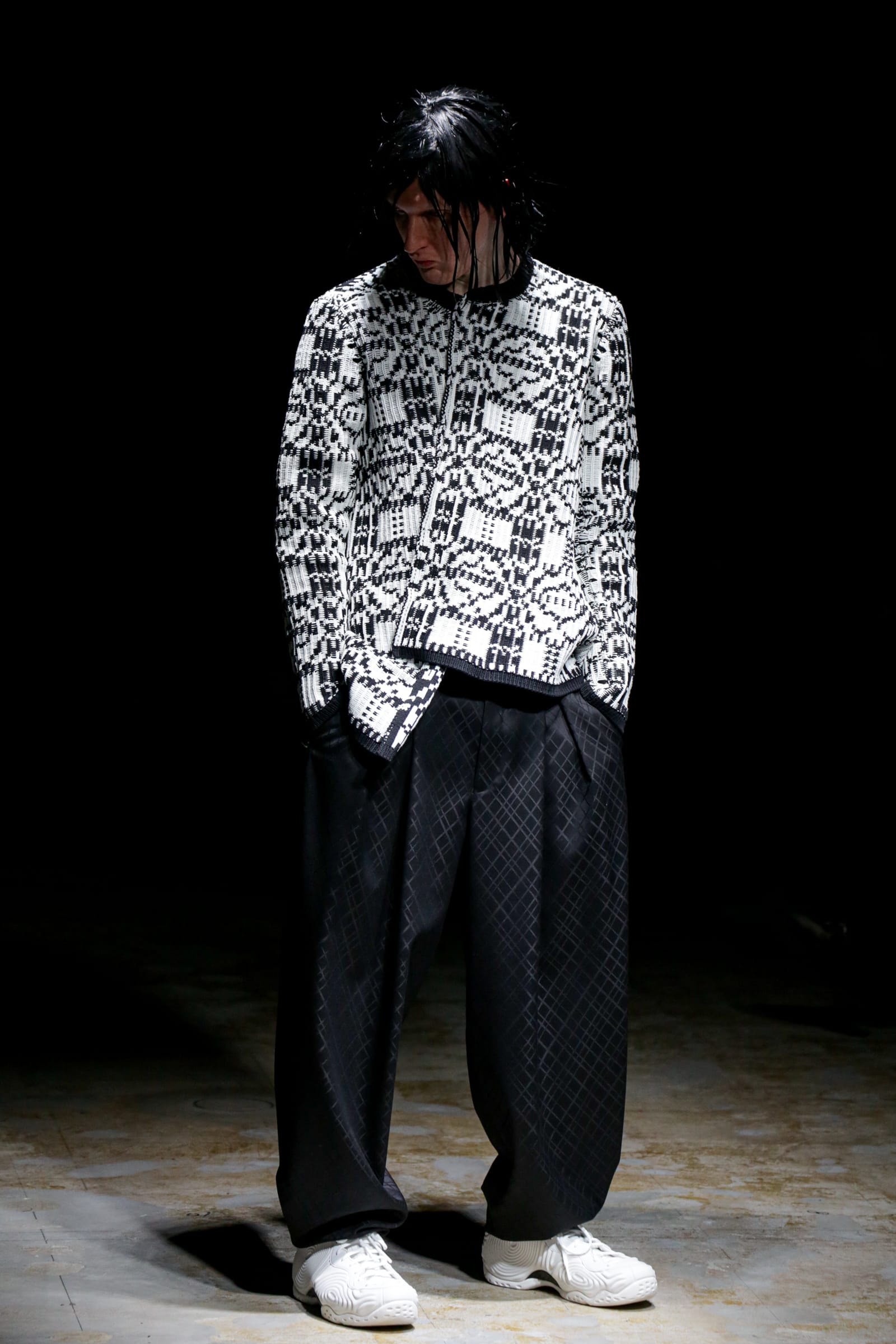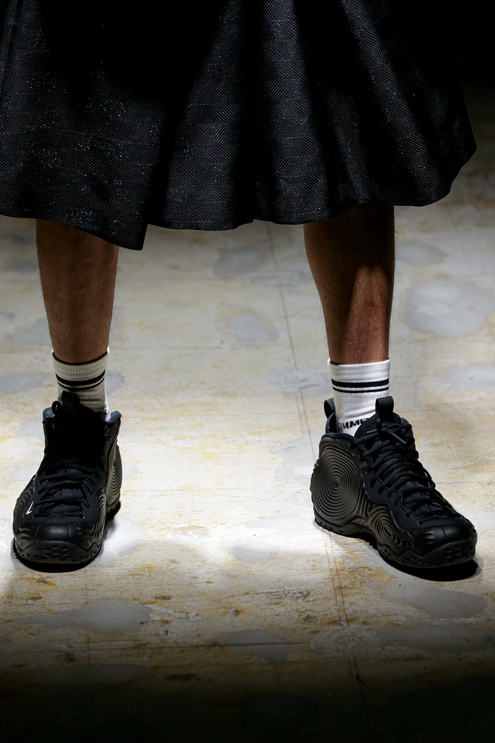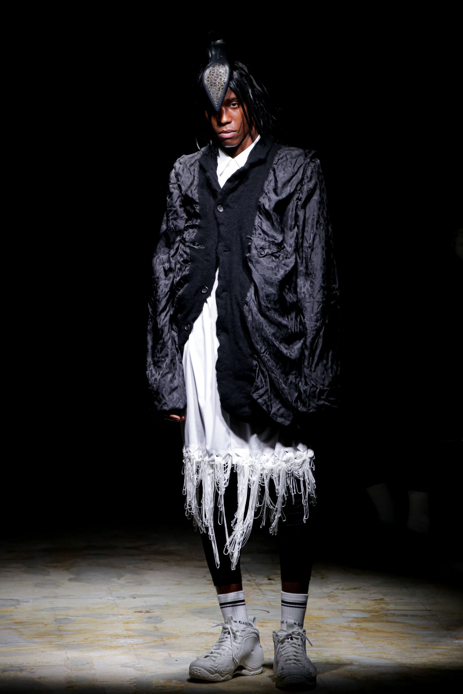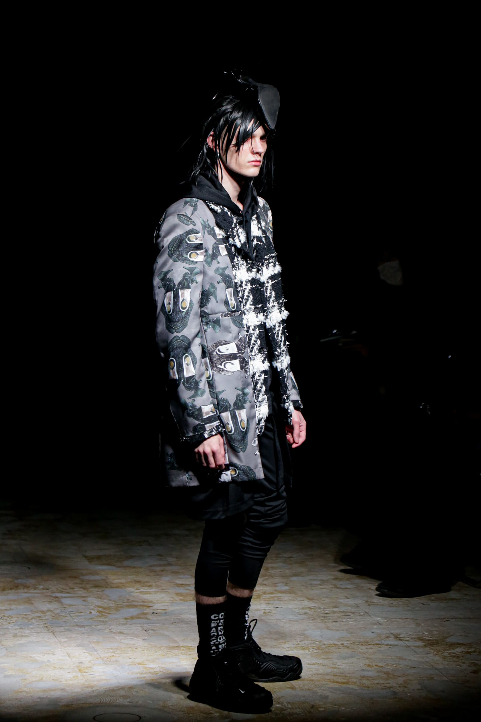 白のスーツが5ルック続いた後は、一転して黒ベースのルックに切り替わる。まるでオセロのように。シャネルツイードのチェックのジャケットには、いささか不釣り合いなアメフトのユニフォームのようなパンツを合わせている。足元はナイキの90年代のバスケットシューズの名作「フォームポジット(FOAMPOSITE)」をベースにしたスニーカー。黒と白の2色があり、ぐるぐる巻く渦のようなモチーフが横のフォームの部分に描かれている。