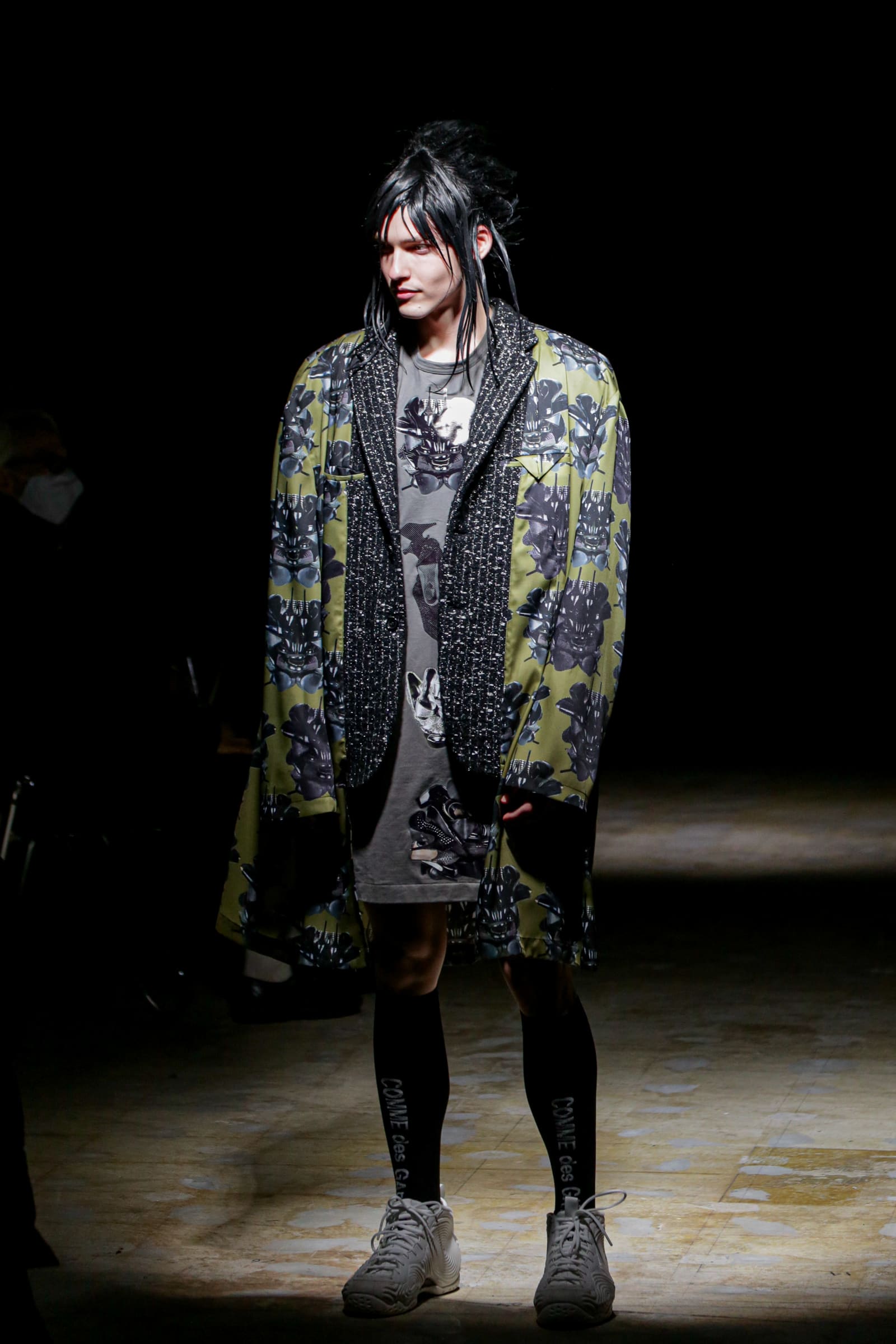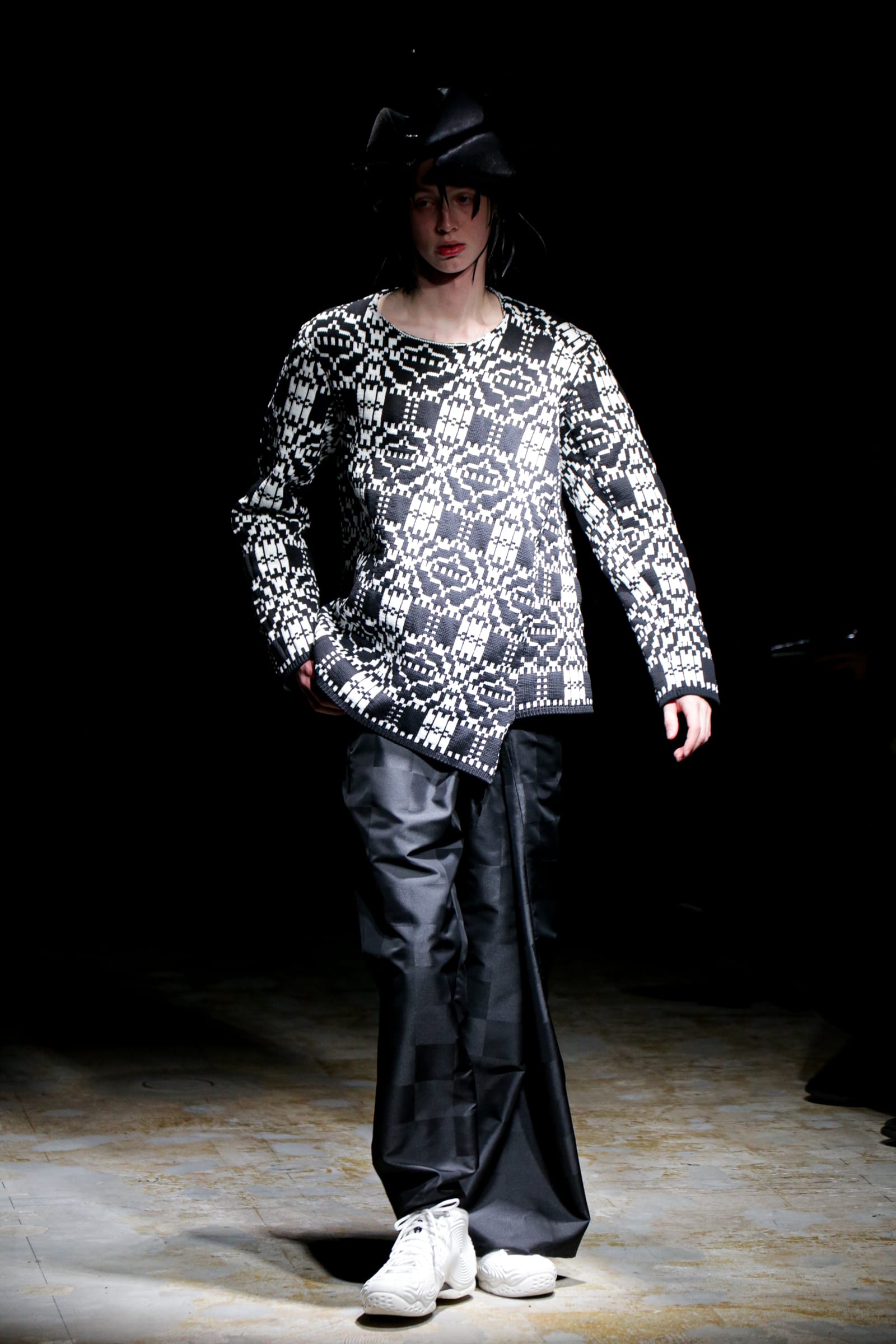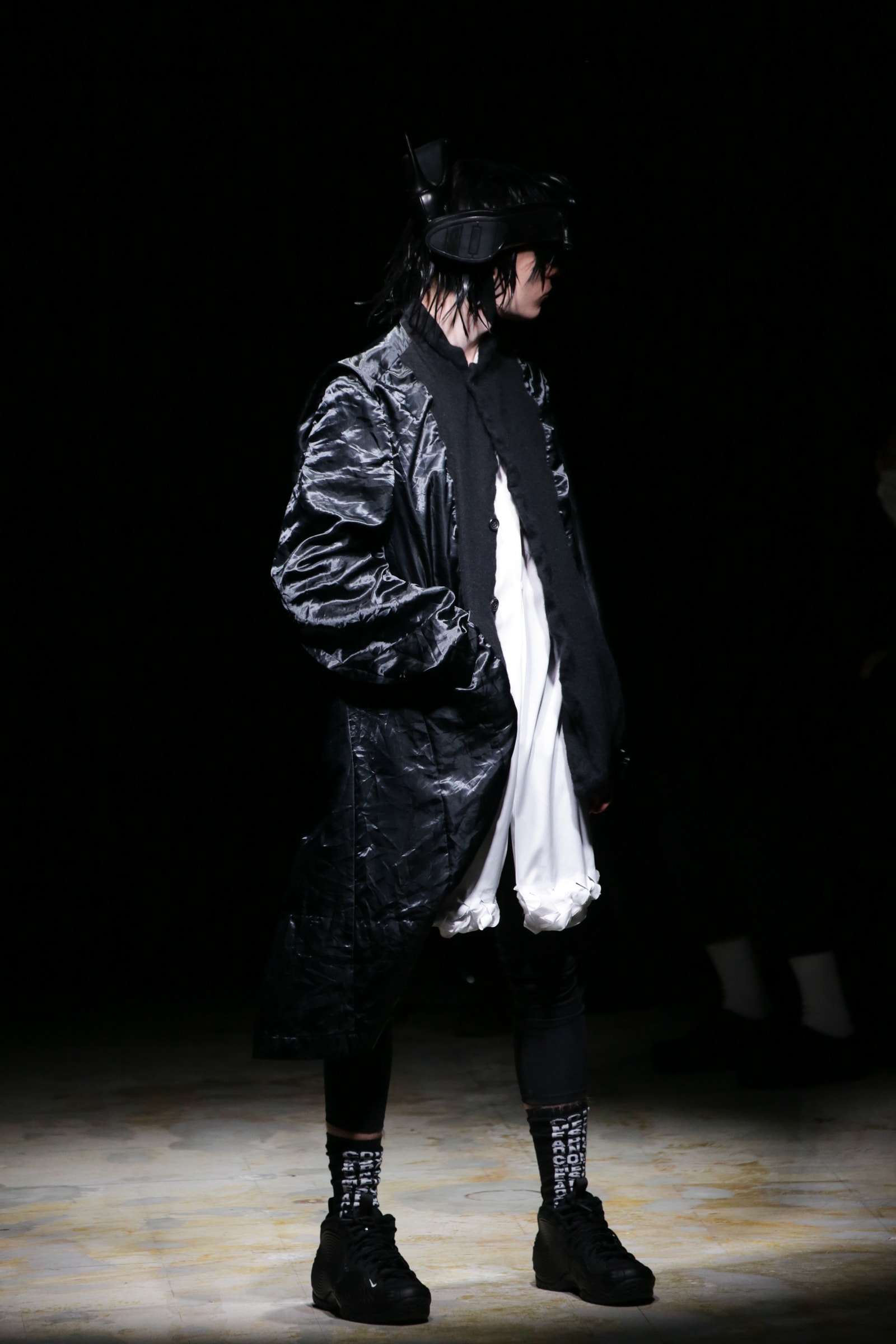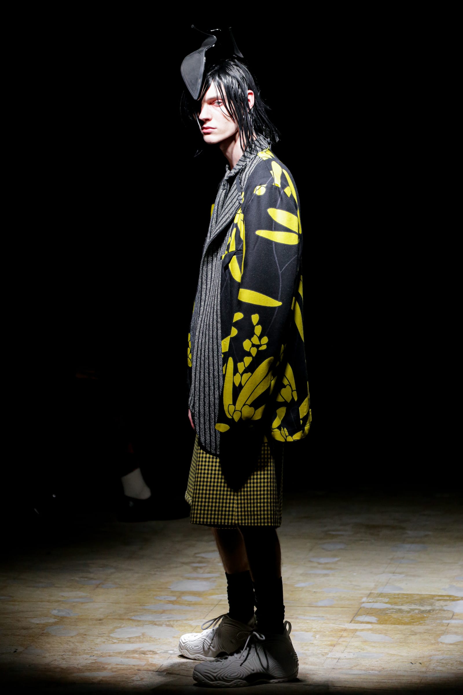 白のスーツが5ルック続いた後は、一転して黒ベースのルックに切り替わる。まるでオセロのように。シャネルツイードのチェックのジャケットには、いささか不釣り合いなアメフトのユニフォームのようなパンツを合わせている。足元はナイキの90年代のバスケットシューズの名作「フォームポジット(FOAMPOSITE)」をベースにしたスニーカー。黒と白の2色があり、ぐるぐる巻く渦のようなモチーフが横のフォームの部分に描かれている。