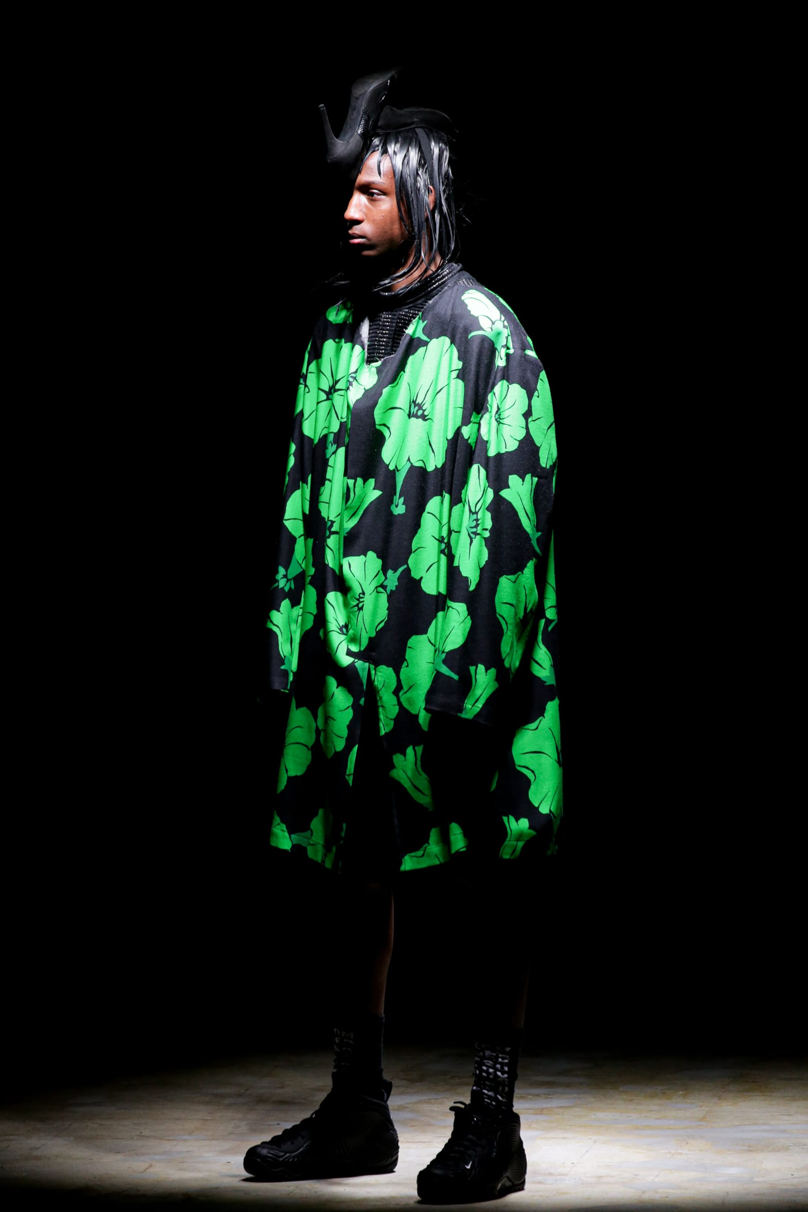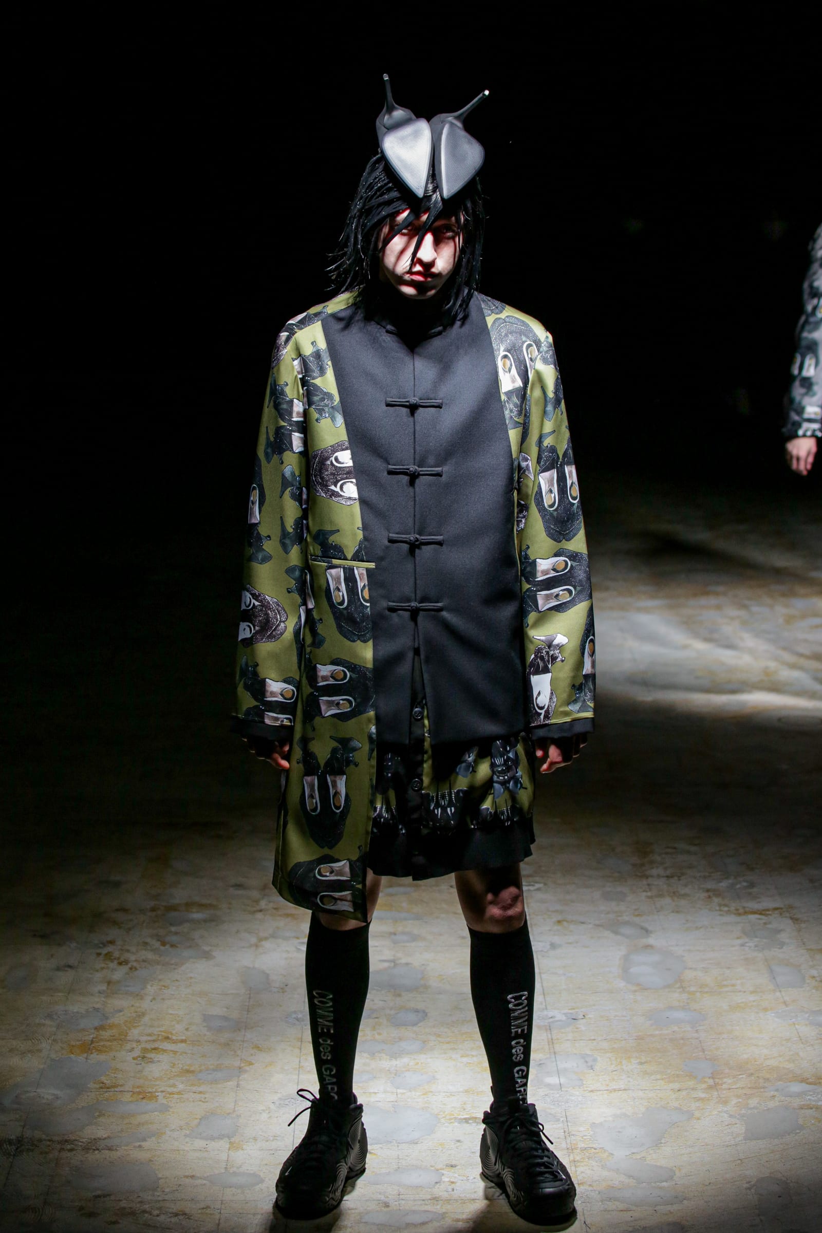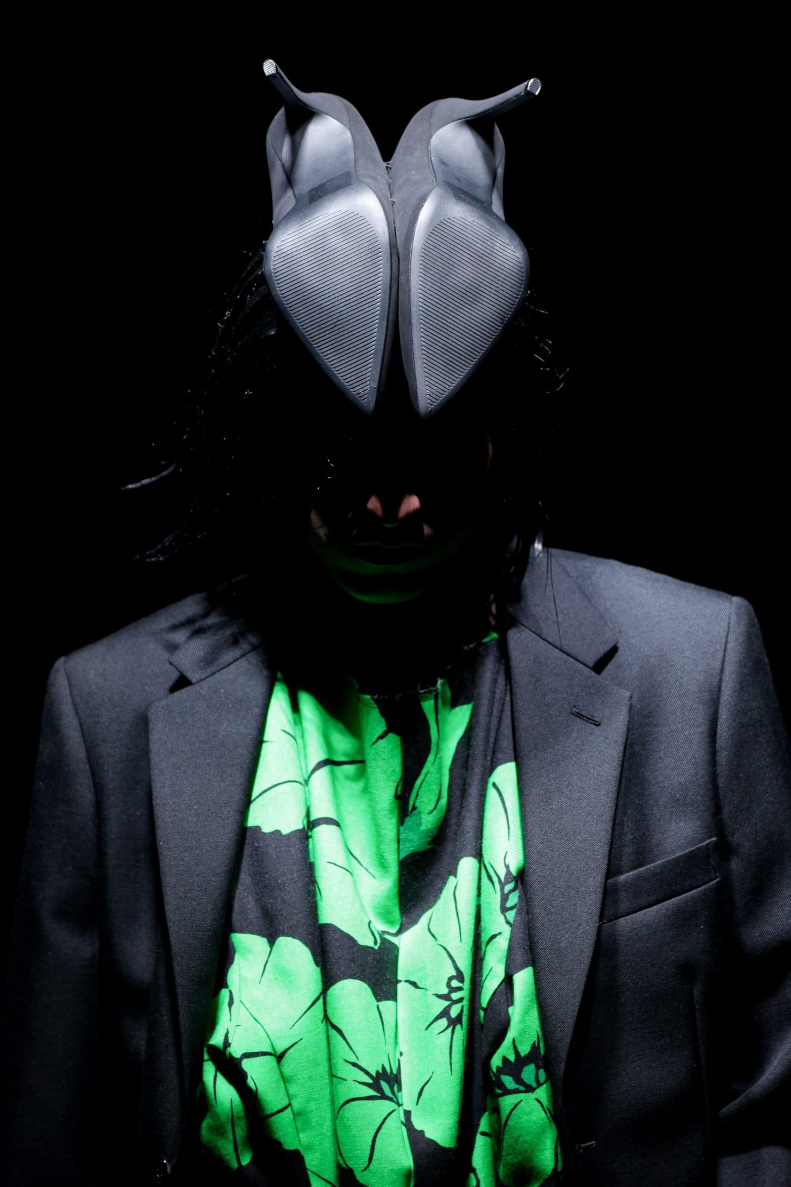 中盤に入ると、鬼の顔のようなモチーフが描かれたワンピースを着たモデルが登場する。その上には、横幅10cmほどに切り取られたコートのようなジレを羽織っている。そしてモヒカンのようなヘッドピースが照らされるのを見て、それが何なのかようやく気がついた。正体は裏返しにされたヒールパンプスだった。
