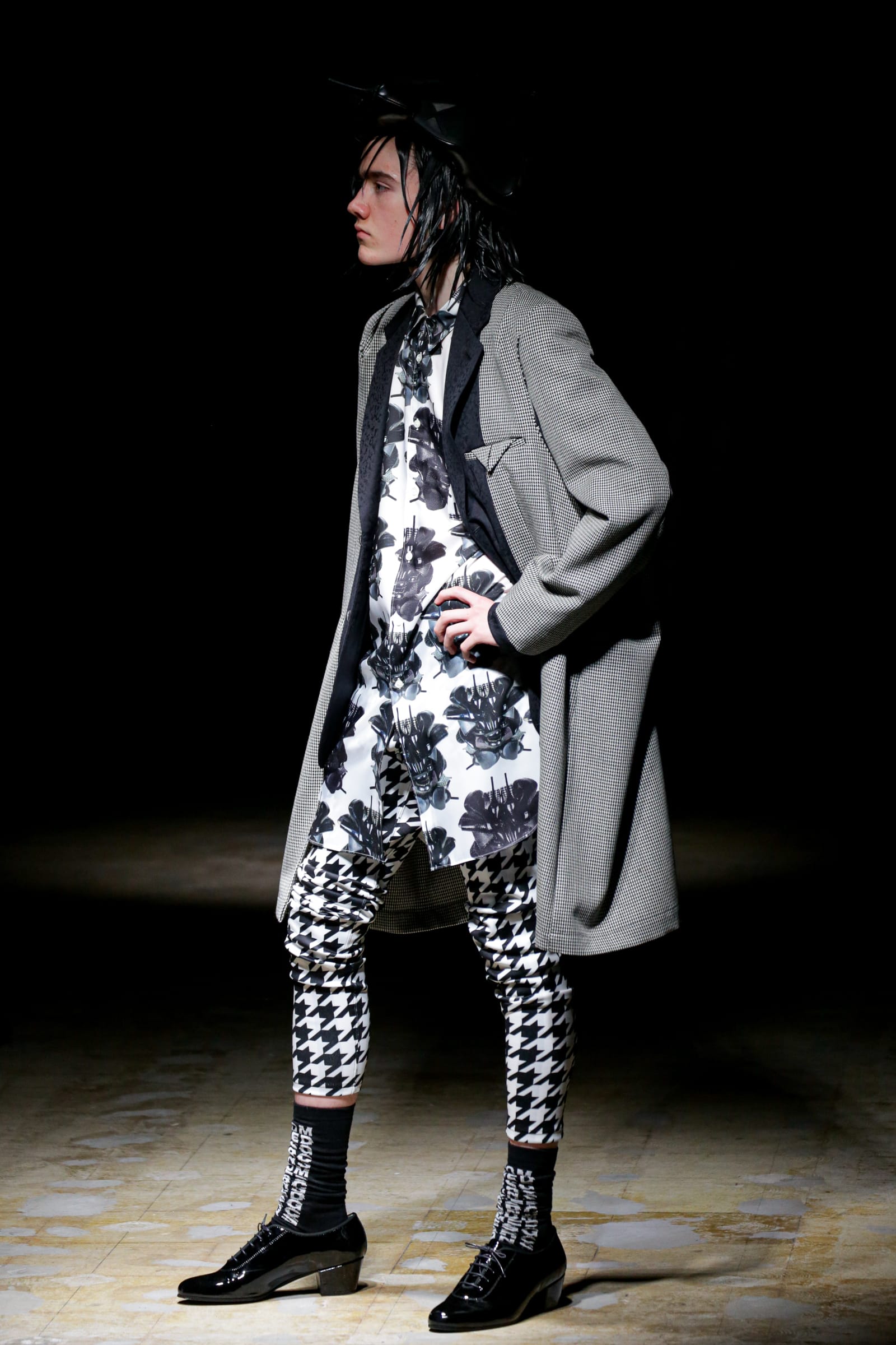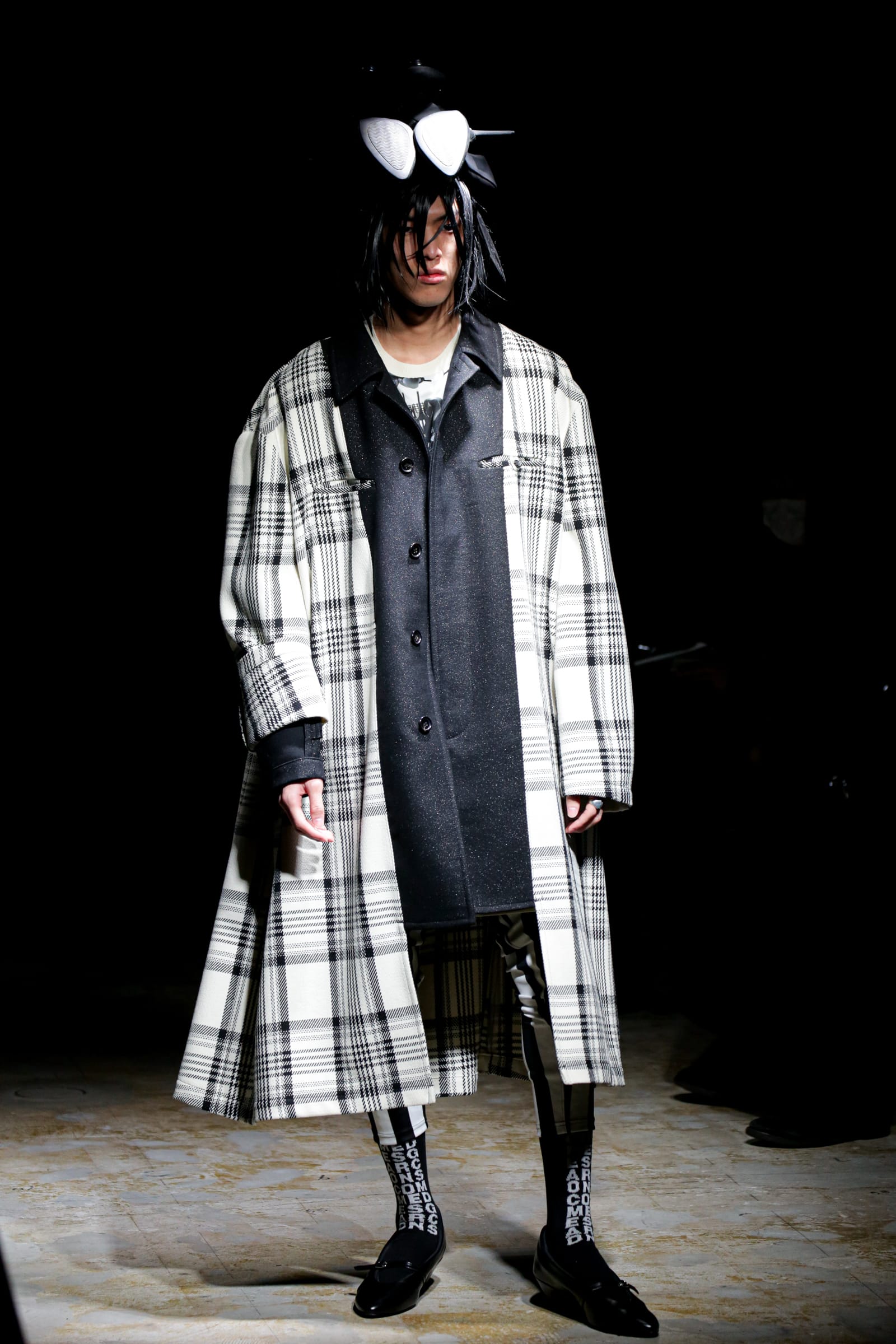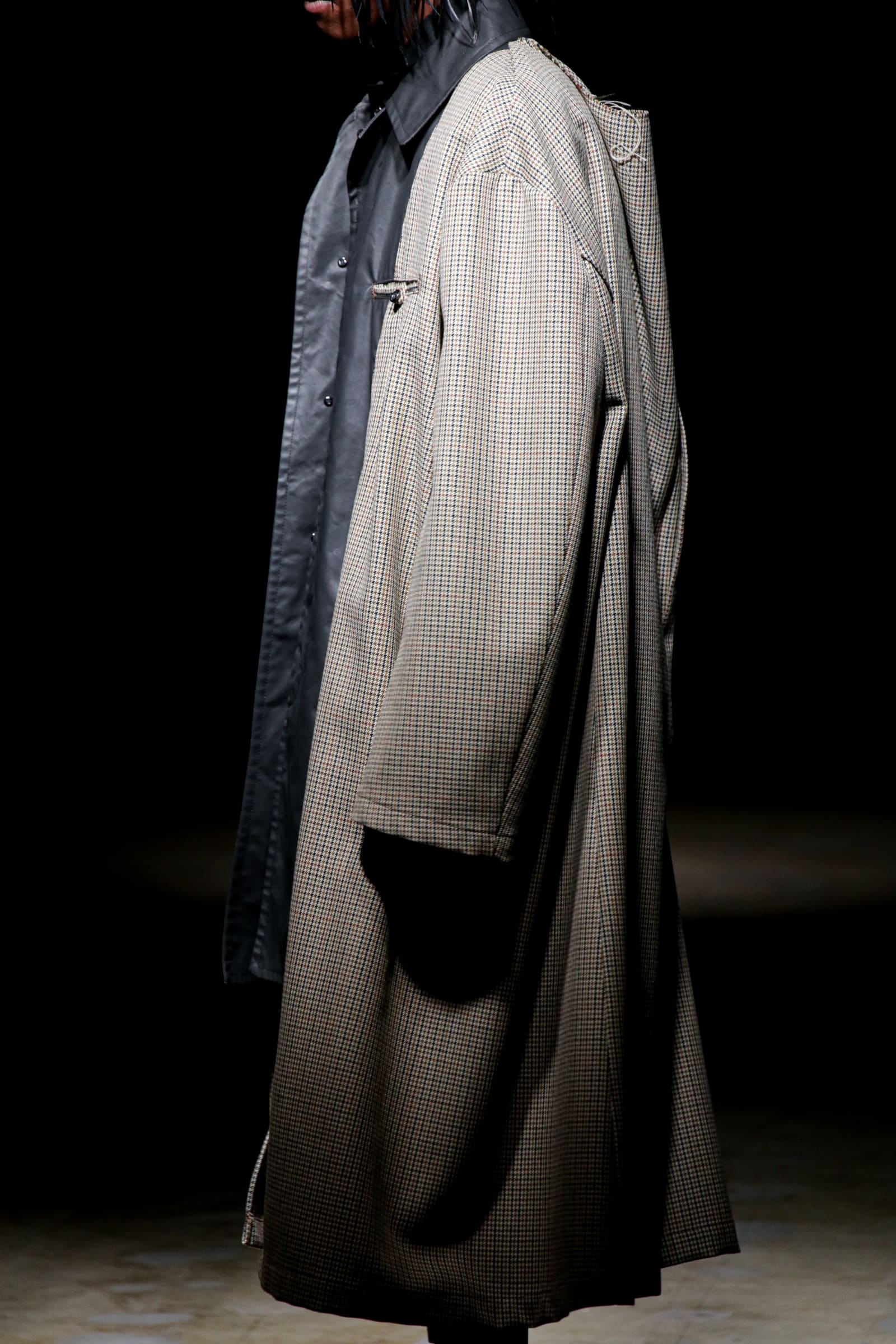 終盤のメインはインサイドアウトのコートとジャケット。たっぷりしたシルエットのコートは、後ろの首の部分を大きく摘んでいて、裏地と表地が一体となったフロントよりも強い主張を感じる。カラーパレットは、緑と黄の花柄と千鳥格子を除けば、白と黒で統一。柄はウィリー?コールの作品の他、大小のグレンチェックが目立つ。