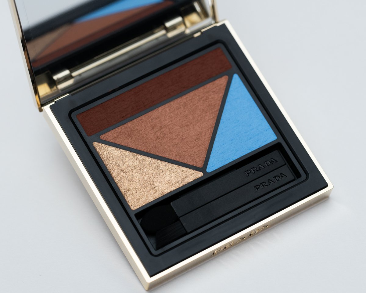 なんともファッショナブルな配色が目を引く4色入りアイシャドウパレット「Prada Dimensions」は絶対に欲しいと思っていたアイテム!価格は65ユーロ(9800円)でした。ちなみに送料でプラス4200円ほどかかっています(涙)。パッケージ表面には、どどんとトライアングルロゴをデザイン。ゴールドの縁取りがアクセントに。