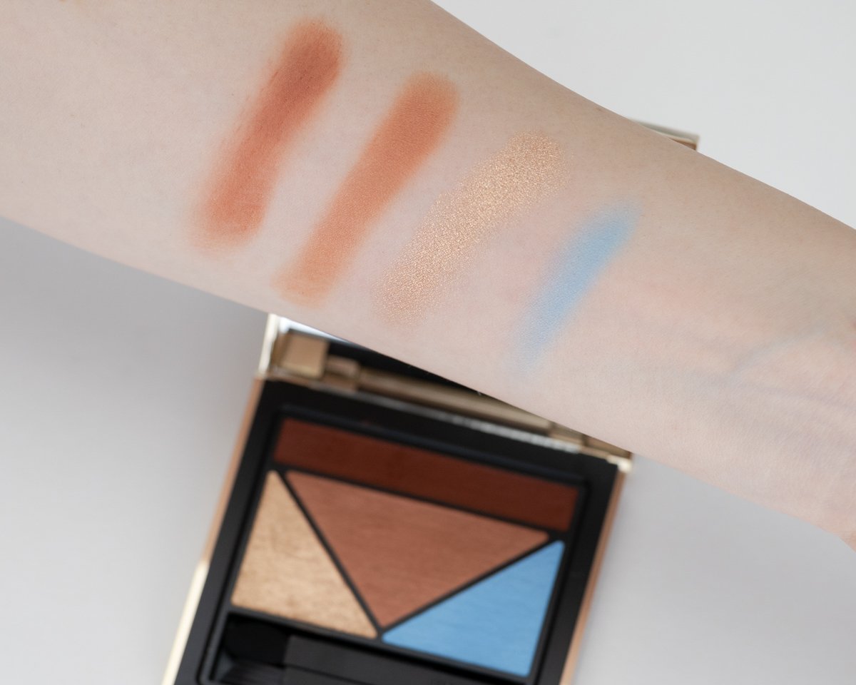 購入したのは、レッドブラウン、ベージュブラウン、シャンパンゴールド、スカイブルーが揃う「05 PURE」。ハイパーマット(レッドブラウン)、サテン(ベージュブラウン)、メタルフォイル(ベージュゴールド)、ソフトマット(スカイブルー)の4つの異なる質感で、粉質は若干しっとりとしていてまぶたに密着してくれそうです。パレットの中で最もディープなレッドブラウンは濃さが調整しやすいので、締め色にもメインカラーにも◎。キャッチーなスカイブルーは高発色でライン使いにも良さそうです。