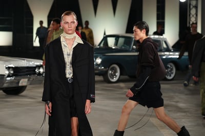 デザイナー岡本大陸が手掛ける「ダイリク(DAIRIKU)」が、2024年春夏コレクションを新国立競技場内の駐車場で発表した。コレクションテーマは「MY HERO」で、1920年代のハリウッドが舞台の映画「バビロン」から着想。現地さながらの「HOLLYWOOD」のサインをバックに、アメリカのヴィンテージカー2台の入場でショーは幕を開けた。