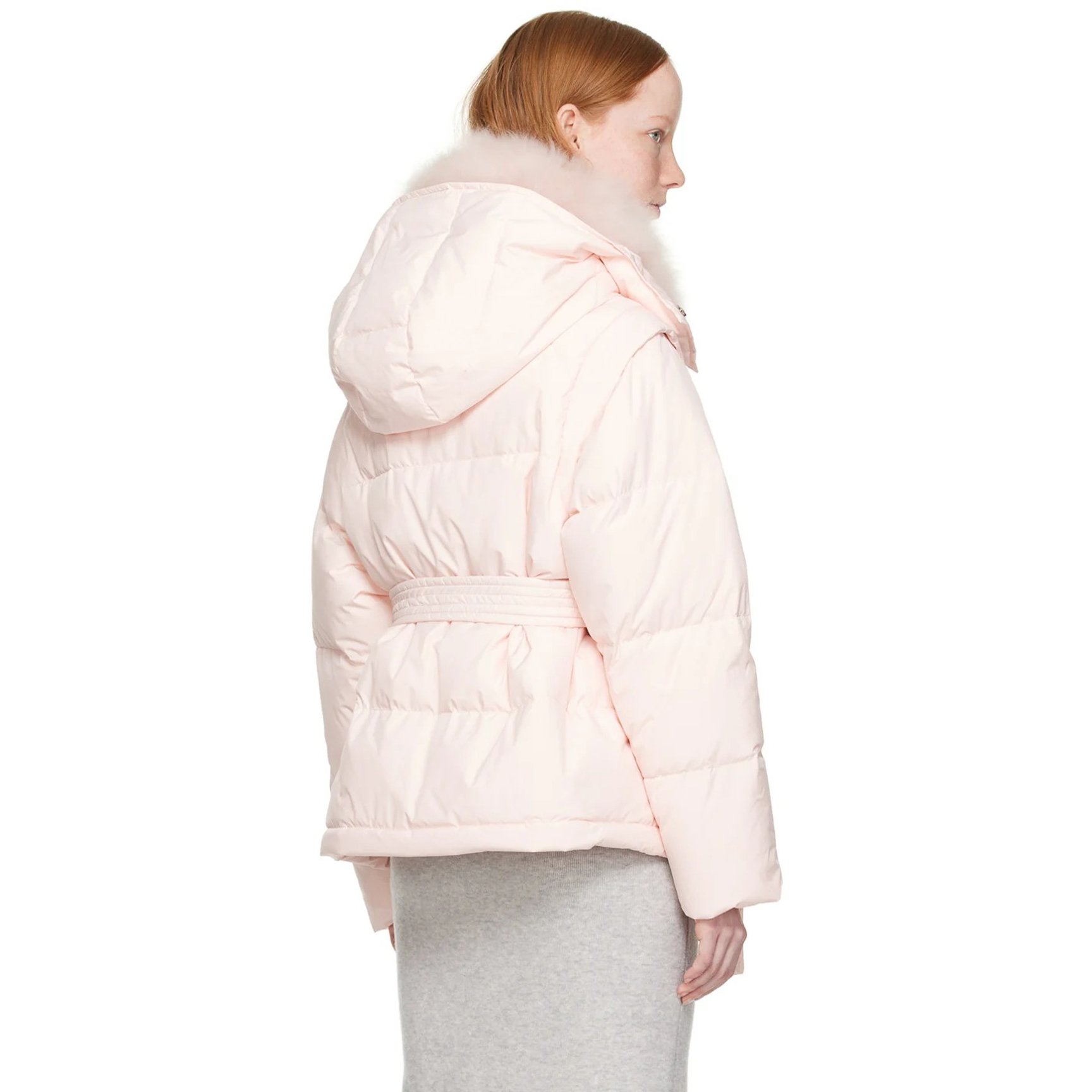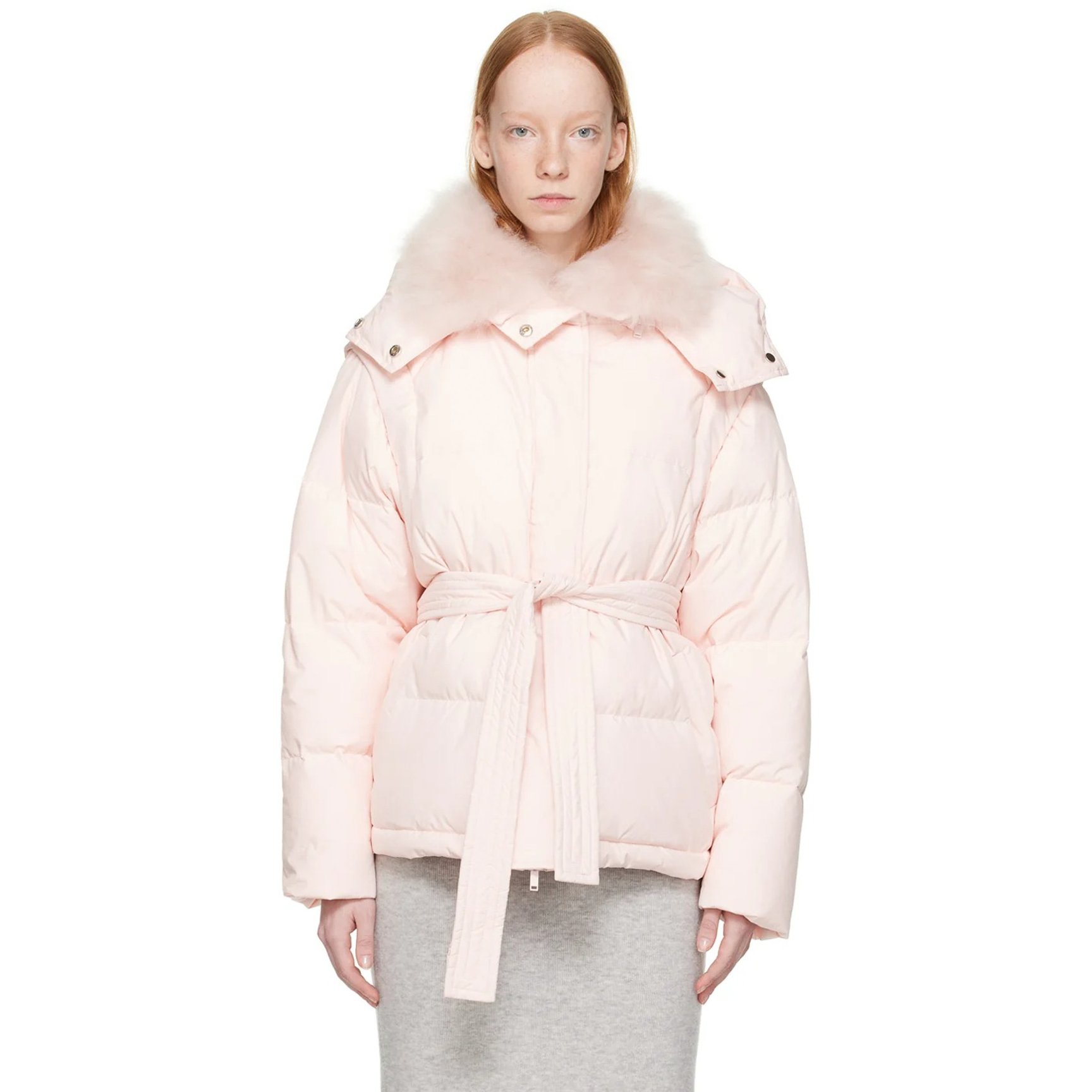ふわふわのシアリングとレディなピンク、グラマラスなシルエットをつくるベルトが、アウトドアチックになりがちなダウンアウターをエレガントに昇華させた「イヴ サロモン(Yves Salomon)」。フードを取り外すと、スタンドカラーのダウンジャケットとして楽しめます。