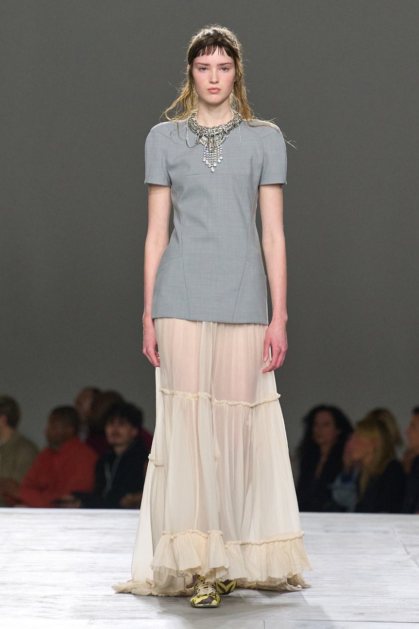 冒頭のルックから、観客は徐々に高まっていく色彩のハーモニーに誘われる。ミュートされた色調と繊細なシルエットで始まるコレクションは、次第に鮮やかさと大胆さを増していく構成となっており、まるで夕暮れから夜明けへと移り変わる空の様相を彷彿とさせた。クロスナー自身が述べる「ゆっくりとクレッシェンドを構築し、鮮やかで大胆な表現で終わらせたかった」という意図が反映されたものだ。
