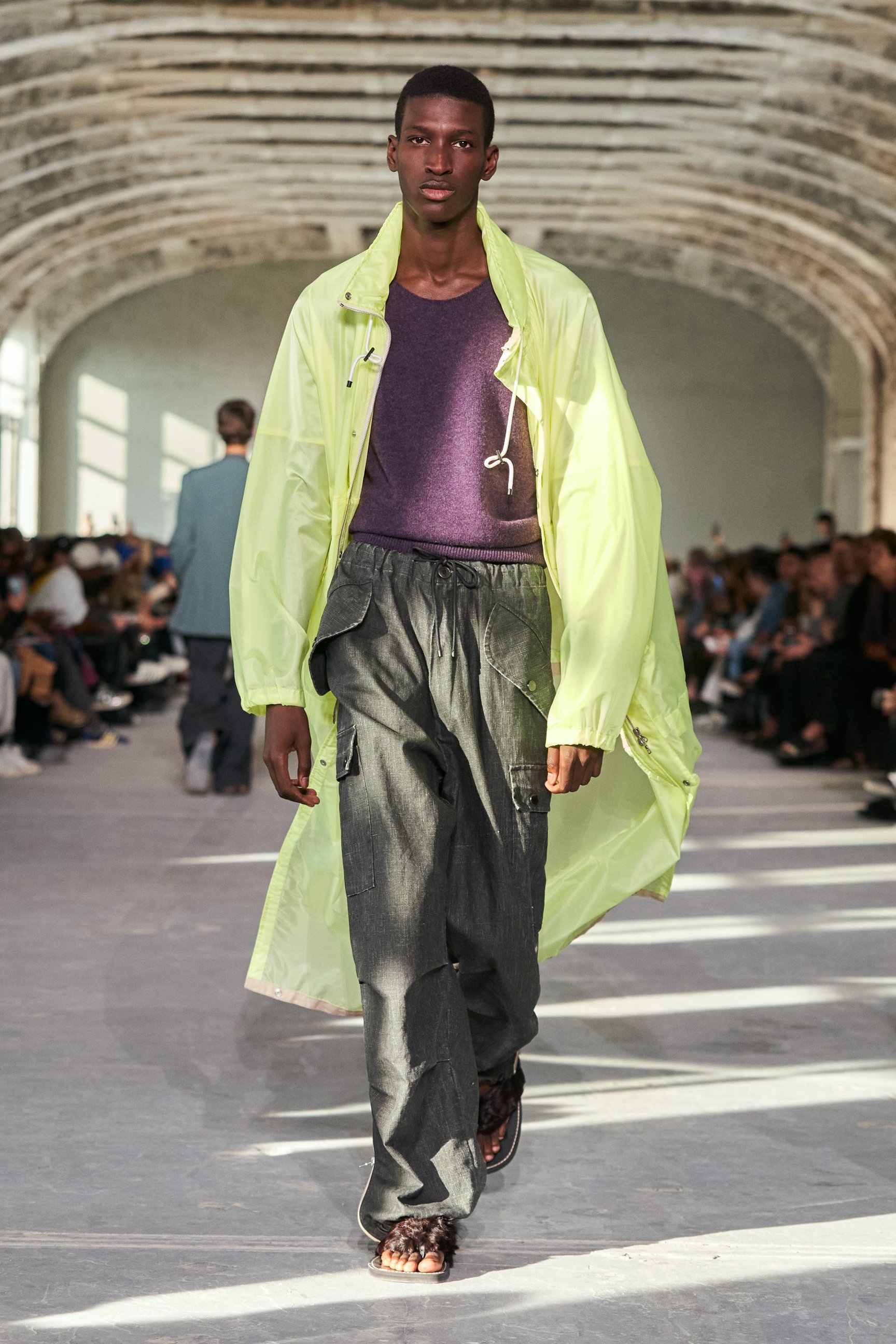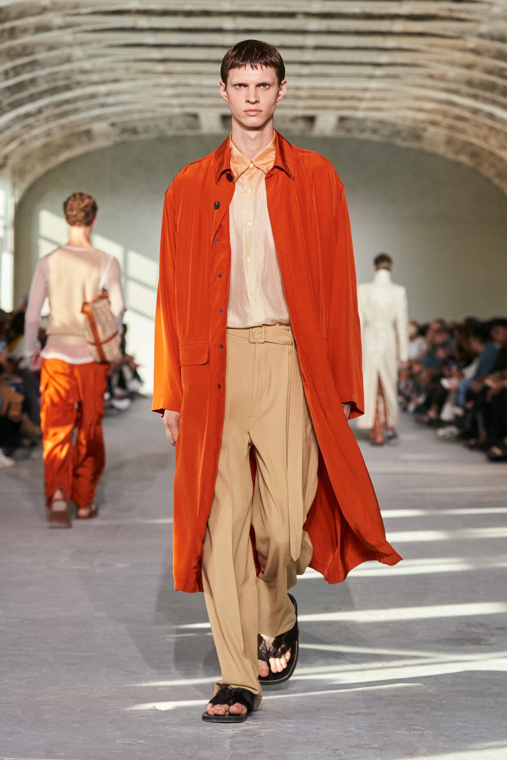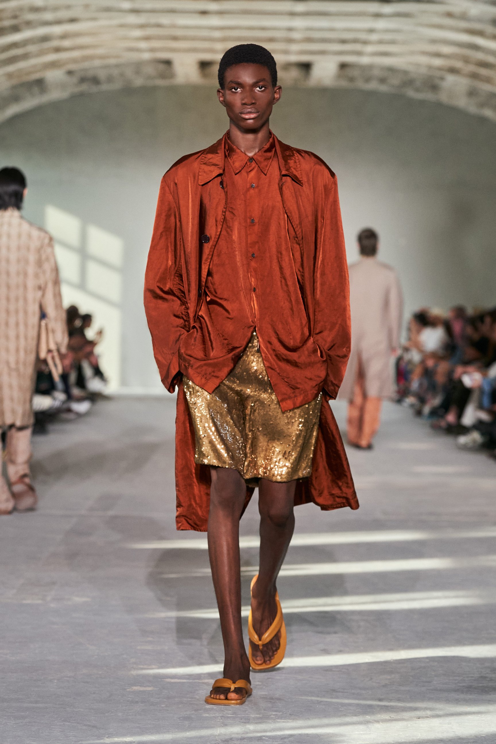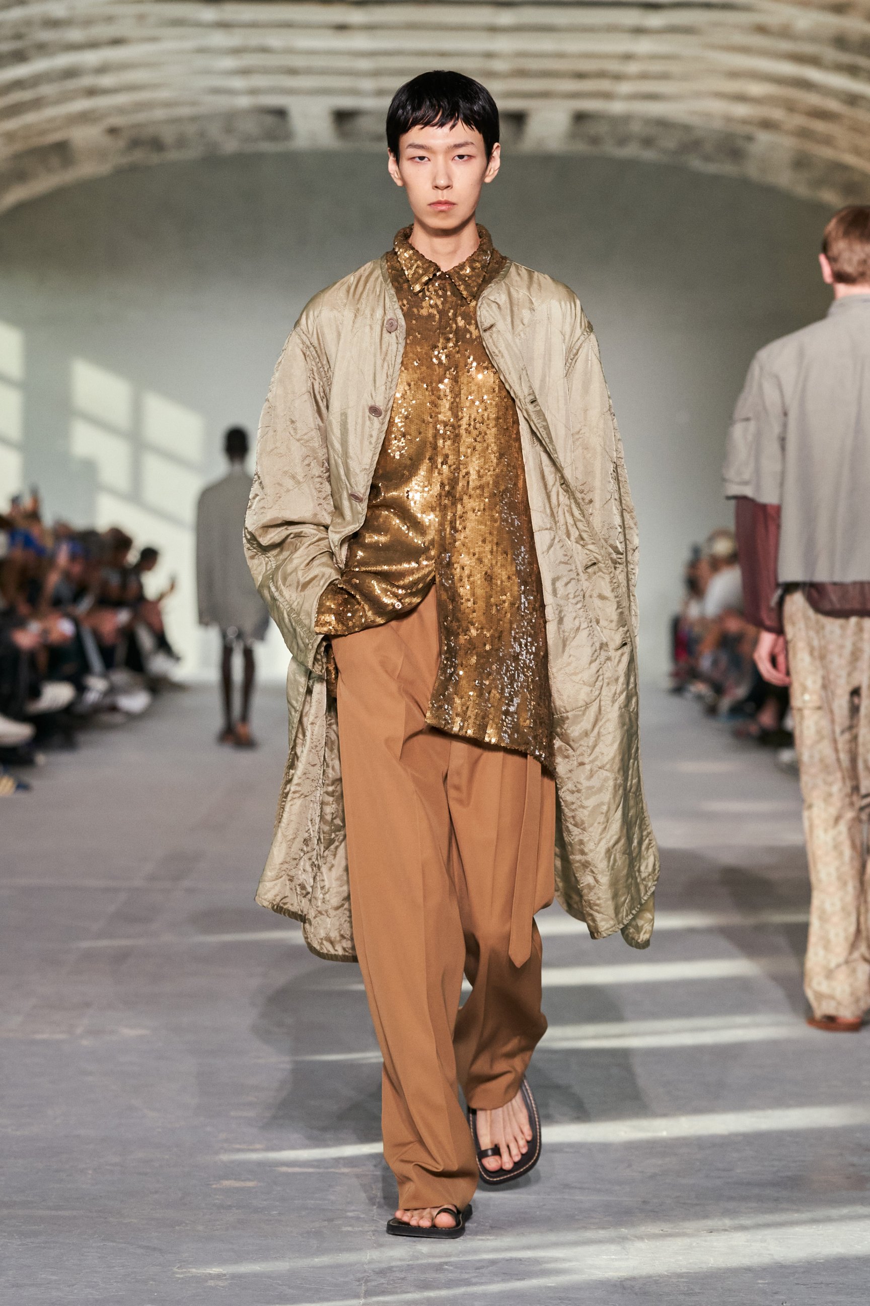 ドリスらしいメタリック?スパングルを取り入れたルックも登場。タイガーアイ?ストーンのジュエリーやチェーンベルトといった繊細なディテールも目を引く。開放的なムードを醸し出すサンダルには、ファーのようなテクスチャーが加えられた。優しさ、細さ、柔らかさといった要素が「男らしさ」の固定概念を揺さぶる、美しく繊細なコレクションとなった。