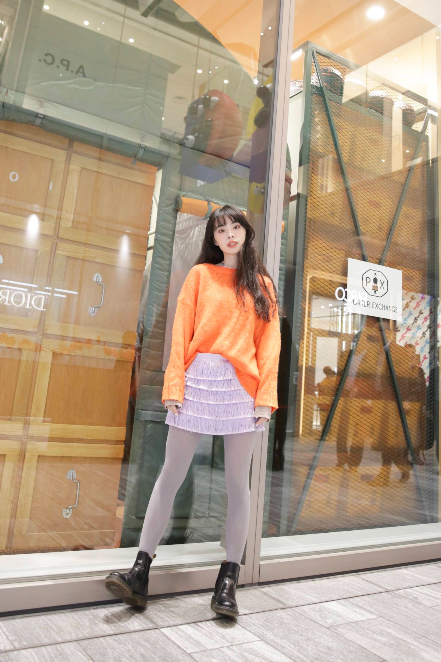 タイダイ柄のトップスにオレンジのパンツというカラフルなウェアにブーツを合わせたスタイリング。
