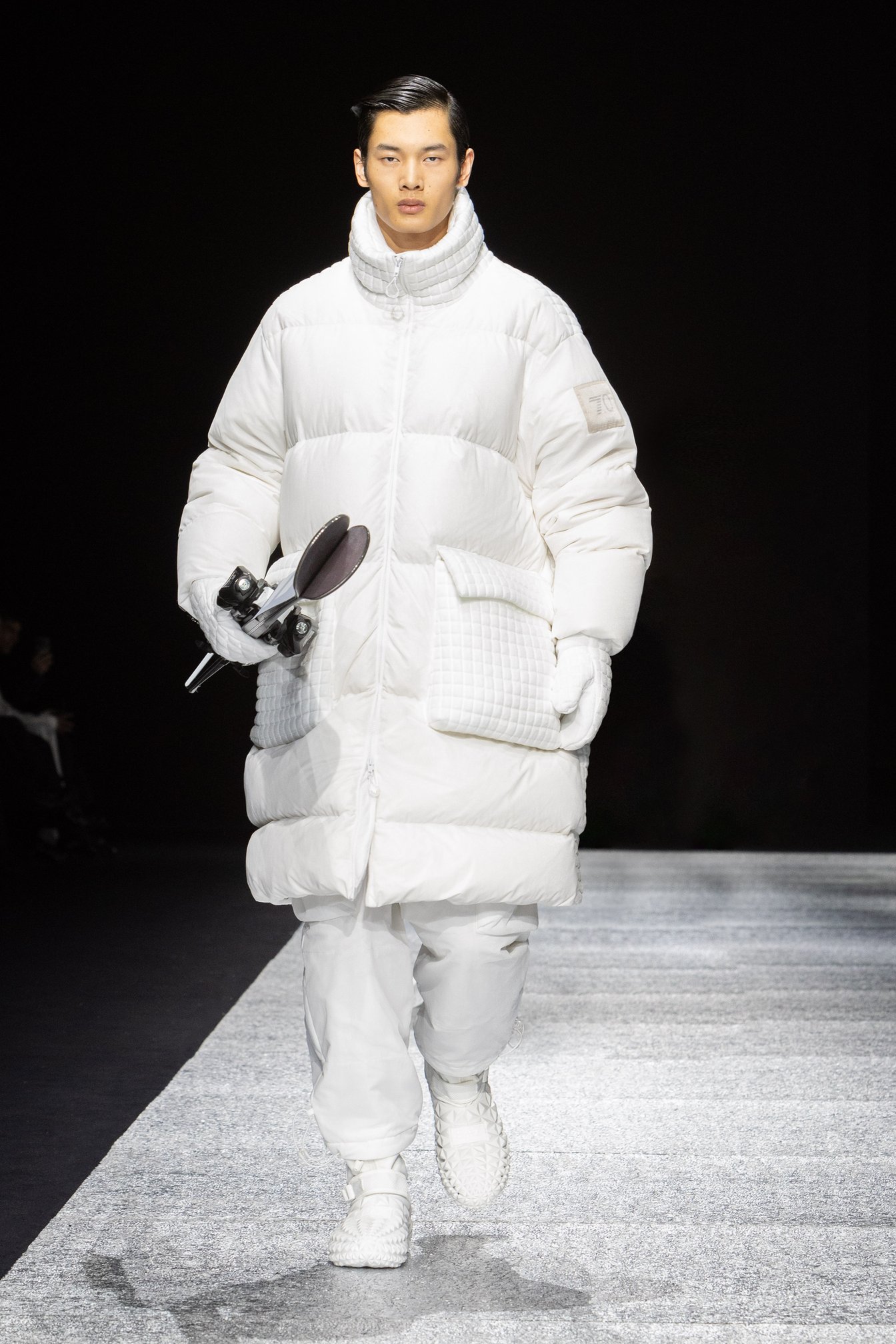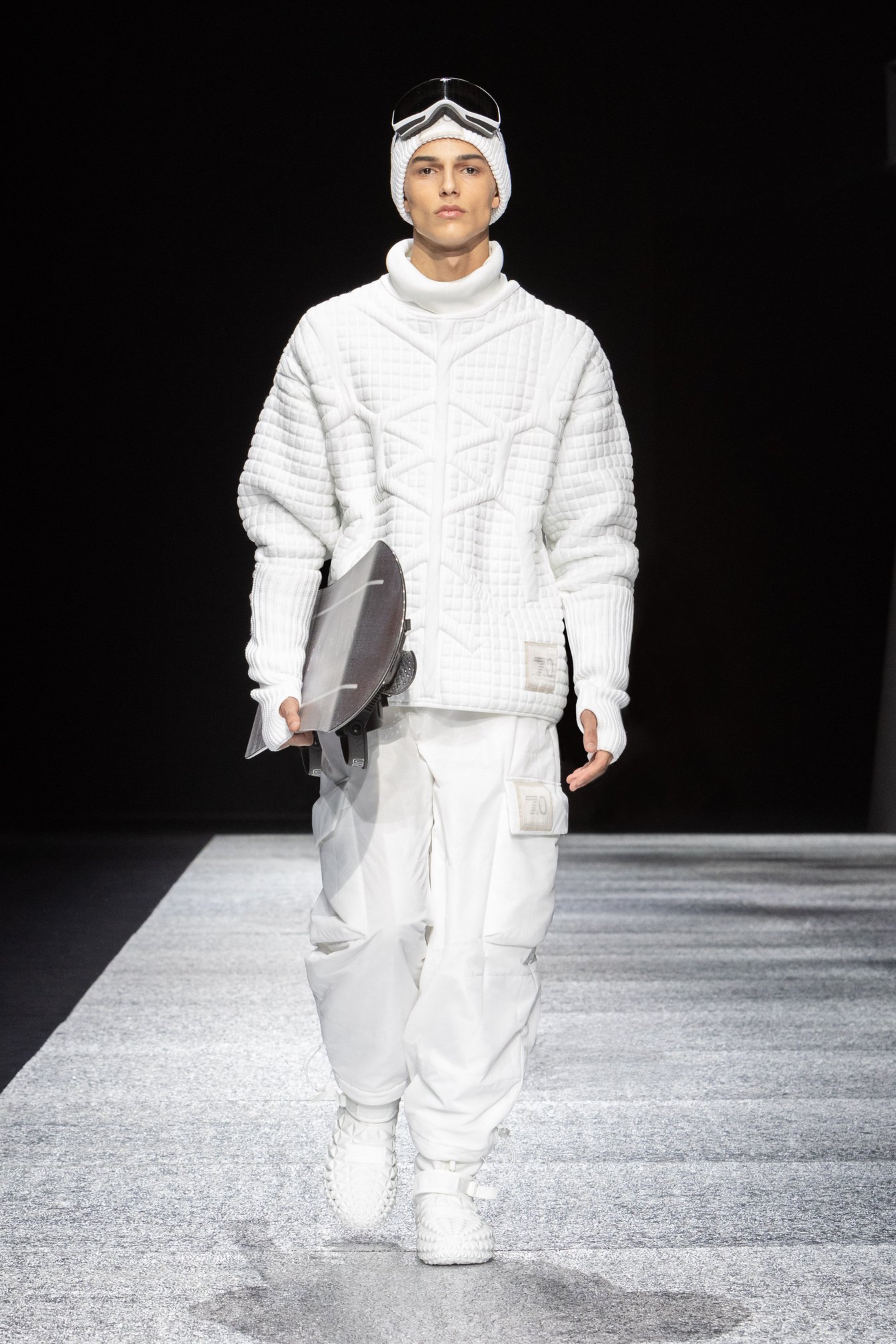 そして舞台は一転して、海から雪山へとシフト。オールホワイトのスキーウェアをまとったモデルたちがスキーやスノーボードを片手に登場した。雪の結晶を拡大した幾何学模様が随所に取り入れられ、コンテンポラリーなムードを漂わせる。