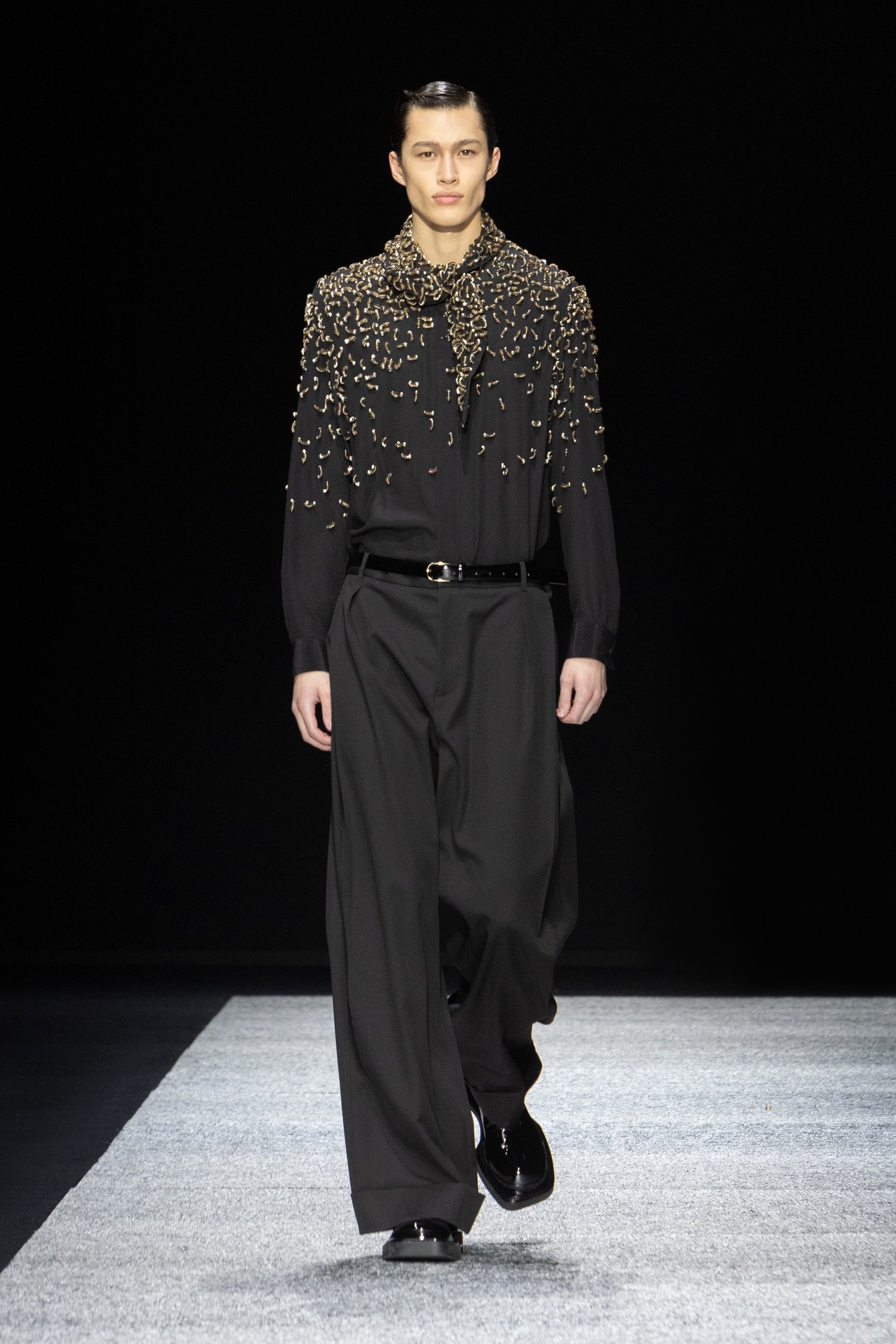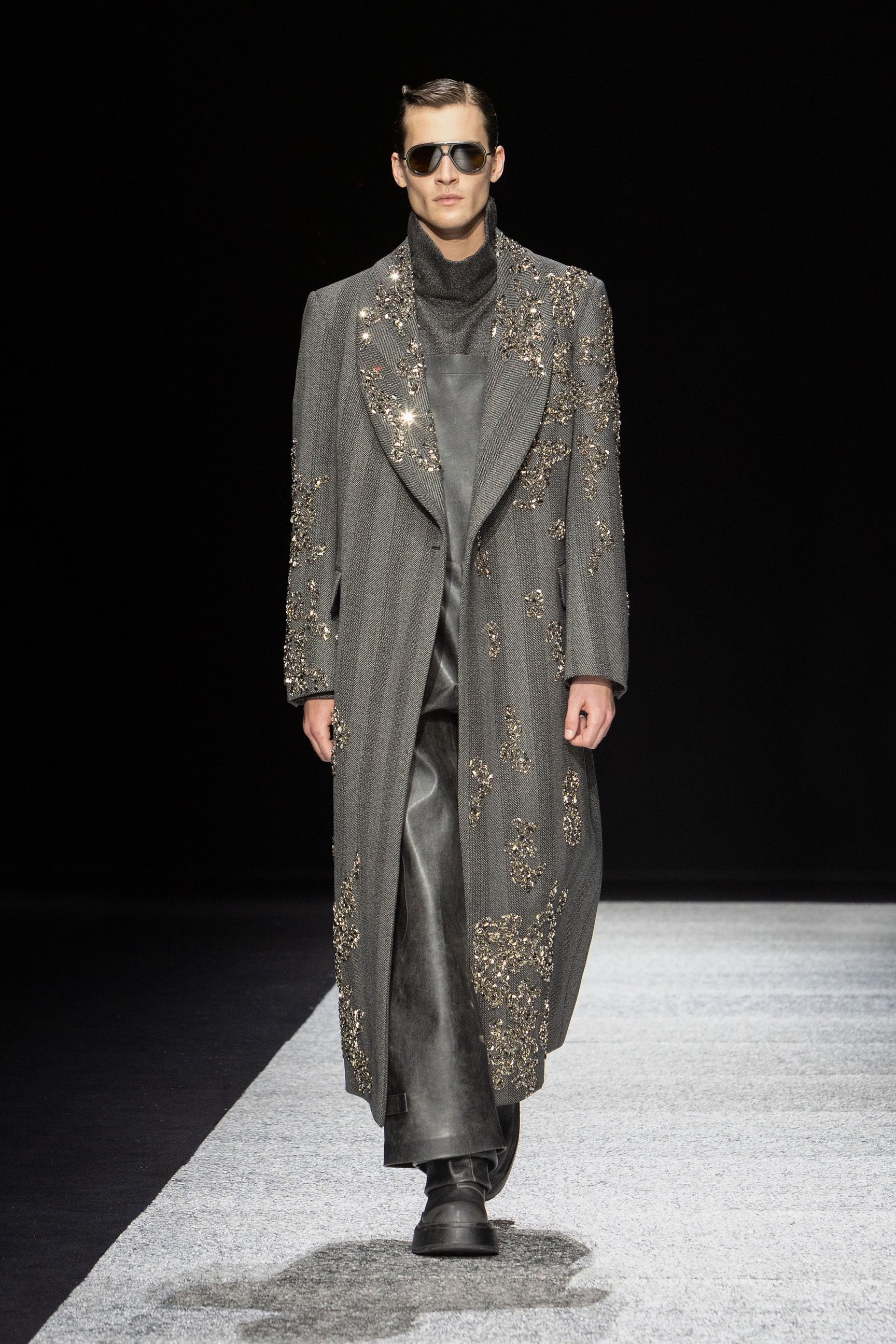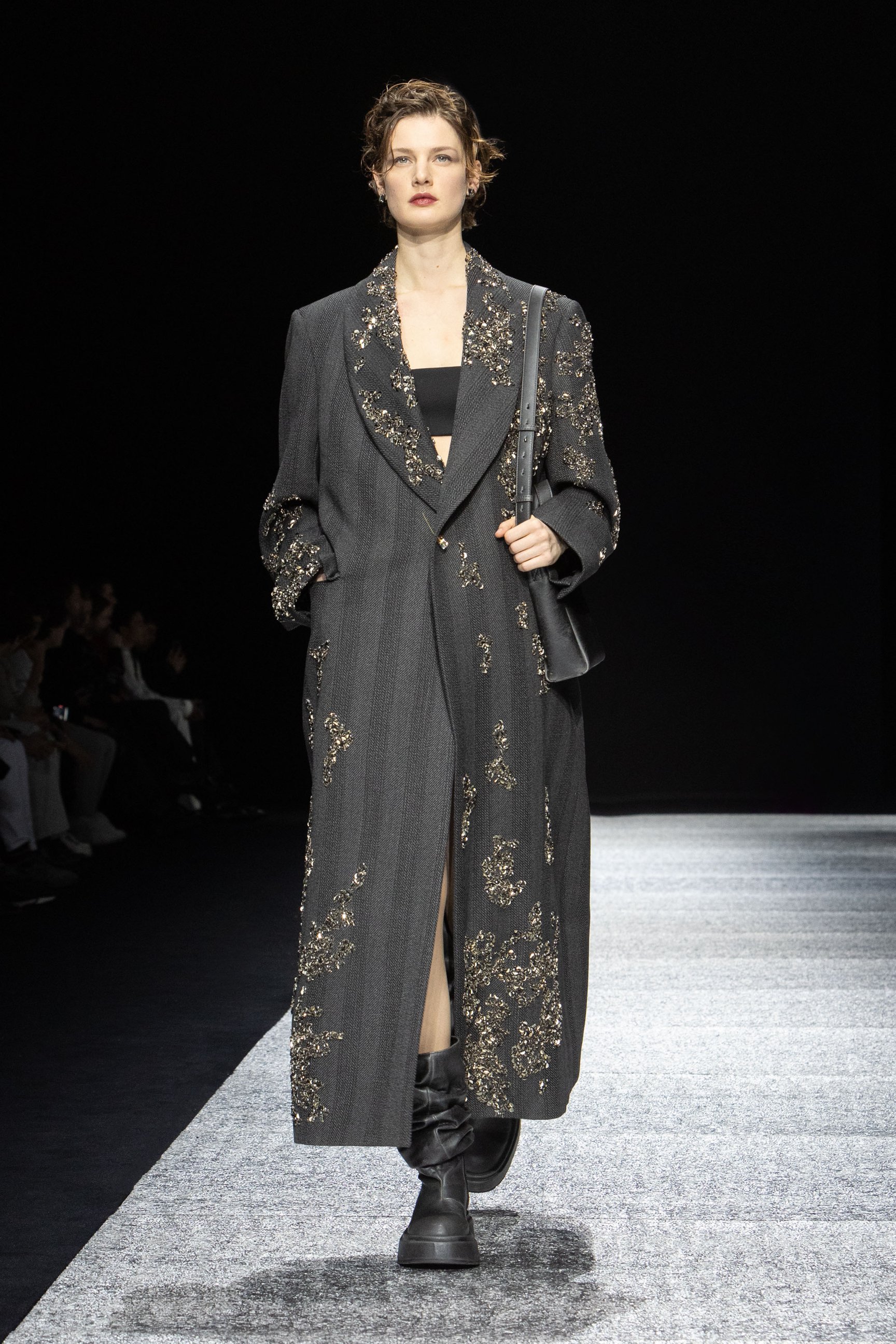 最後に登場したのはダークトーンのイヴニングウェア。メンズとウィメンズの要素を先鋭的に組み合わせたテーラードピースがバリエーション豊かに展開された。貝殻やフジツボ、サンゴを思わせるビジューの装飾がきらめき、艶やかなルックを完成させる。海の神秘性が繊細かつ大胆に表現され、アルマーニらしい華やかな装いがショーを締めくくった。