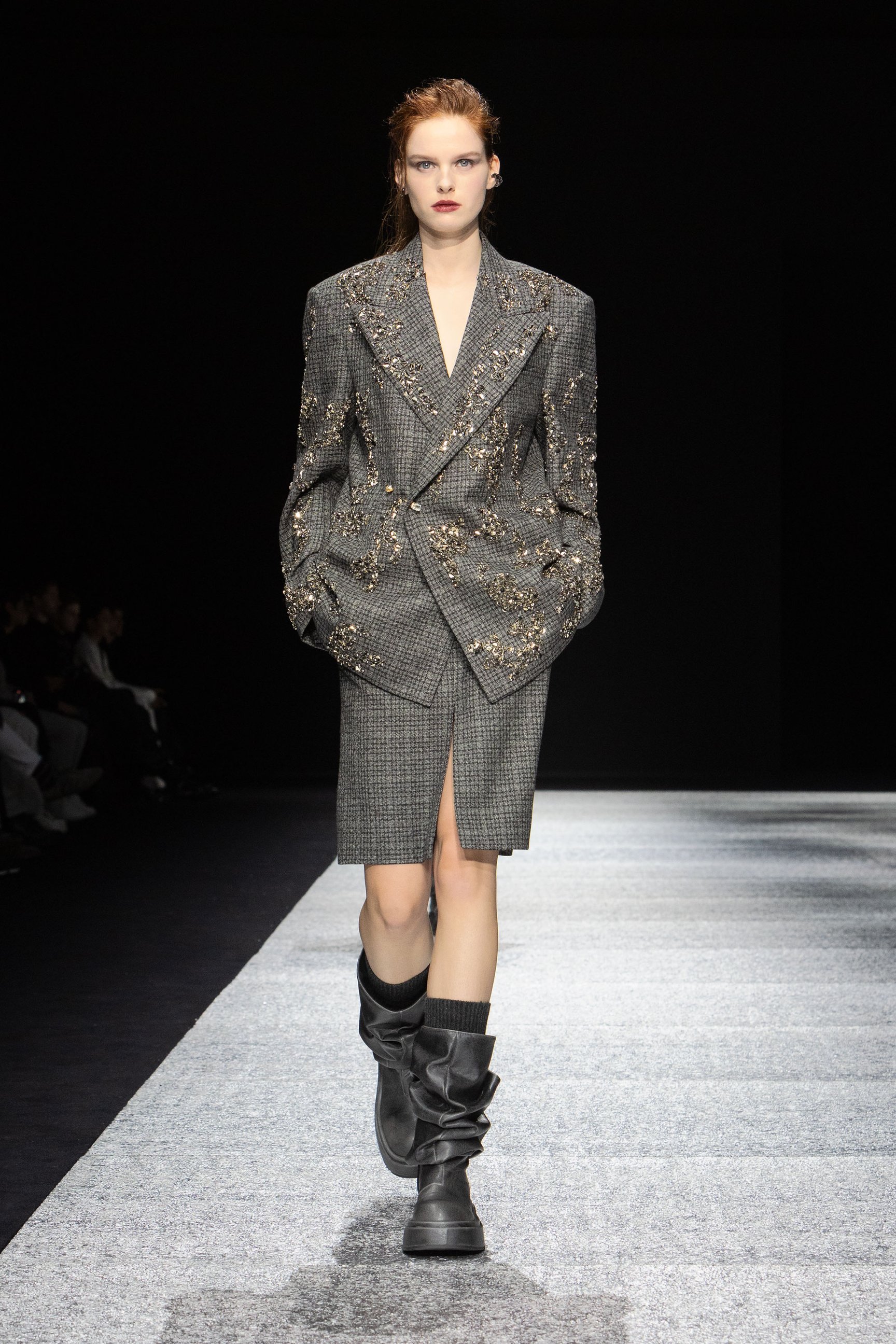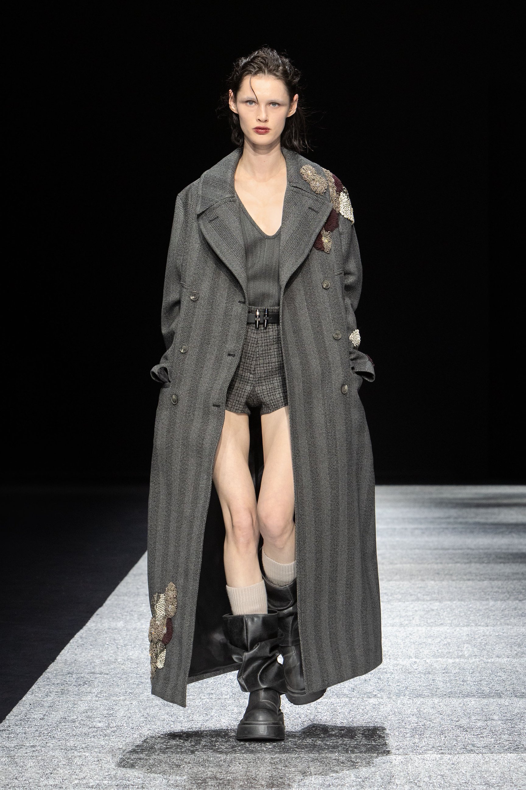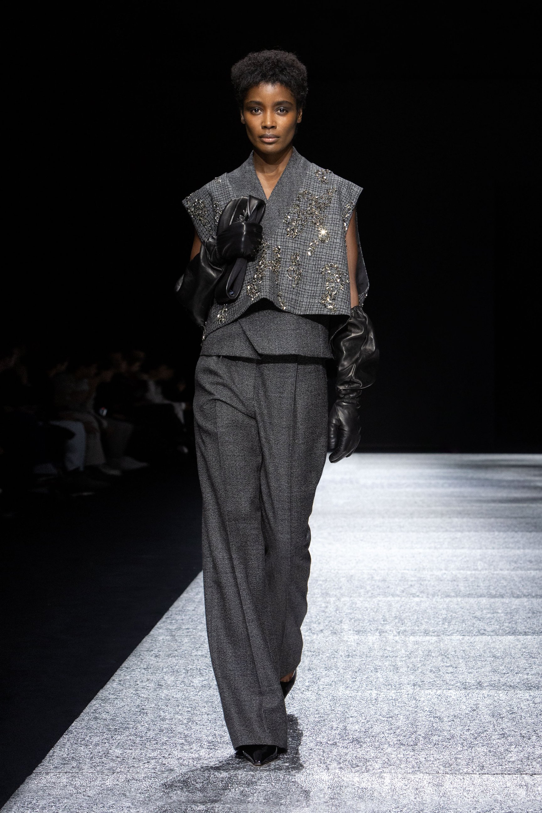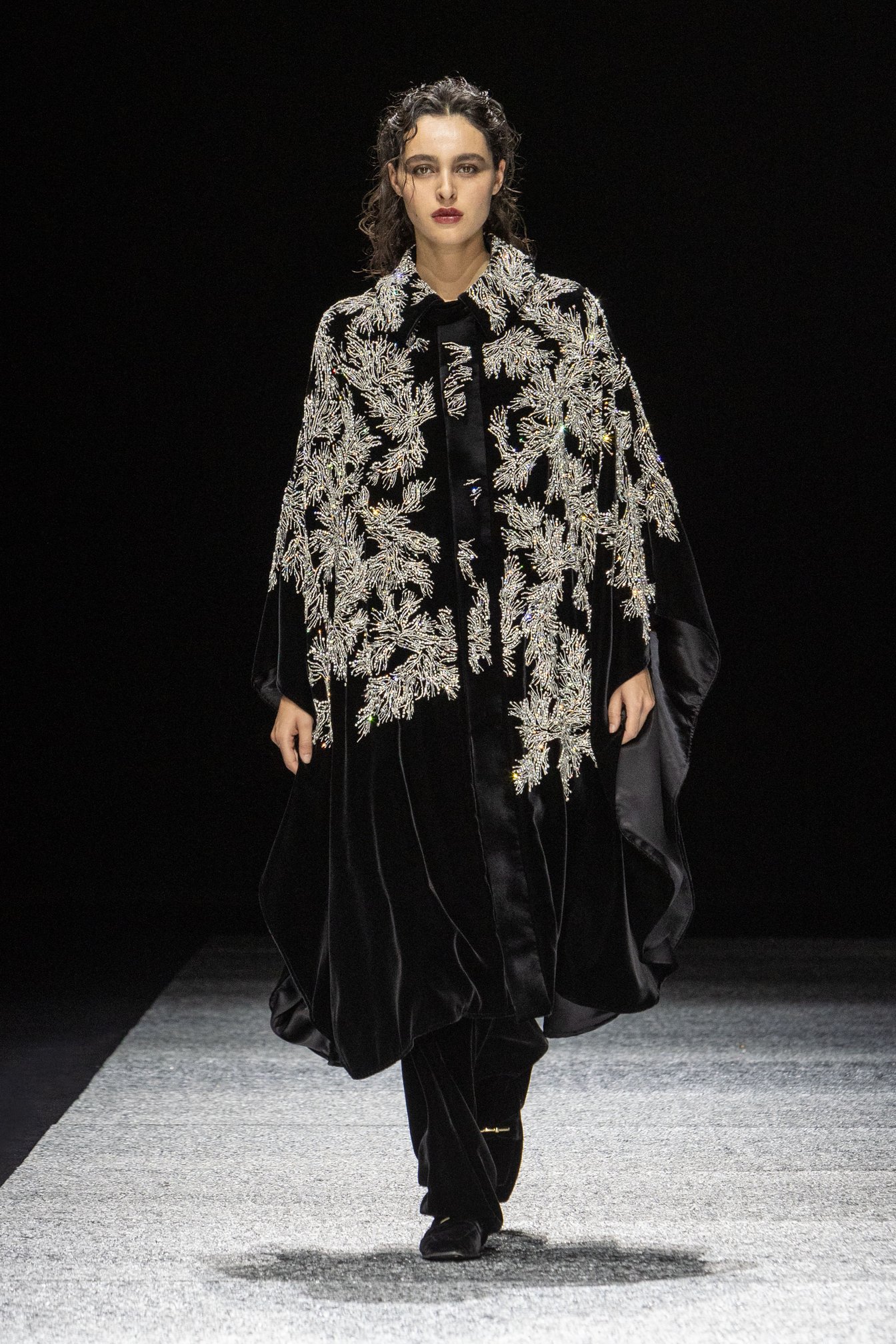 最後に登場したのはダークトーンのイヴニングウェア。メンズとウィメンズの要素を先鋭的に組み合わせたテーラードピースがバリエーション豊かに展開された。貝殻やフジツボ、サンゴを思わせるビジューの装飾がきらめき、艶やかなルックを完成させる。海の神秘性が繊細かつ大胆に表現され、アルマーニらしい華やかな装いがショーを締めくくった。