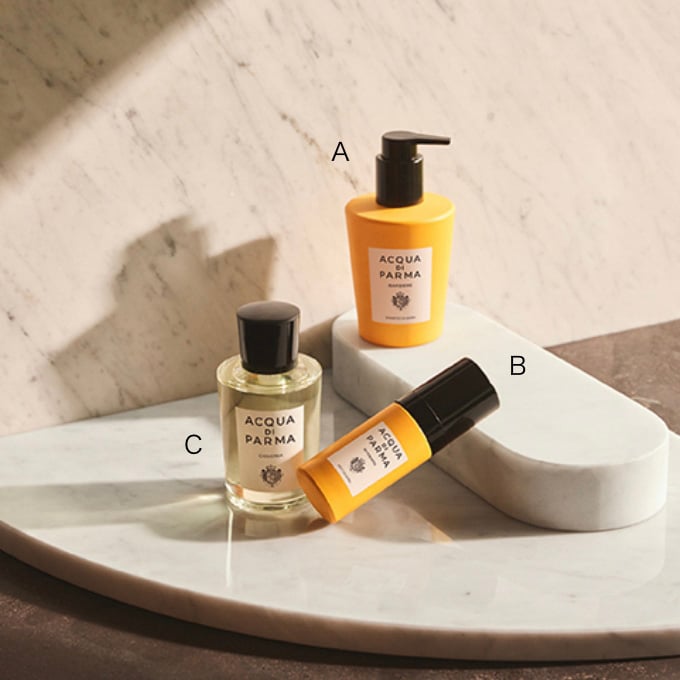 A:バルビエーレ ビアードウォッシュ(200mL、6490円)、B:バルビエーレ マルチ フェイスクリーム(50mL、1万5950円)、C:コロニア オーデコロン(100mL、2万4860円/いずれも税込)
