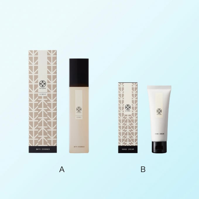 A:バスエッセンス(ヒノキ)(200mL、5500円)、B:ハンドクリーム(50g、3850円)