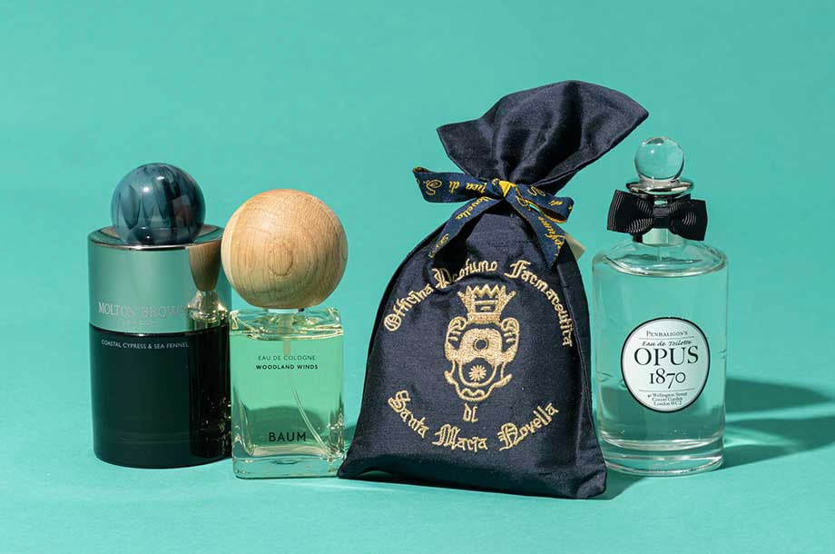 (左から)「モルトンブラウン」サイプレス&シーフェンネル コレクション C&S オードパルファン(100mL、2万2000円)、「バウム」オーデコロン1 ウッドランドウインズ(60mL、1万2100円)、「サンタ?マリア?ノヴェッラ」シルクサシェ(7480円)、「ペンハリガン」オーパス1870オードトワレ(100mL、2万2550円/いずれも税込)