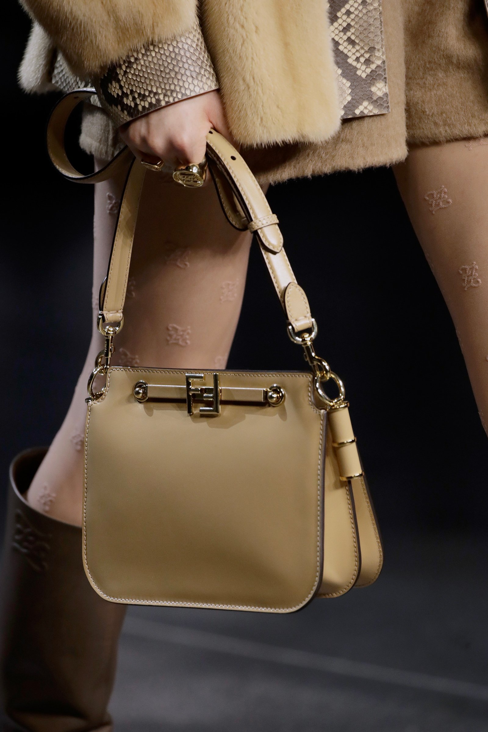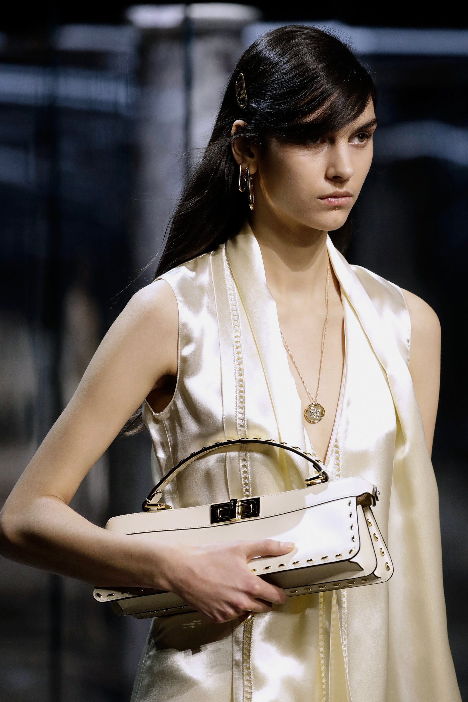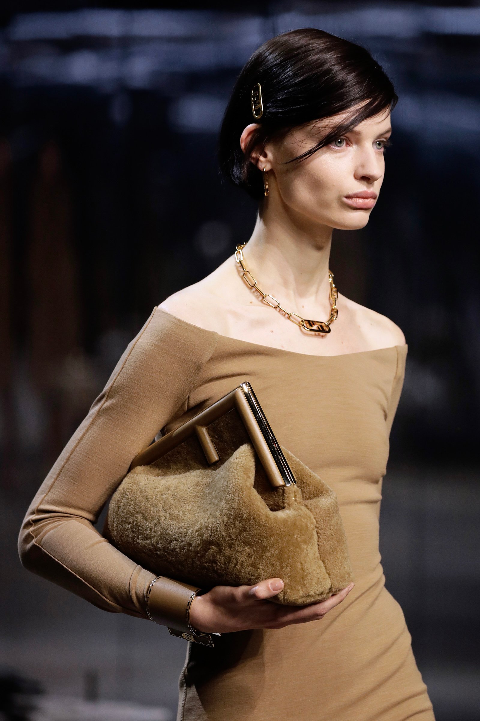 今回のコレクションで新作バッグ「フェンディ ファースト(FENDI First)」がデビュー。クラッチバッグの上部に「F」を象った金具をデザインし、シアリングやレザー、エキゾチックレザーといった様々な素材とサイズで登場した。