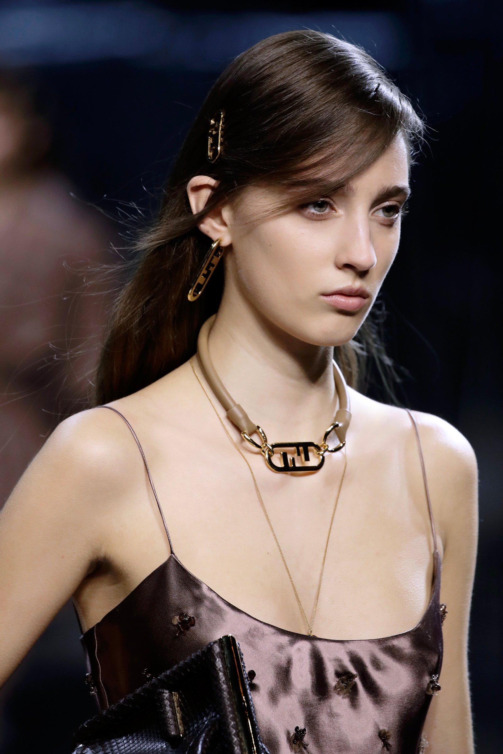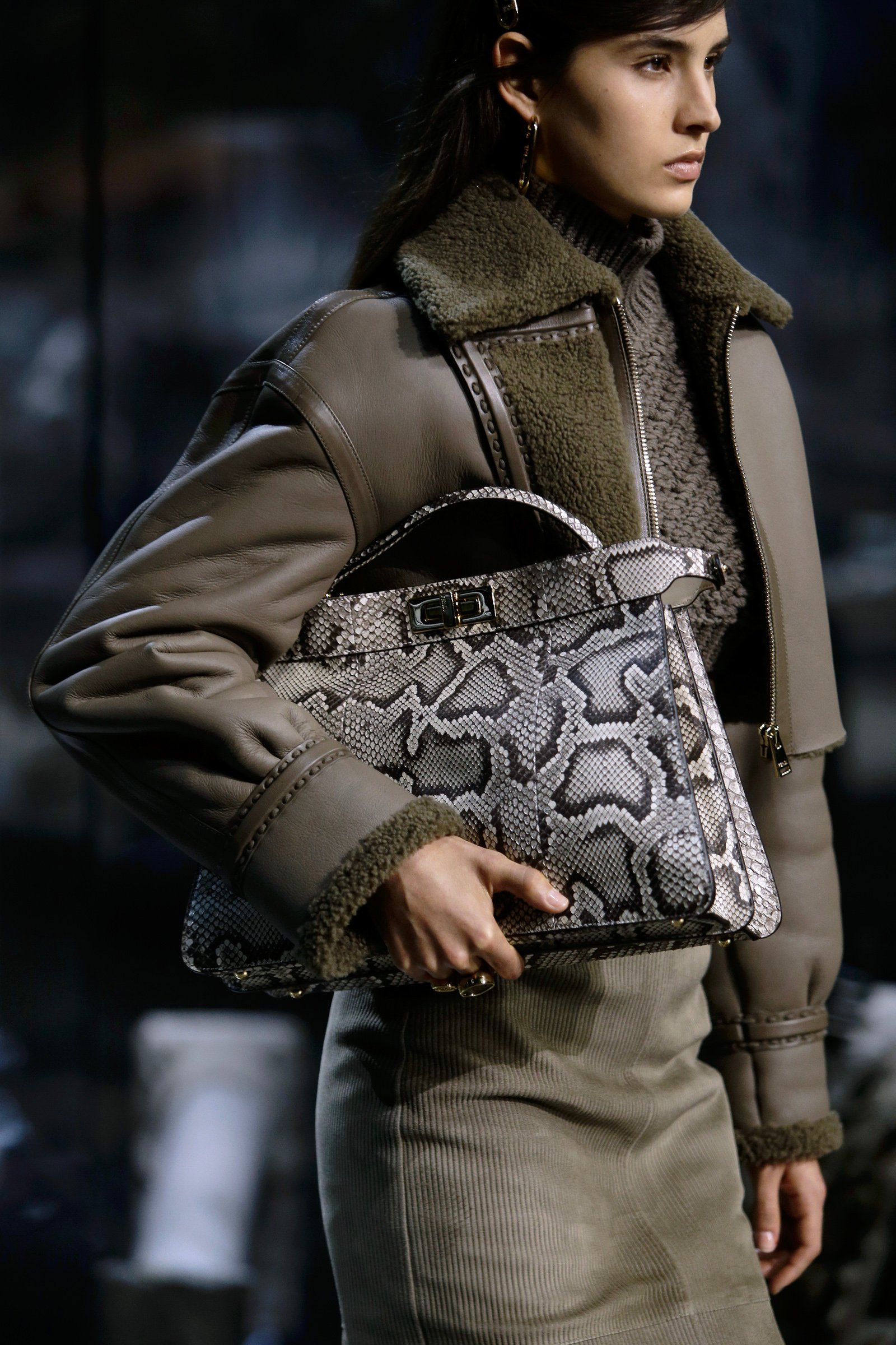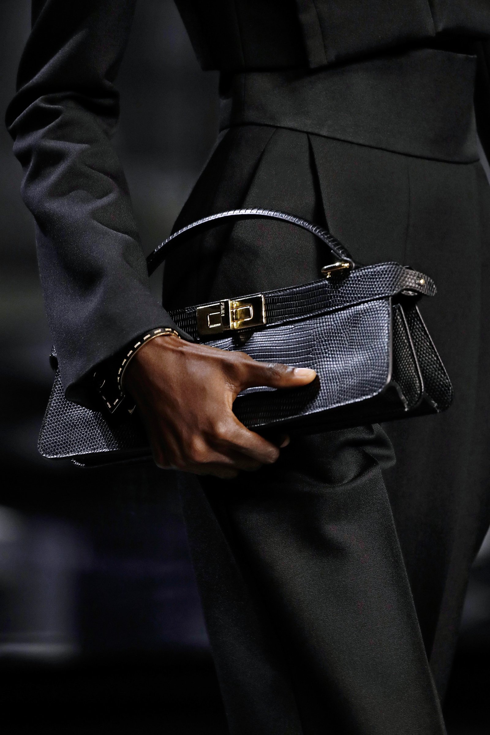 今回のコレクションで新作バッグ「フェンディ ファースト(FENDI First)」がデビュー。クラッチバッグの上部に「F」を象った金具をデザインし、シアリングやレザー、エキゾチックレザーといった様々な素材とサイズで登場した。