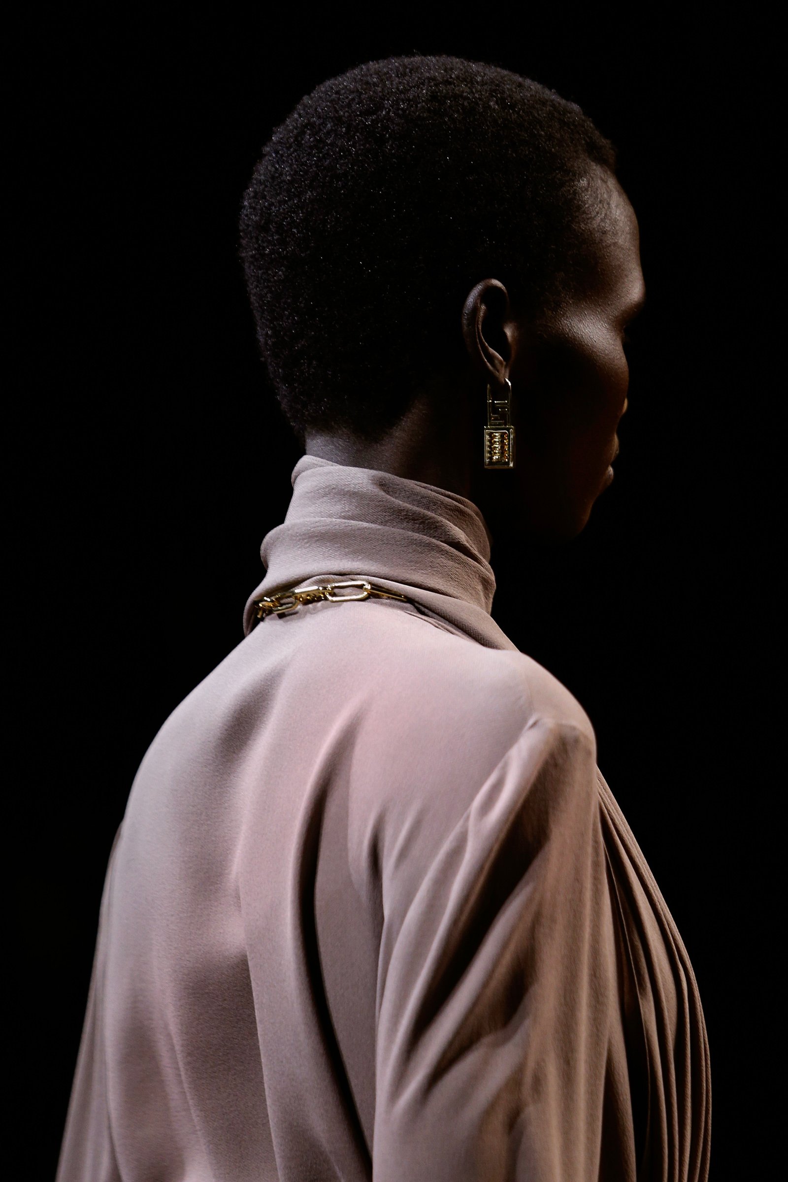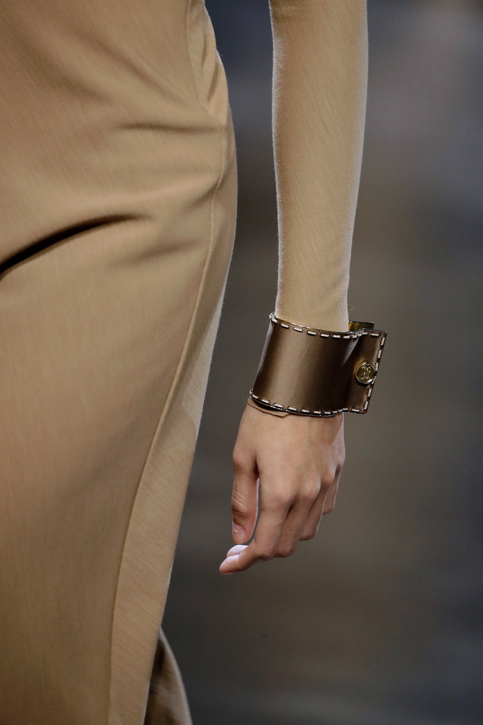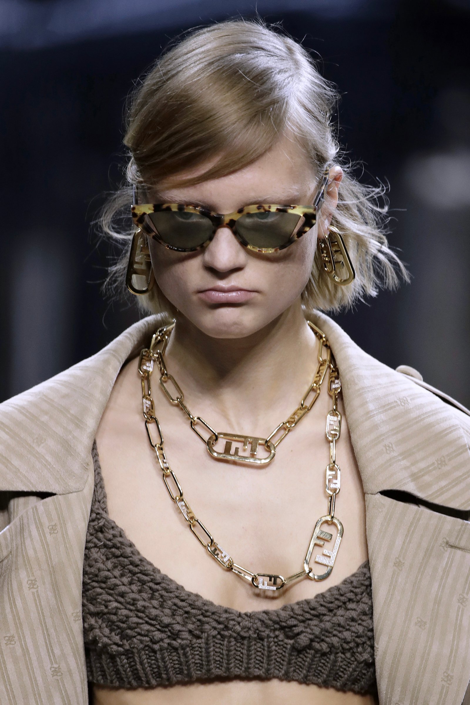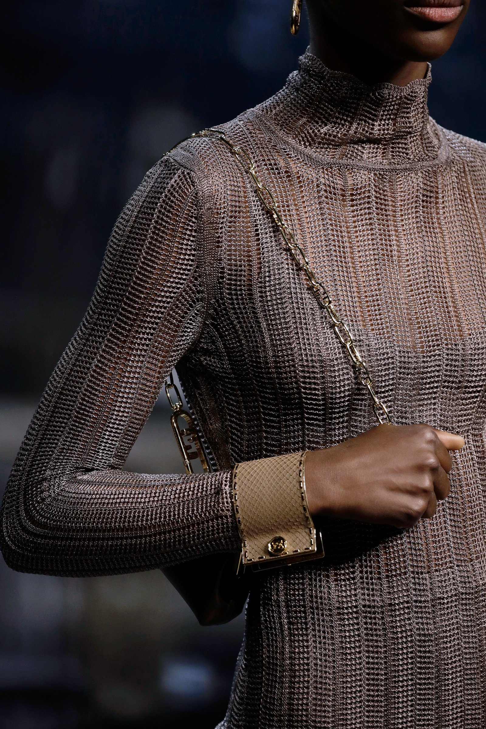 また「カーリグラフィ」をスタンプしたワックスシールをデザインしたペンダント、メタルカフスといったフェンディウーマンのエンパワーメントな感性を反映したジュエリーが、新生「フェンディ」のグラフィカルでモダンなスタイルを飾った。
