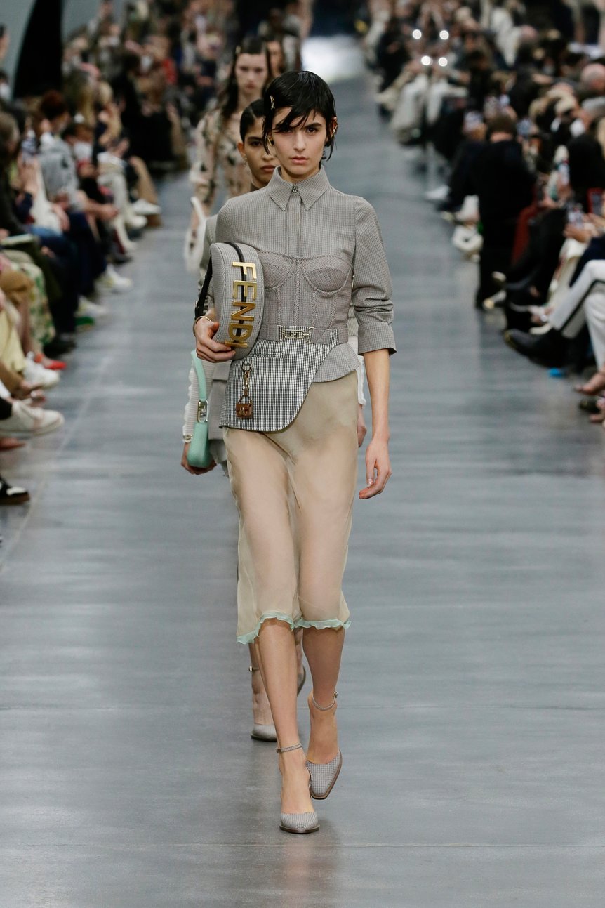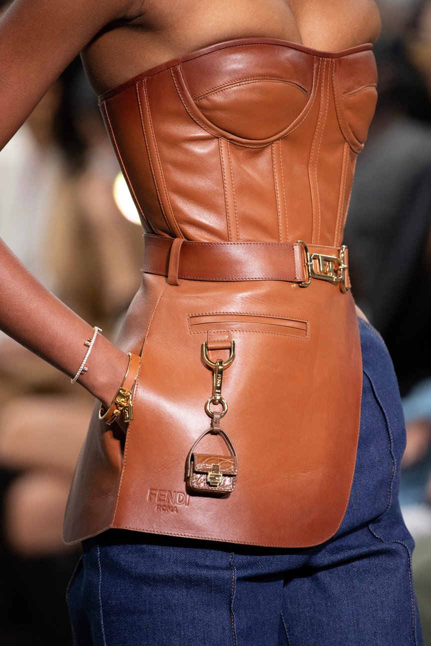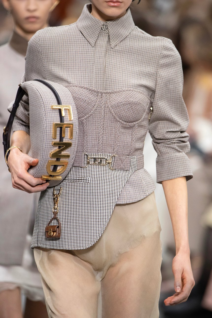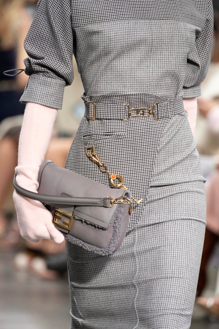 今シーズンの特徴的なアイテムのひとつが、ウェアと共地のベルト。ウエストマークを強調するとともに、スマートフォンを入れることができるポケットが機能的で、フェンディの実用主義を象徴している。ランウェイではさらに、極小サイズのバゲットバッグがチャームとなってアクセントに。