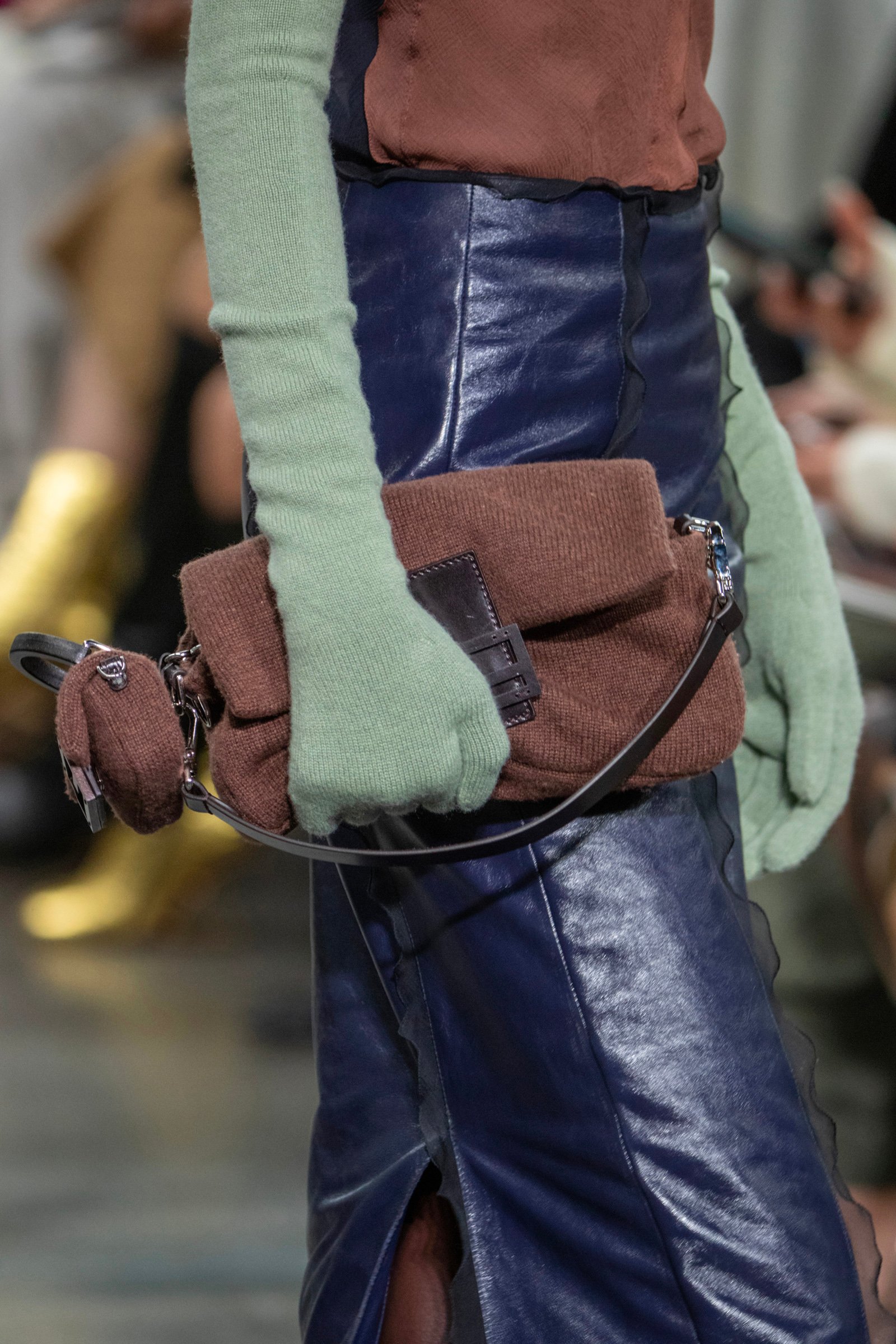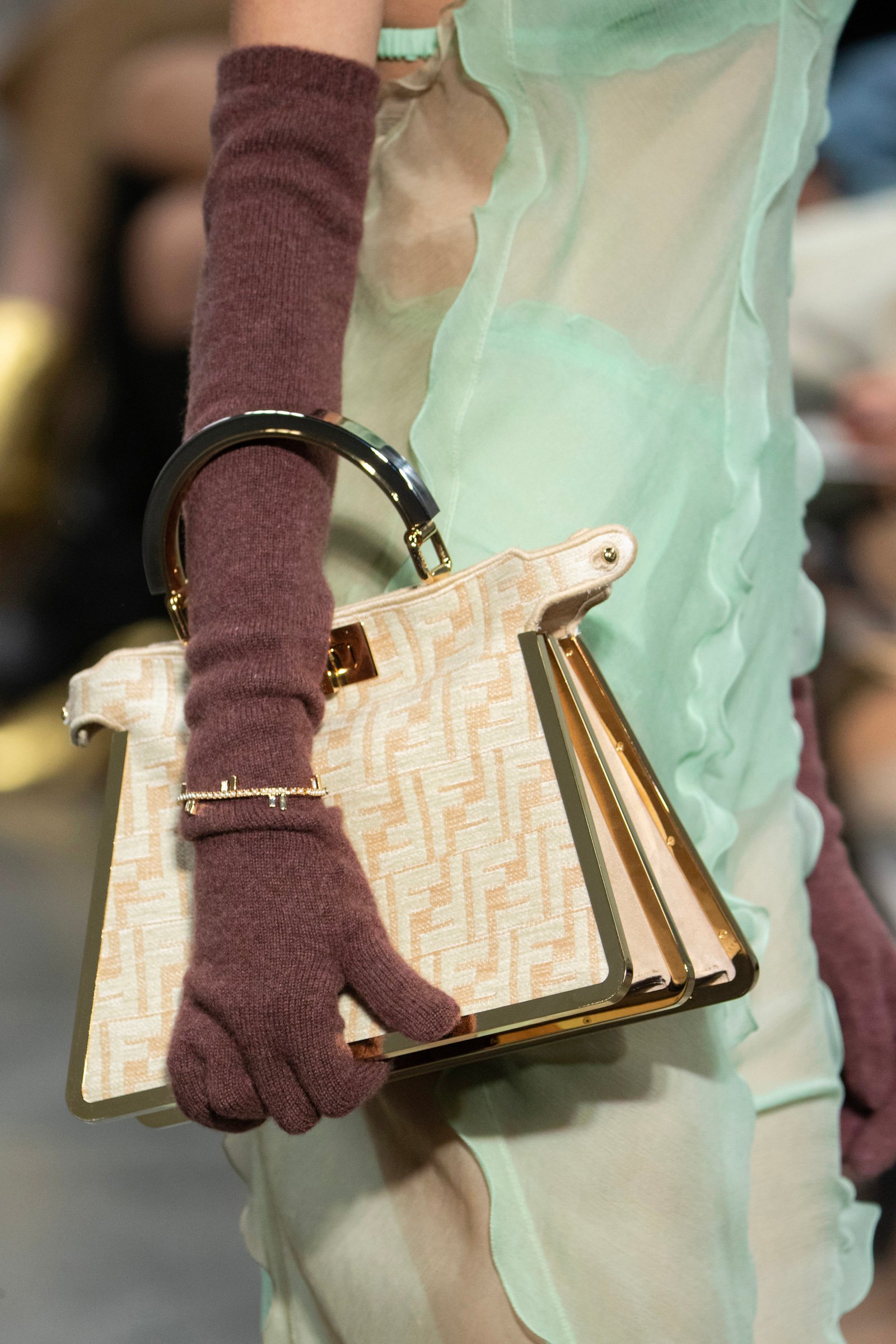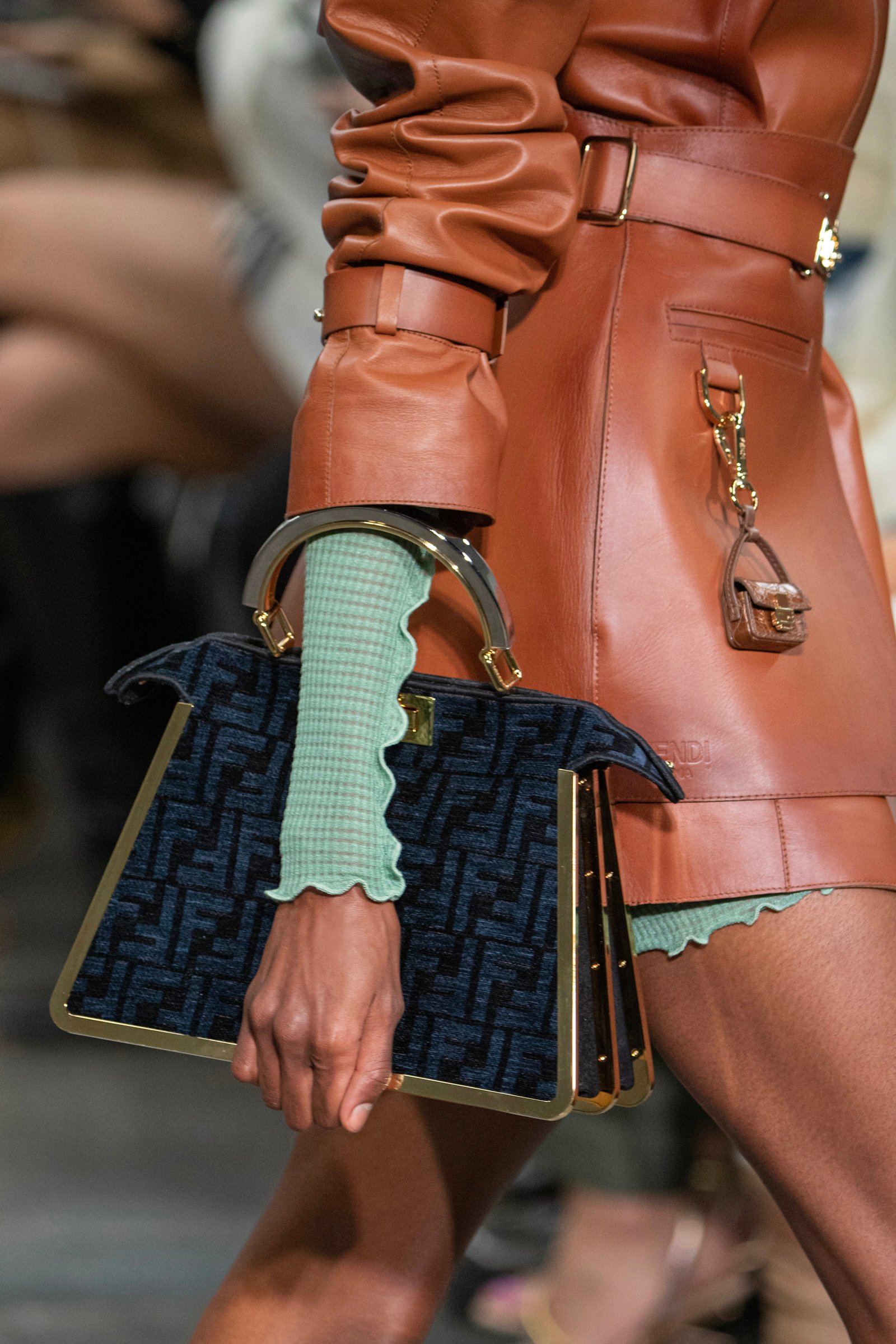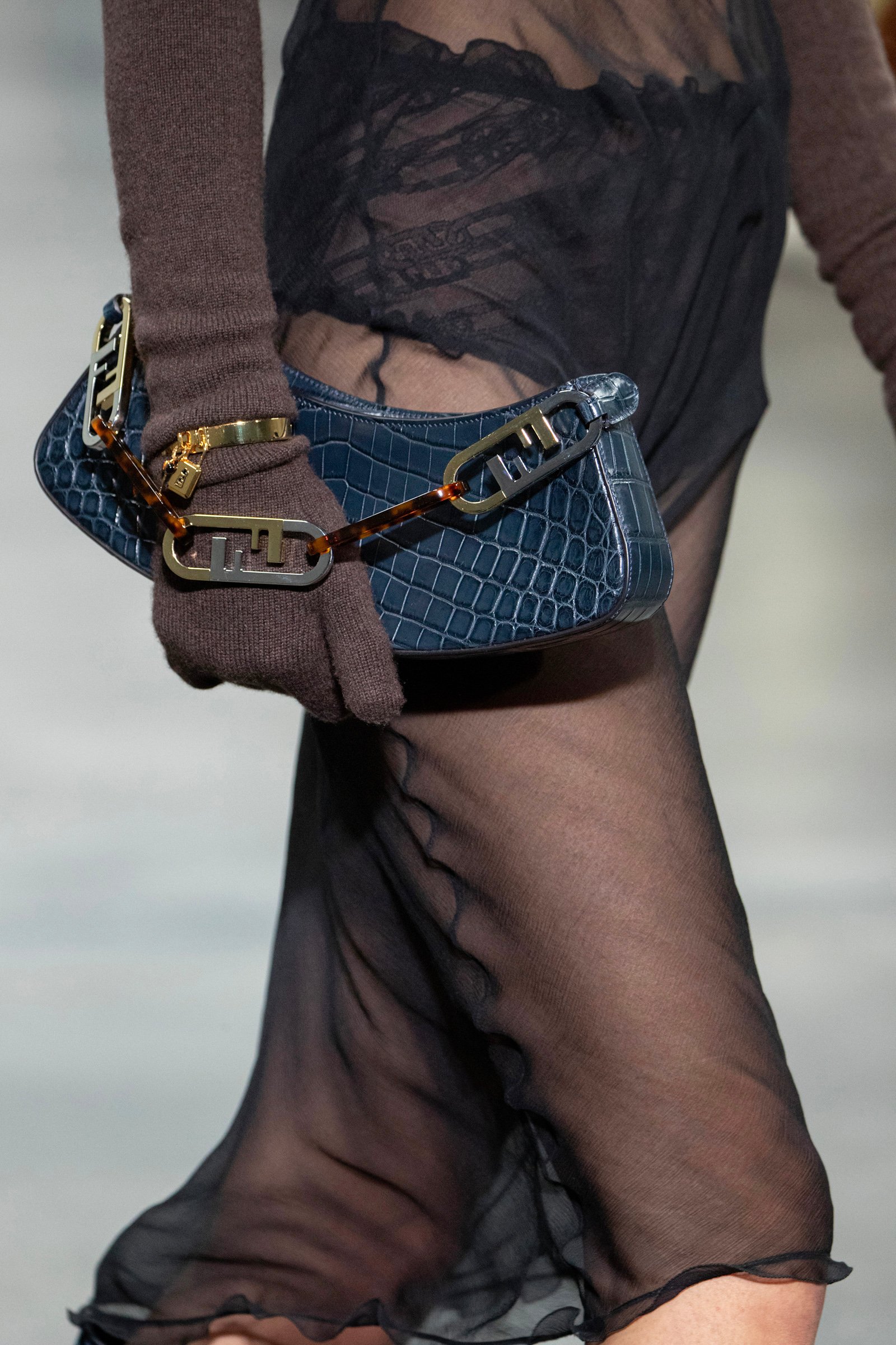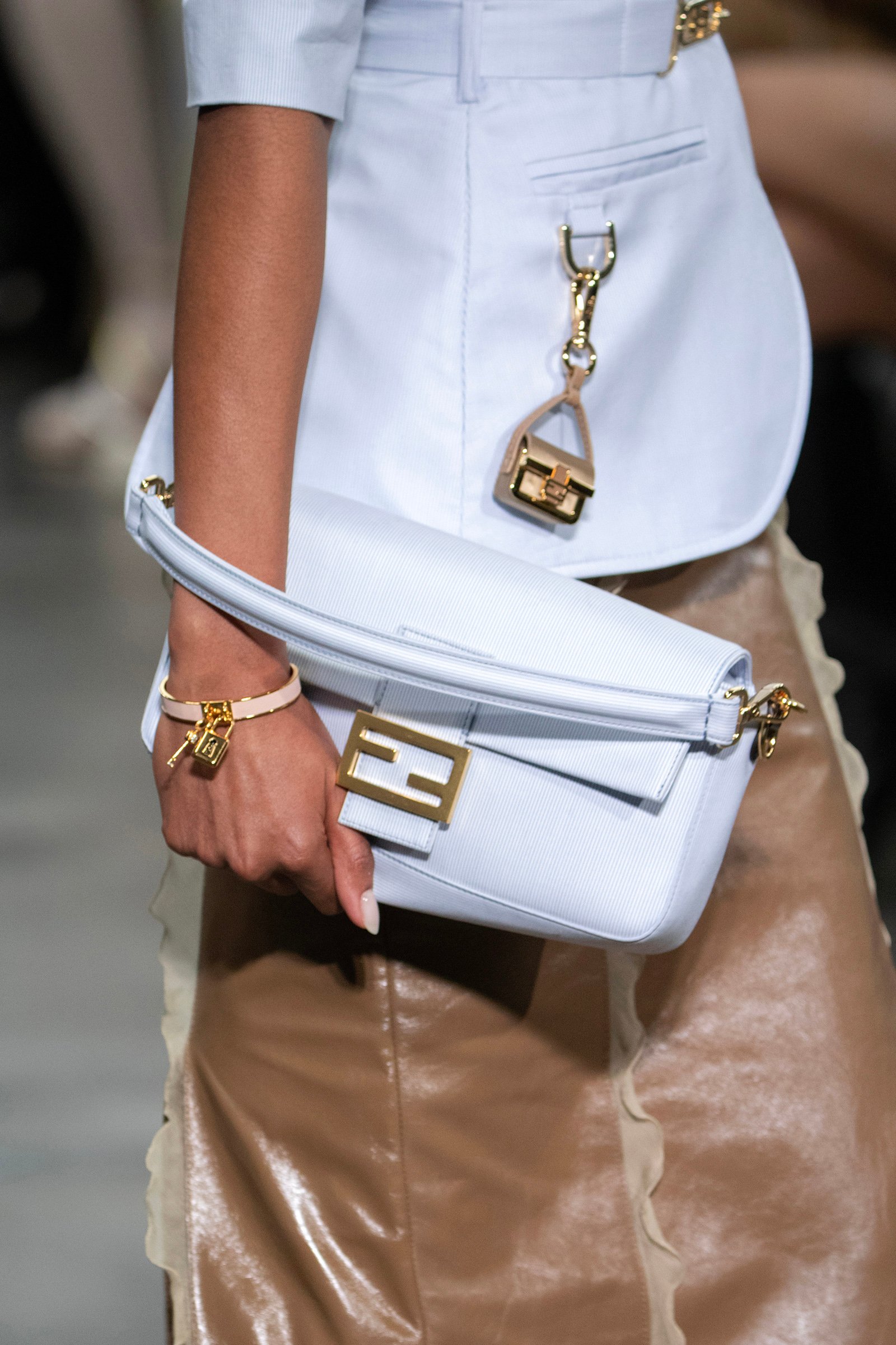 今シーズンの特徴的なアイテムのひとつが、ウェアと共地のベルト。ウエストマークを強調するとともに、スマートフォンを入れることができるポケットが機能的で、フェンディの実用主義を象徴している。ランウェイではさらに、極小サイズのバゲットバッグがチャームとなってアクセントに。