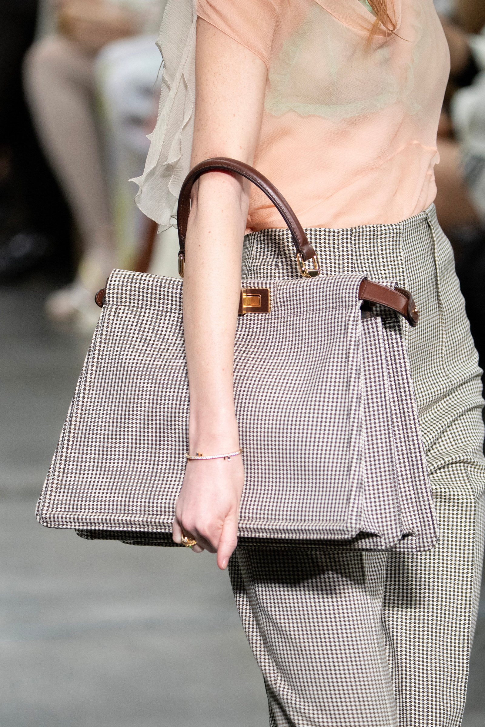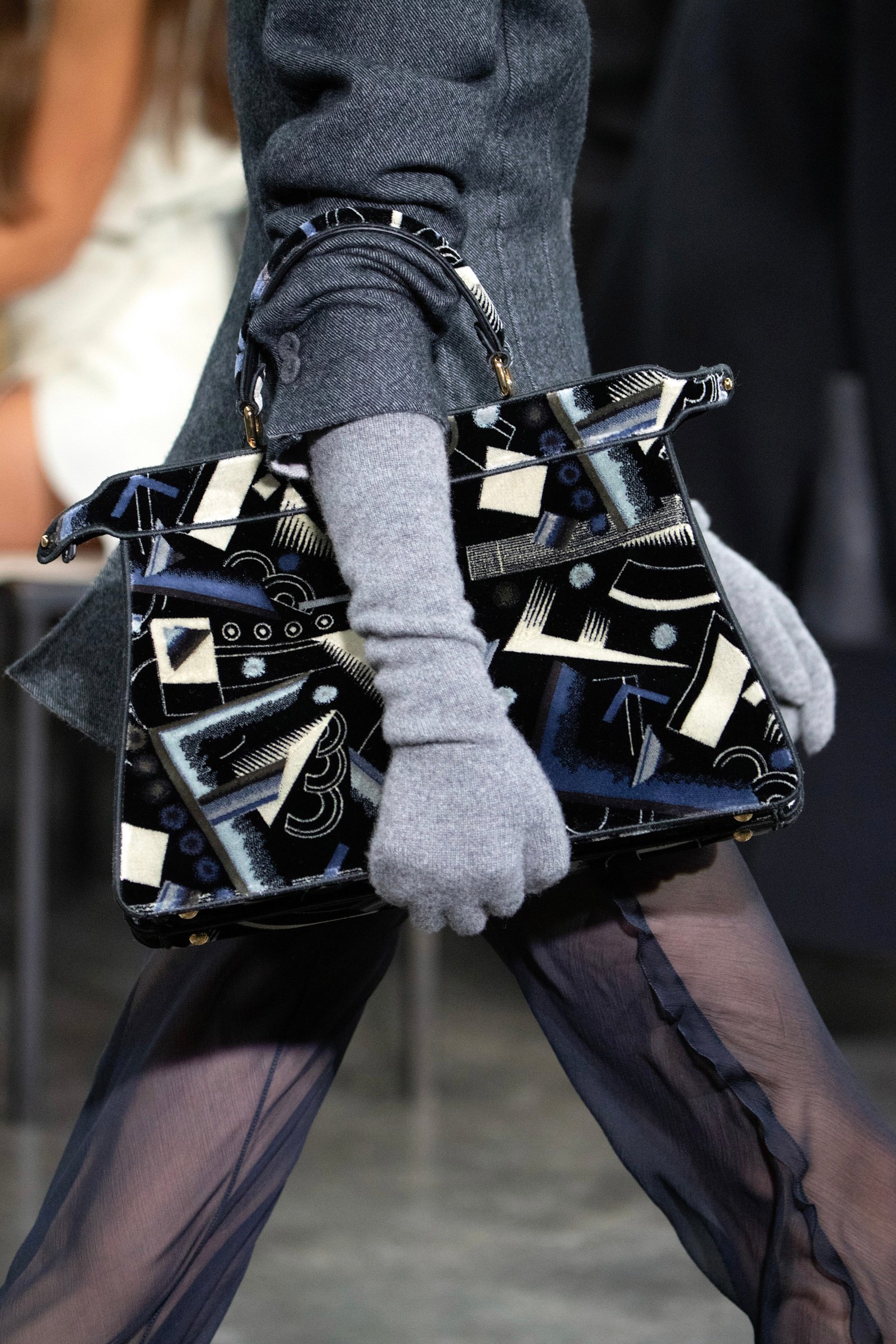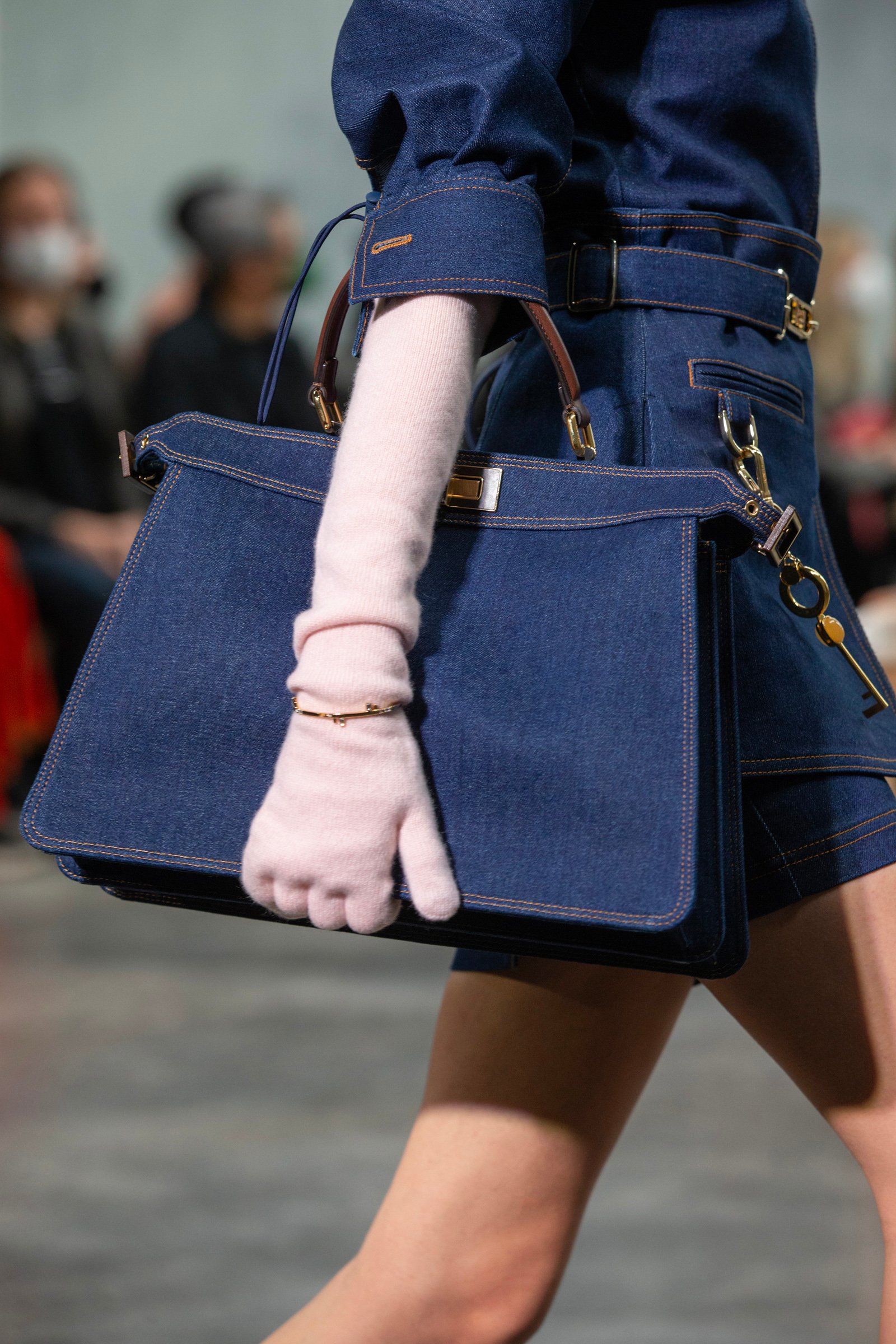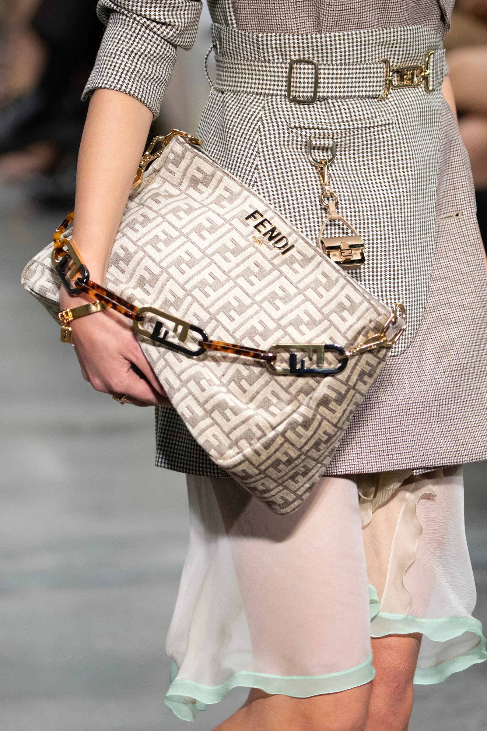 今シーズンの特徴的なアイテムのひとつが、ウェアと共地のベルト。ウエストマークを強調するとともに、スマートフォンを入れることができるポケットが機能的で、フェンディの実用主義を象徴している。ランウェイではさらに、極小サイズのバゲットバッグがチャームとなってアクセントに。