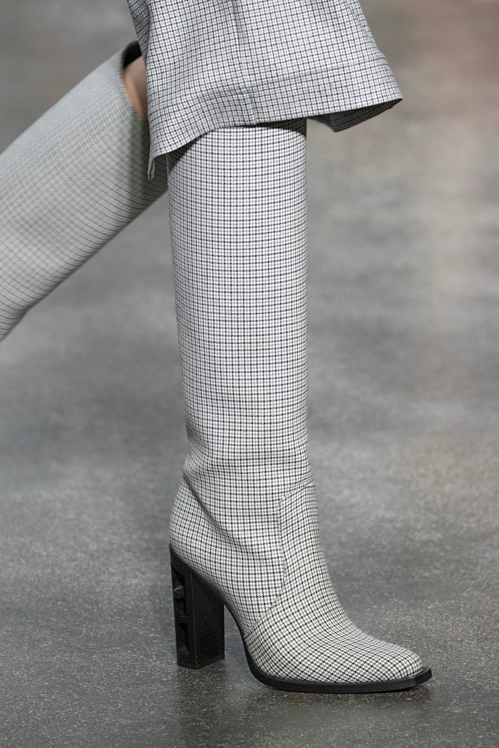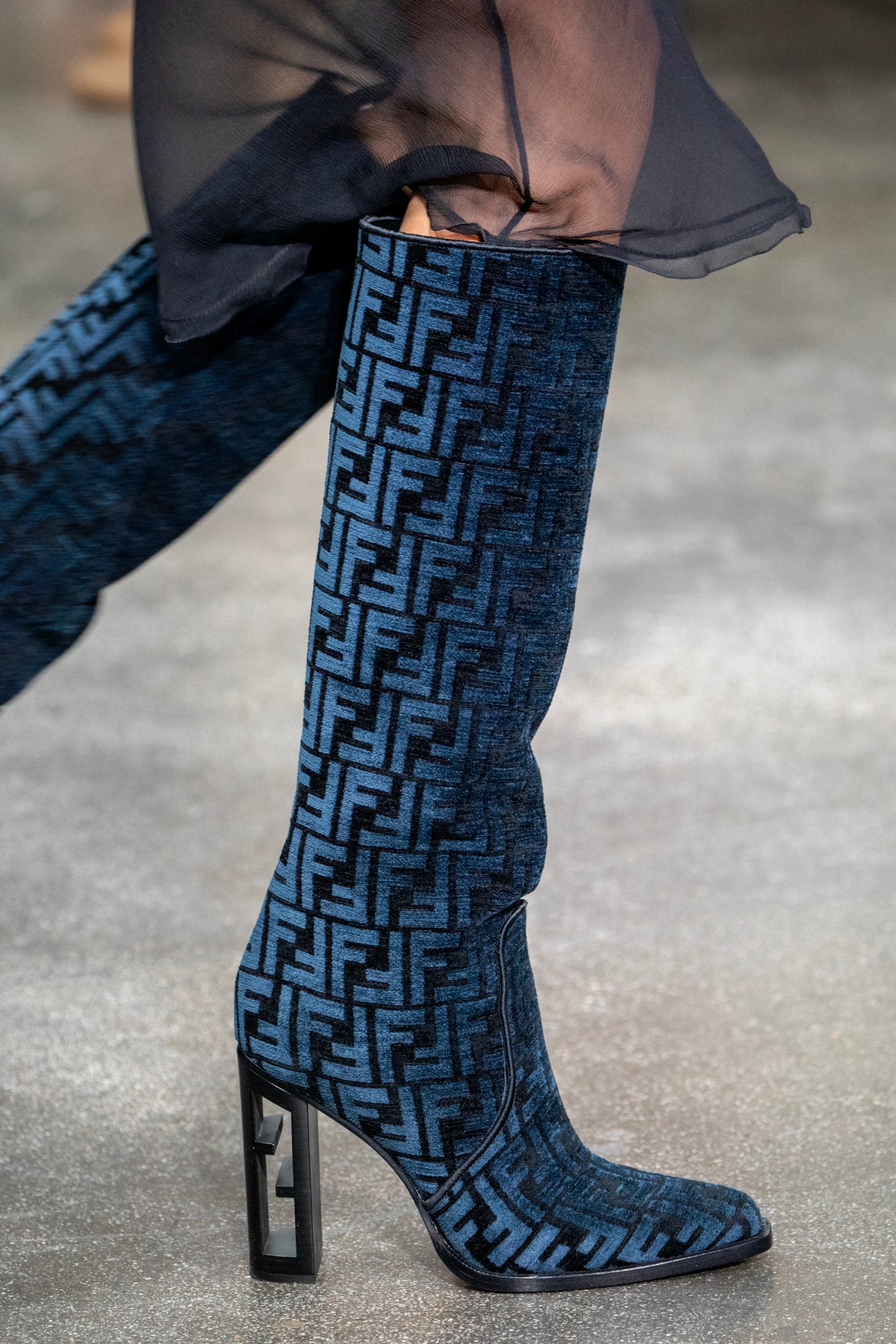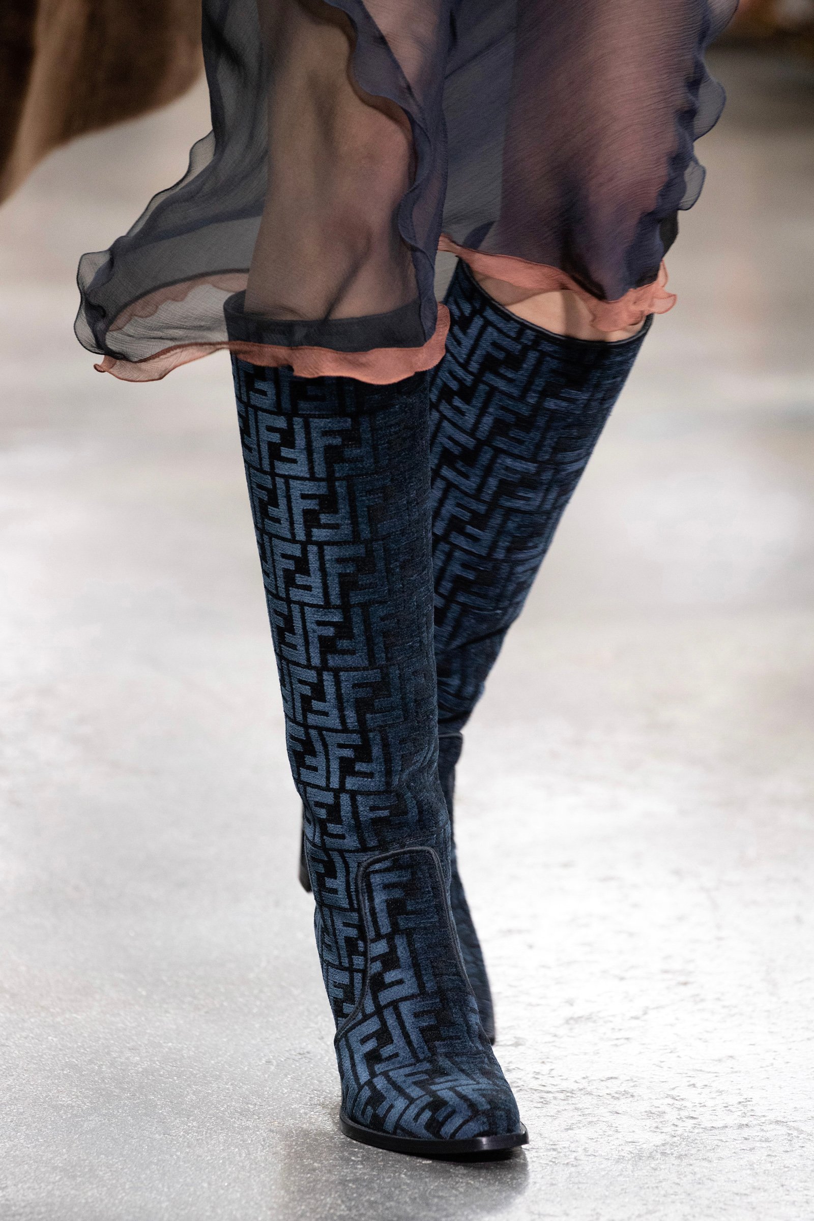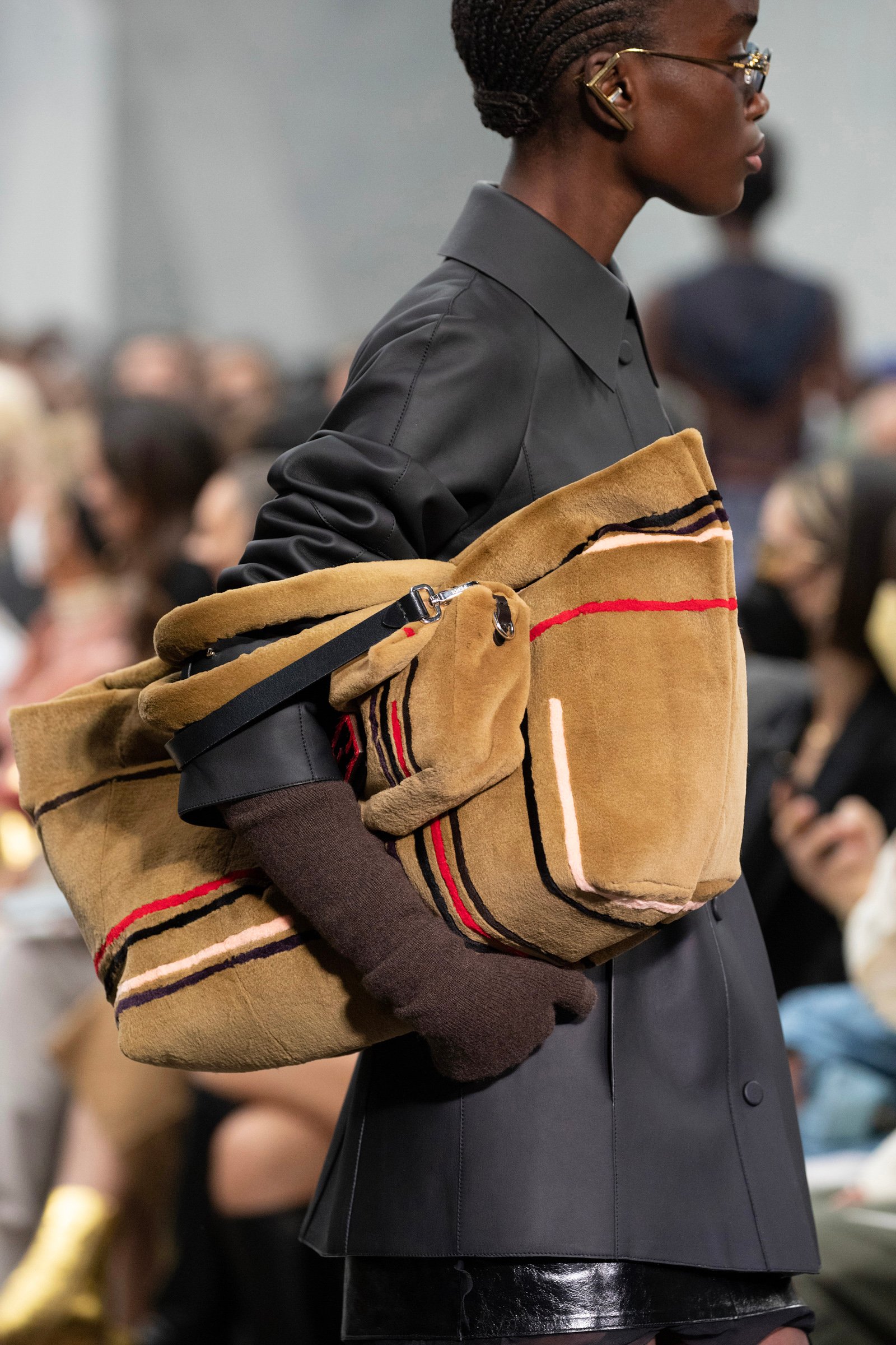 今シーズンの特徴的なアイテムのひとつが、ウェアと共地のベルト。ウエストマークを強調するとともに、スマートフォンを入れることができるポケットが機能的で、フェンディの実用主義を象徴している。ランウェイではさらに、極小サイズのバゲットバッグがチャームとなってアクセントに。