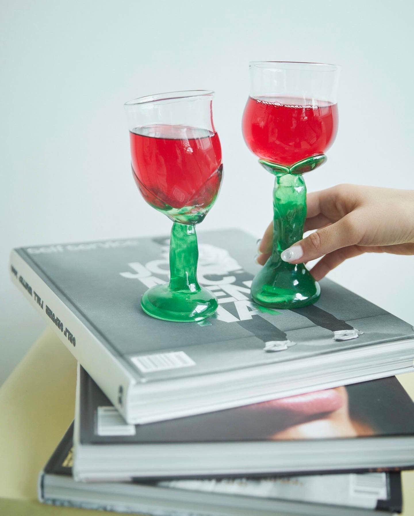 花をモチーフにした作品を制作するようになったきっかけは、自身の趣味でもある登山。夏は北アルプスの花が有名な山の山小屋で働いているという岩本は、高山帯の厳しい環境でも風雨に耐えて咲く花の生命力に、ガラスの素材としての力強さと共通する魅力を感じたという。昨年からは「リトルサニーバイト(little sunny bite)」とコラボレーションし、ワインを注ぐと花弁に色がついたように見えるチューリップ型のゴブレットを販売しているほか、花の生命力を意識したオブジェなどを制作している。