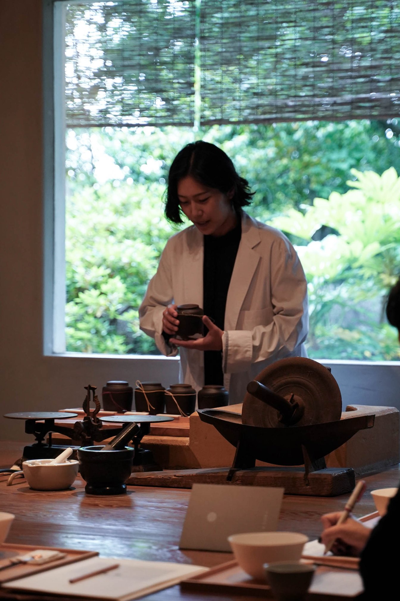 OGATAに香りの原材料を提供しているのは、京都の香老舗「松栄堂」。五行と五味の原材料について女性スタッフが丁寧に説明