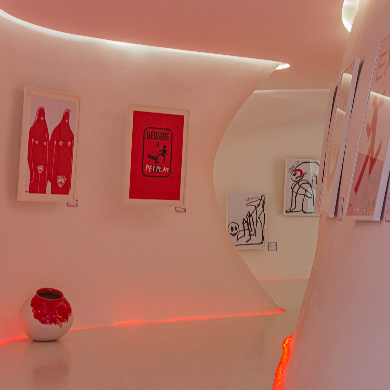 第1号店、梨泰院のフラッグシップショップ内。細長い通路の壁面を若手アーティストの作品が埋め尽くす。もちろんすべて購入可能
