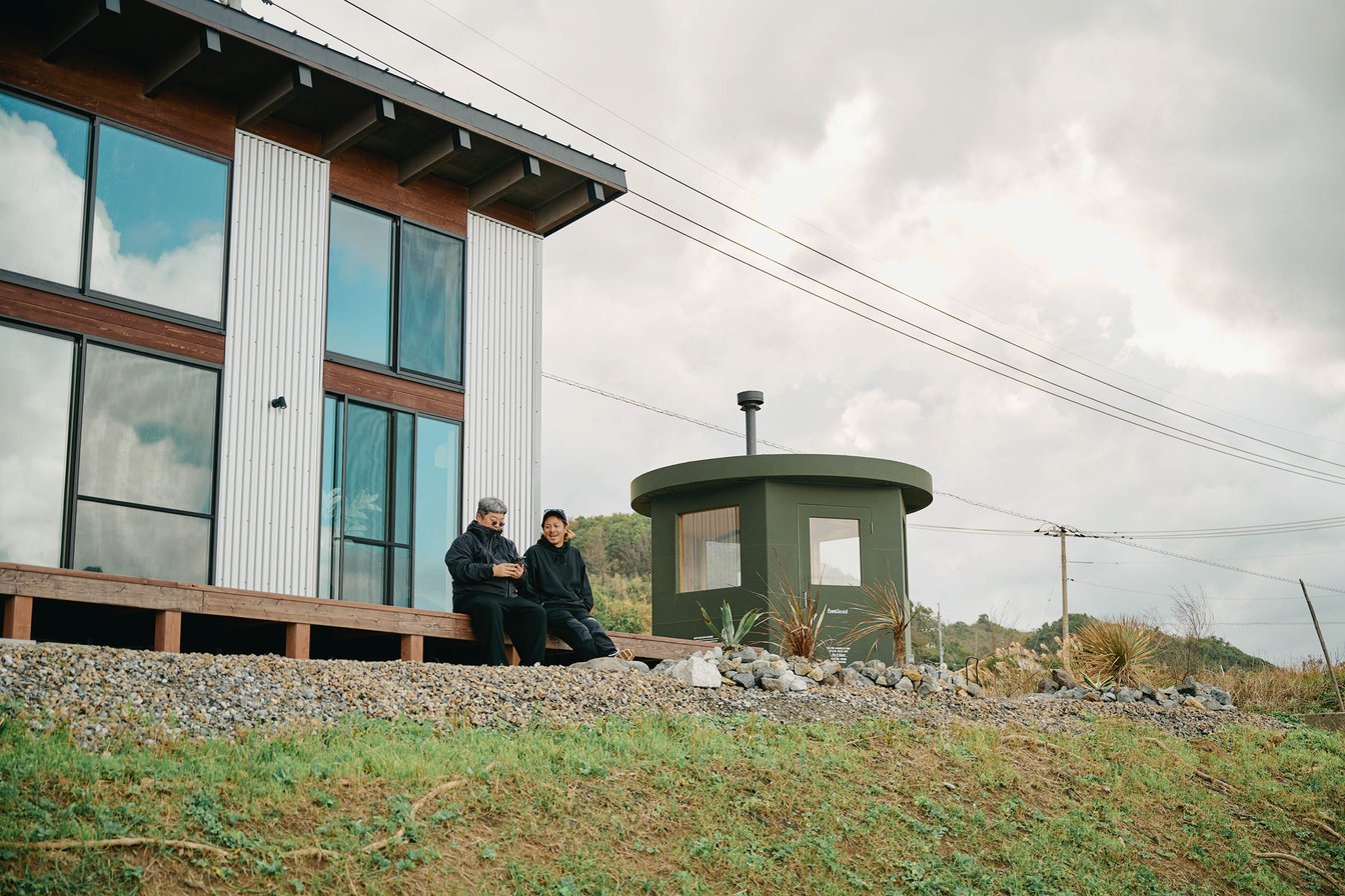 萩?石見空港から車で約5分(こちらも好アクセス)。日本海を一望する海辺に位置する2階建のモデルハウスは、3?4人が宿泊可能です。