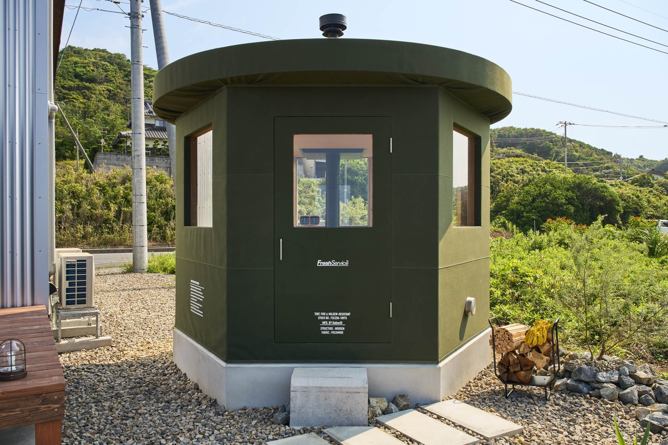 サウナは、六角柱のコロンとした造形が特徴。フレッシュサービスが掲げるコンセプトの中から、「アーミー」のエッセンスをピックアップし、モデルハウスが日本海を一望できるロケーションでもあることから、「監視塔」をイメージソースに“ミリタリー?テント?サウナ”を再構築?デザインしました。