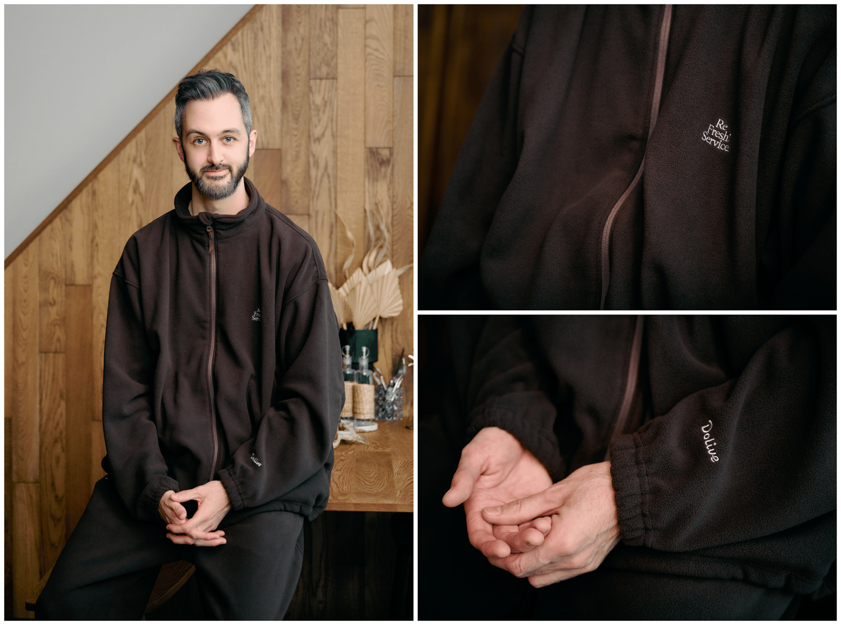 南さんのサウナ愛から生まれた、全てのサウナ好きに向けたプロダクト「リフレッシュサービス」で展開しているセットアップのフリーストラックスーツ。左袖にドライブのロゴをあしらいました。