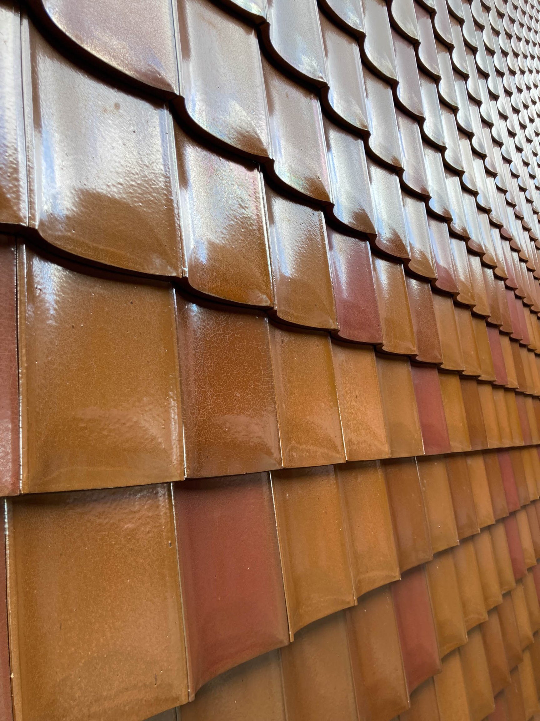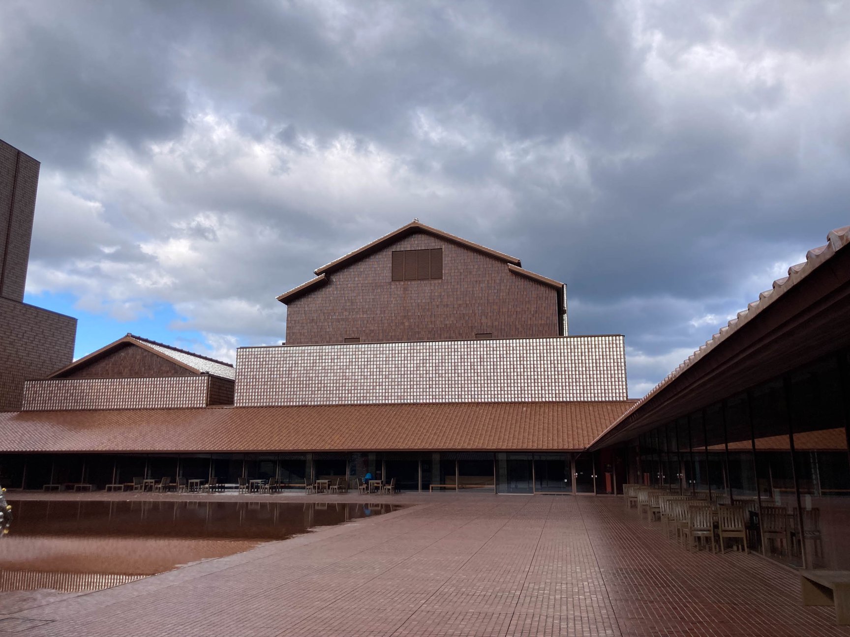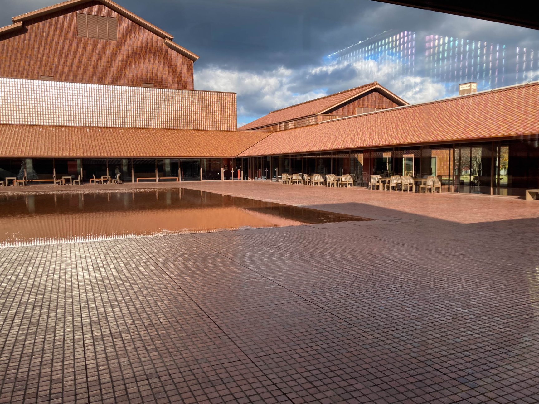 マスコスホテルは「島根県立石見美術館」と「島根県立いわみ芸術劇場」の複合施設「グラントワ」までは徒歩20分程度なので、散歩ついでに足を伸ばすのもおすすめ。島根県石見地方で生産されている赤い色が特徴の伝統的な瓦「石州瓦」が屋根瓦12万枚、壁瓦16万枚の計28万枚施された建築は圧巻です。グラントワに限らず、石見の住宅の多くにはこの石州瓦が使われているのも印象的でした。2月24日までは石岡瑛子さんの展覧会が開かれています。