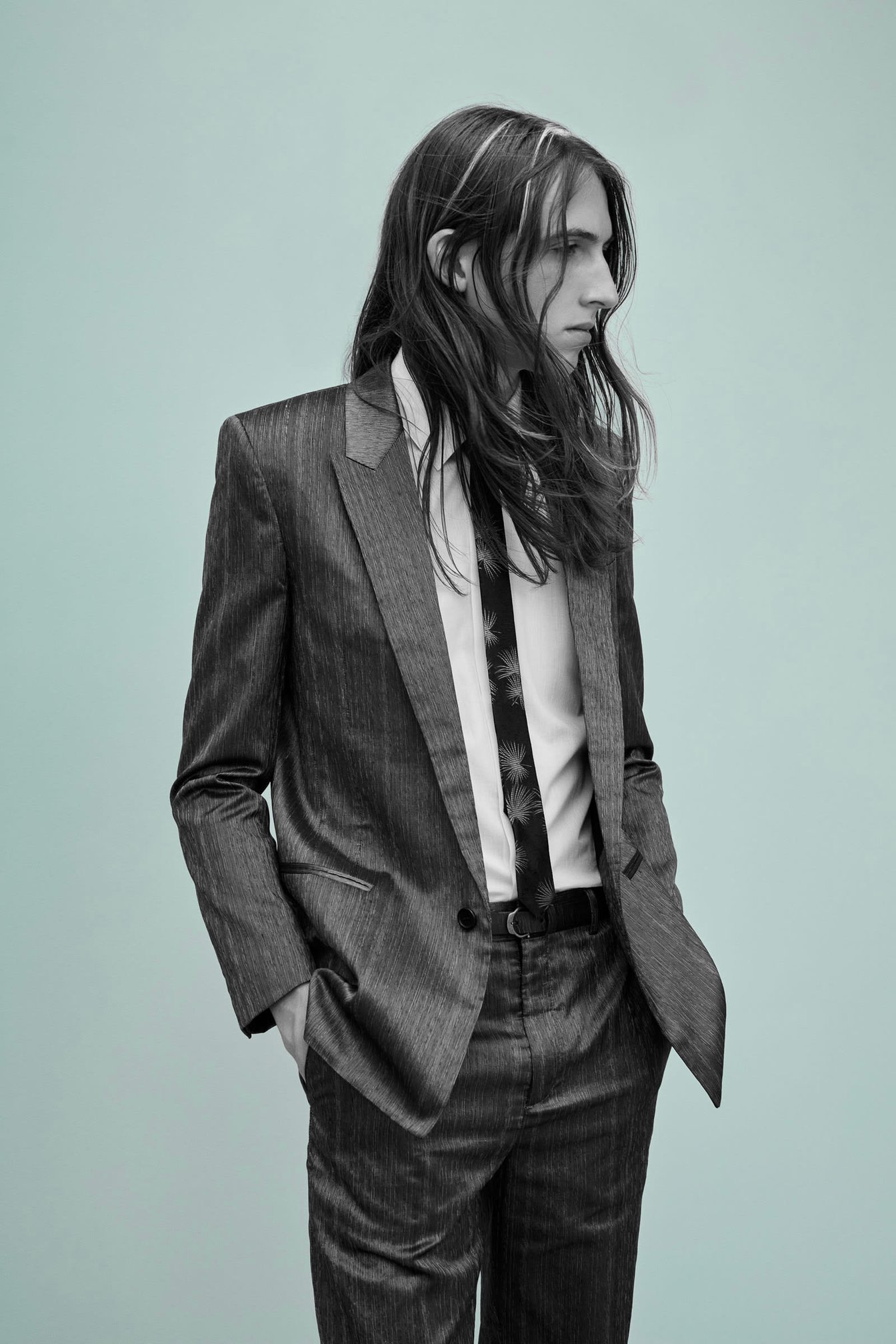 4月10日に行われた映画「砕け散るところを見せてあげる」の公開記念舞台挨拶に登壇した中川大志さん。「サンローラン(SAINT LAURENT)」の2021年春夏メンズコレクションから、光沢のあるグレーのスーツを着用しました。