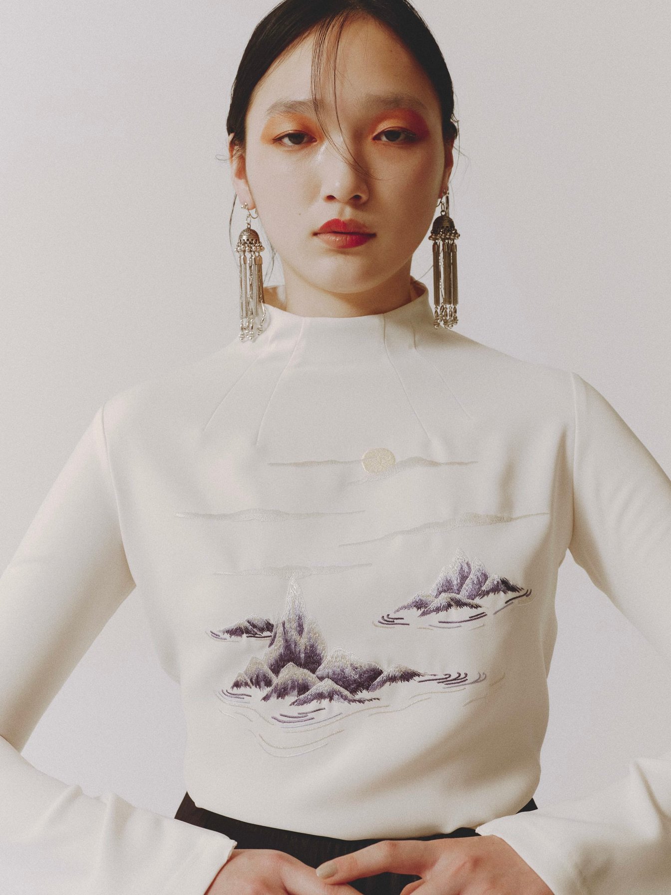 4月25日放送の「ボクらの時代」にあいみょんさんが登場。着用したトップスは、2021年秋冬シーズンにデビューするブランド「タナカ ダイスケ(tanakadaisuke)」のもの。桃源郷の水辺の景色を刺繍で表現しています。