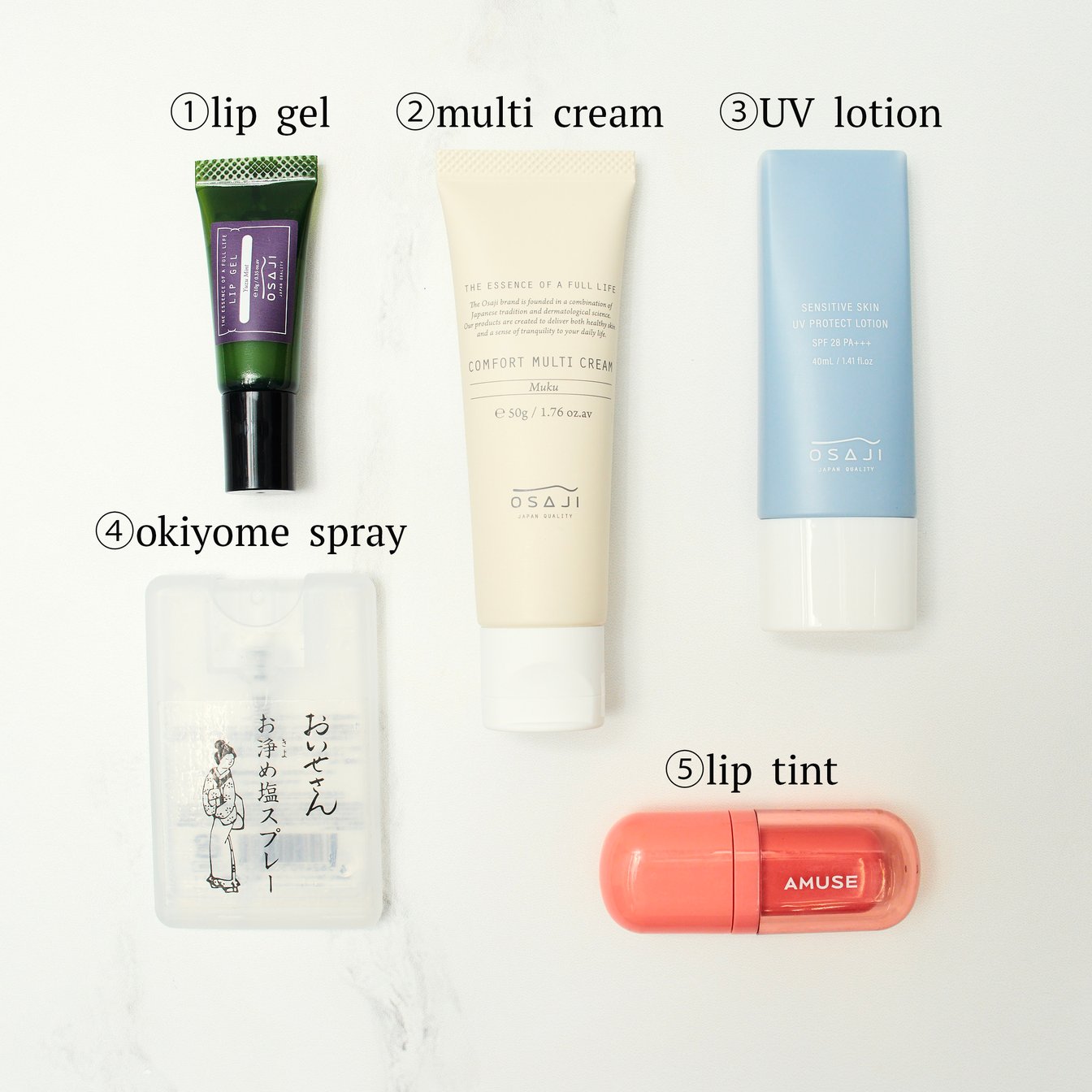 第2回は、「オサジ(OSAJI)」のPR担当 穂積さん。ポーチの中には、韓国コスメ好きの穂積さんならではのリップをはじめ、日焼け止めなど、外出先でも抜かりなくケアができるアイテムが勢揃いしています。