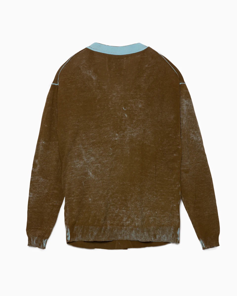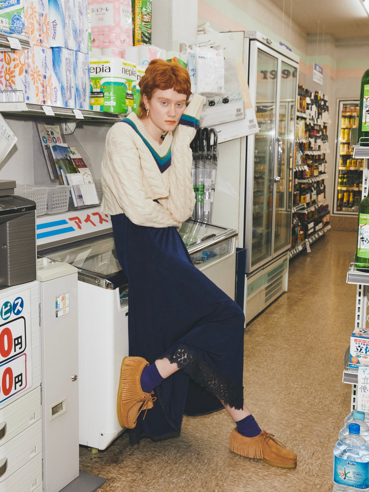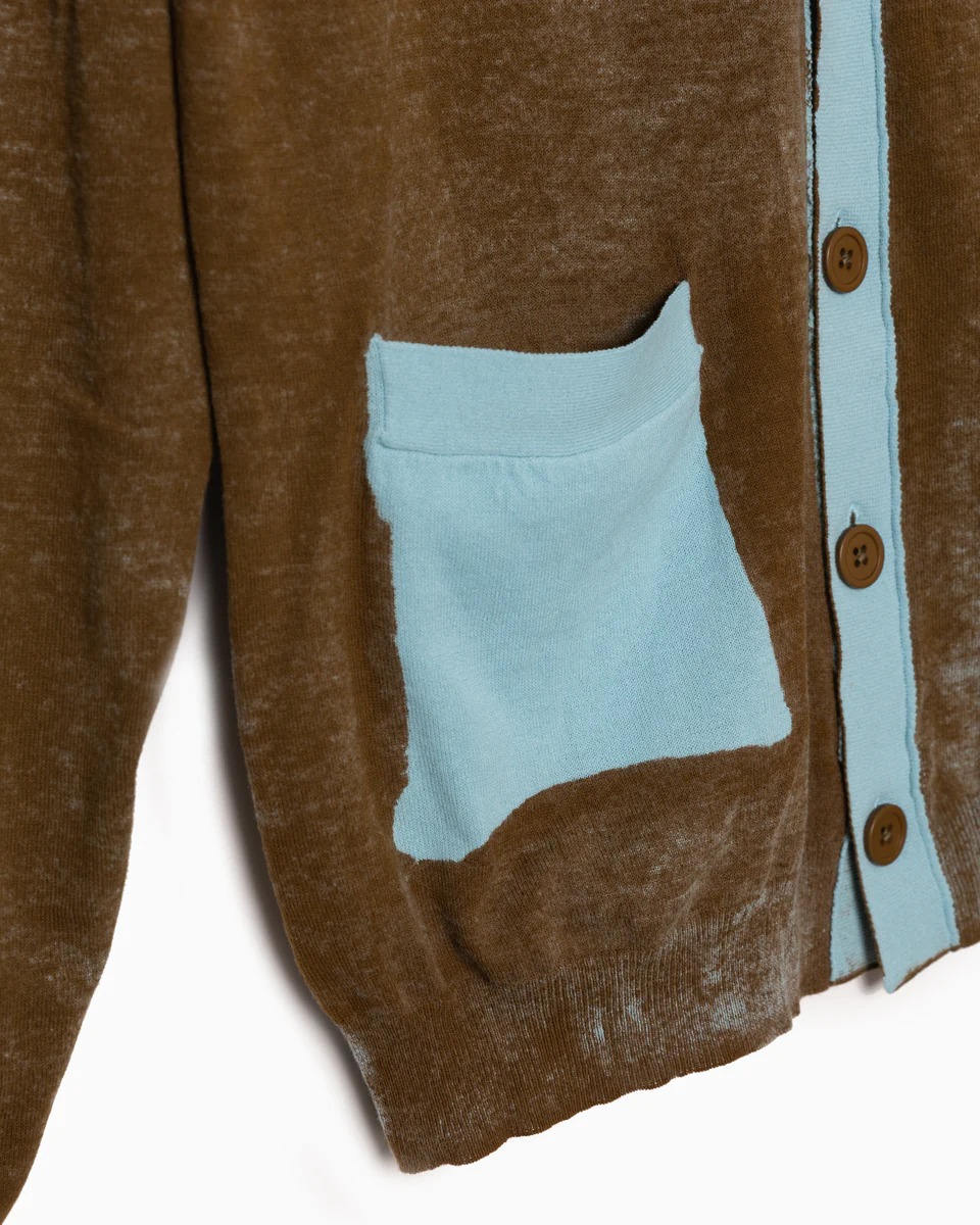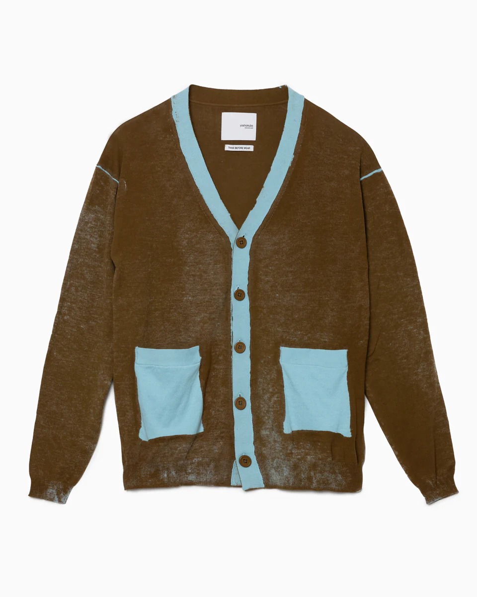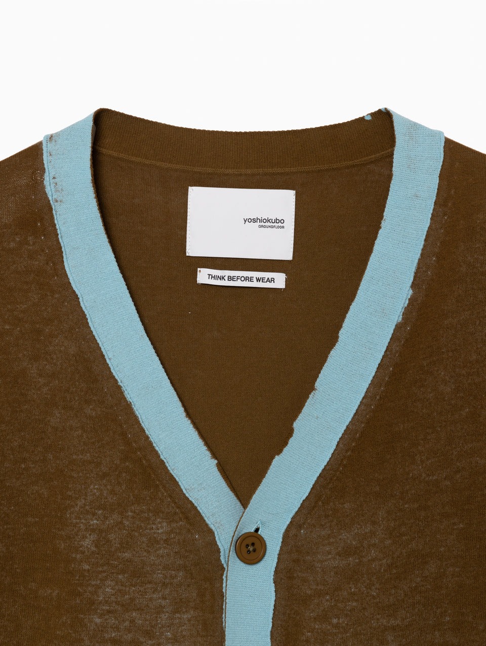 デザイナーも今季のイチオシだと太鼓判を押す「ヨシオクボ(yoshiokubo)」のニットカーディガン。編み立てた後に生地の裏側からプリント加工を施すことで特有の色ムラを生み出しています。手書きで施したようなポケットやセンターラインのバイカラーがキャッチー。暖かい日も重宝する透け感ある生地なので、カットソーと合わせた軽やかな着こなしを楽しんでみて。
