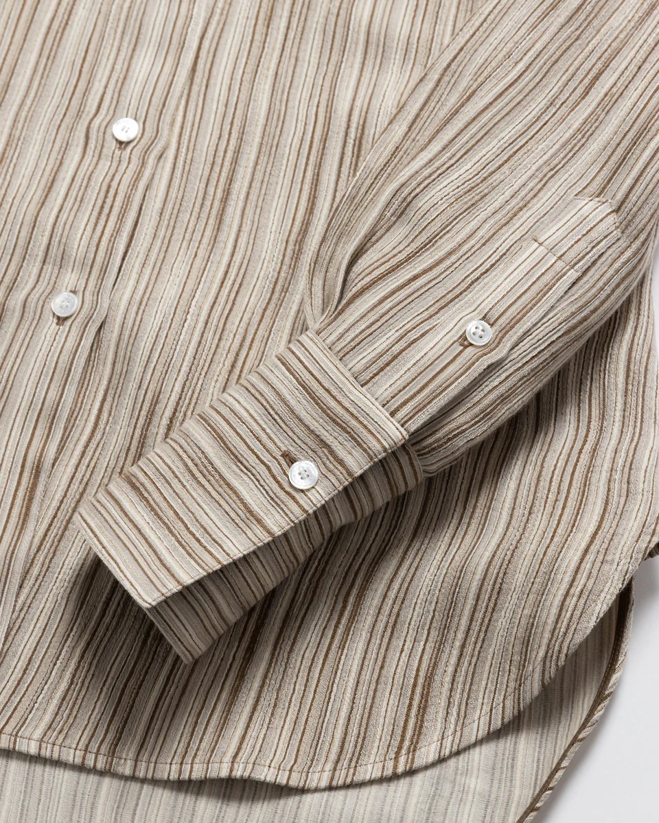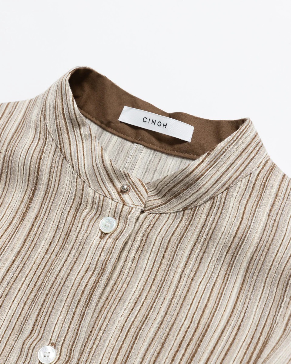 「チノ(CINOH)」のスタンドカラーシャツ。立体感のある生地でストライプ柄が表現されたアイテムです。シルク混のしなやかで肌触りがよい着心地が魅力。着丈が長めなので、Tシャツの上にさらっと羽織っても◎。