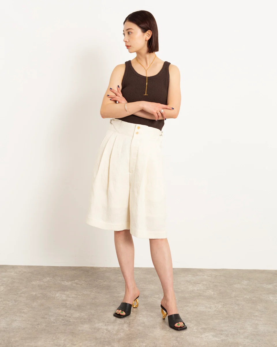 「ポステレガント(POSTELEGANT)」のシンプルなタンクトップは、深みのあるブラウンが品の良さを演出。凹凸のある立体的な表情が特徴のブークレー糸が使われており、首元の太めのリブがアクセントになっています。ワイドショーツと合わせたメリハリのあるスタイルが◎。