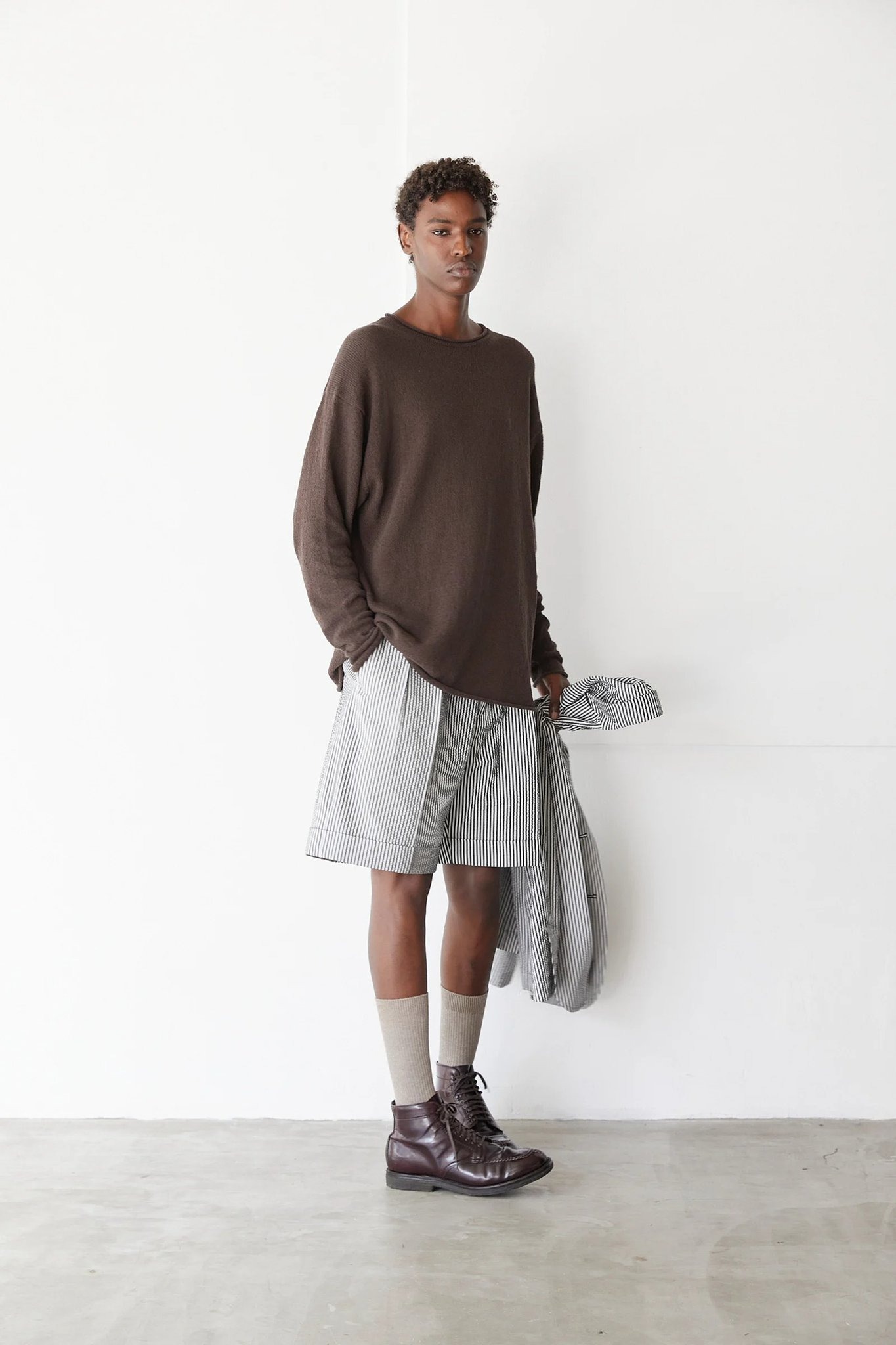 「ポステレガント(POSTELEGANT)」のサマーニットは、シンプルなデザインに首元や袖口のロールがさりげないアクセントになった1枚。メリハリをつけるためにショートパンツやカッチリとしたシューズと合わせて、抜け感のあるアーバンなスタイリングを楽しんでみては?セットアップで穿けるショーツも販売中。