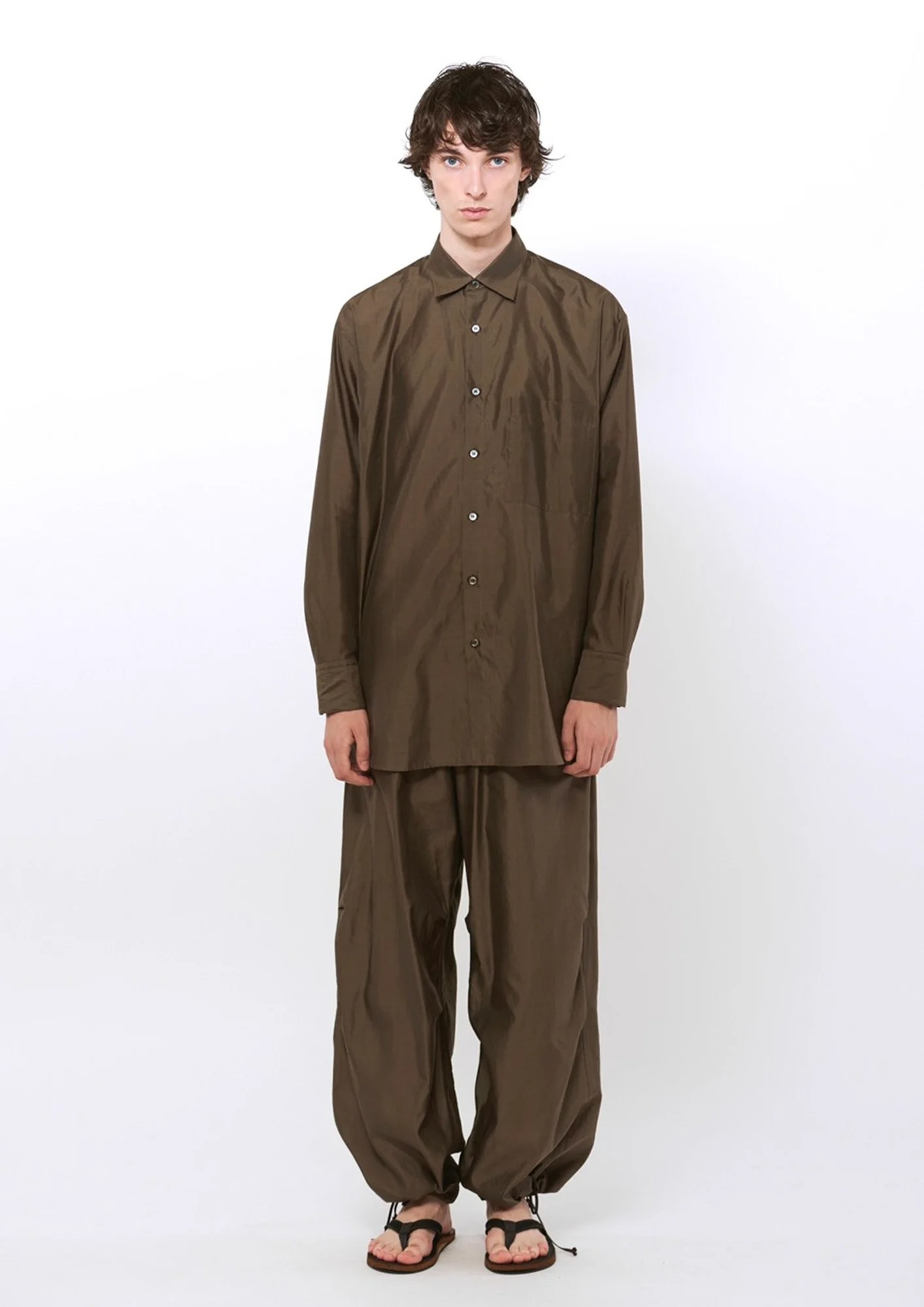 シルクを贅沢に使用した上品なシャツは「アンスクリア(INSCRIRE)」から。シンプルなデザインに仕上げることによって、生地の柔らかさや光沢感を感じる1着です。ルックのように同素材のパンツと合わせてセットアップ感覚できたり、デニムと合わせた上品カジュアルな着こなしがおすすめ。大きめのサイズ感なので上質な生地の揺らぎを楽しみたい1着です。