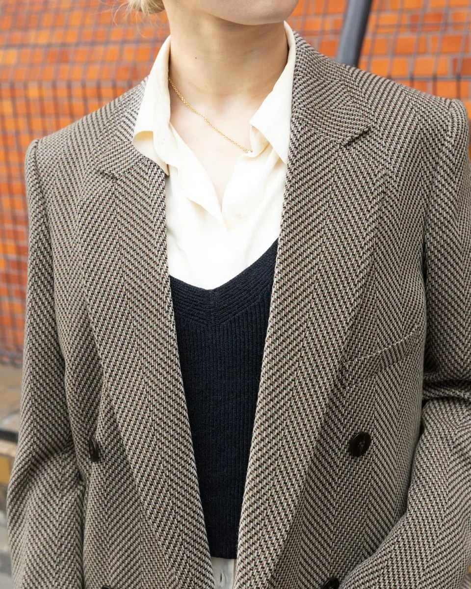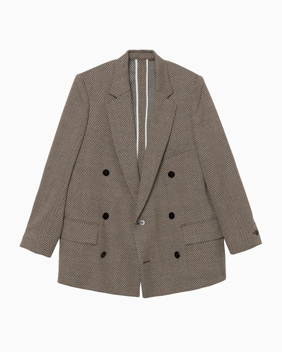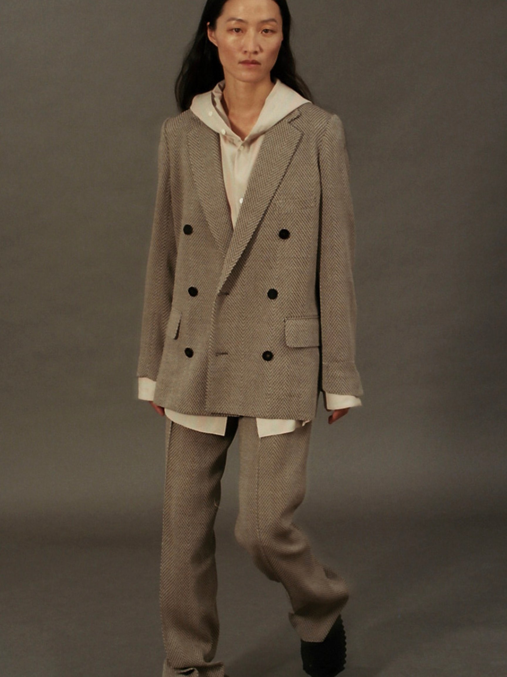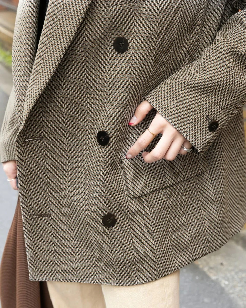 「オーバーコート(OVERCOAT)」のストレートパンツは、レトロなヘリンボーン柄が魅力。前側のセンターにピンタックが取られており、布のドレープ感が綺麗に見えるように設計されています。共地のジャケットとセットアップで着用するするとよりクラシックなスタイルが完成します。